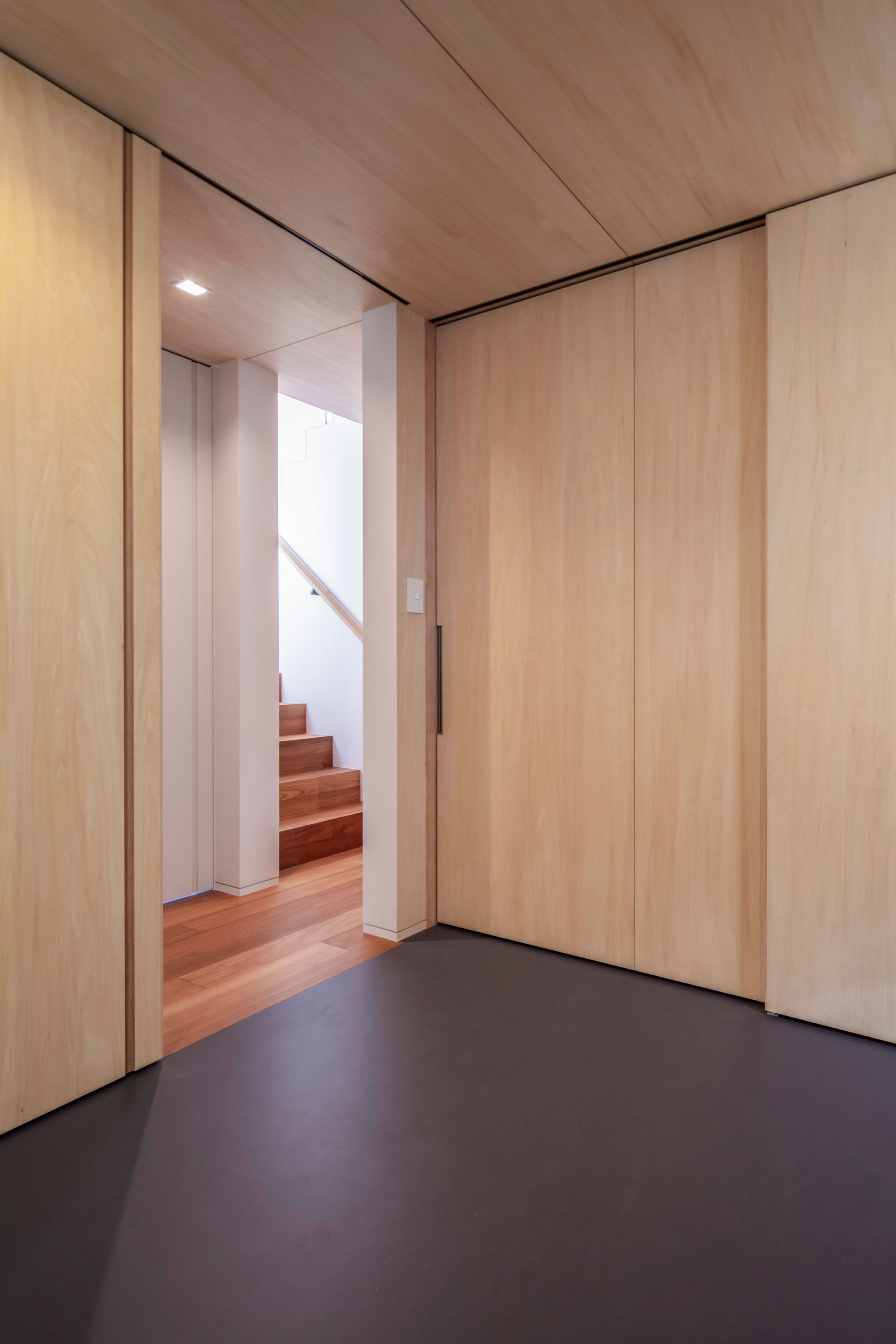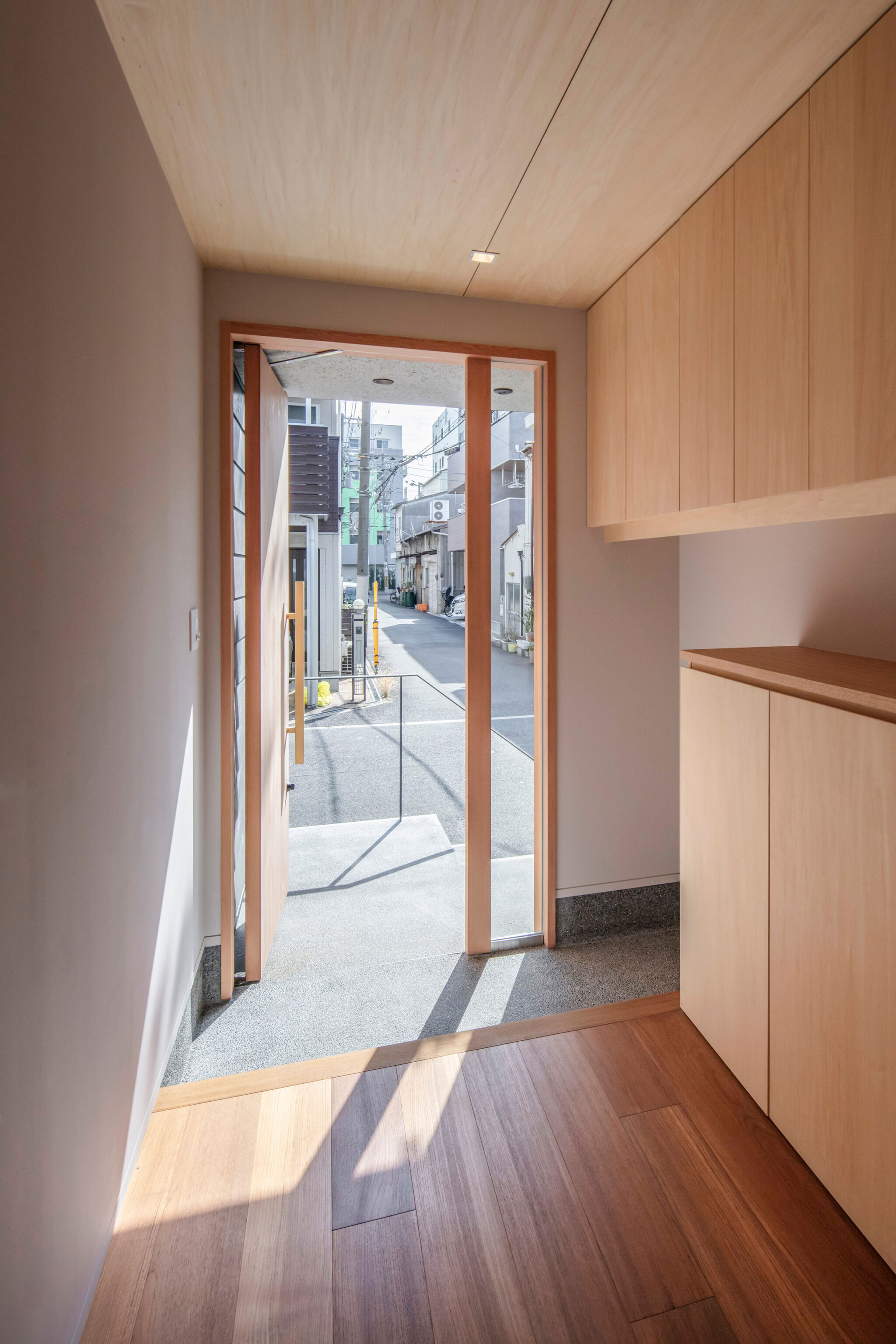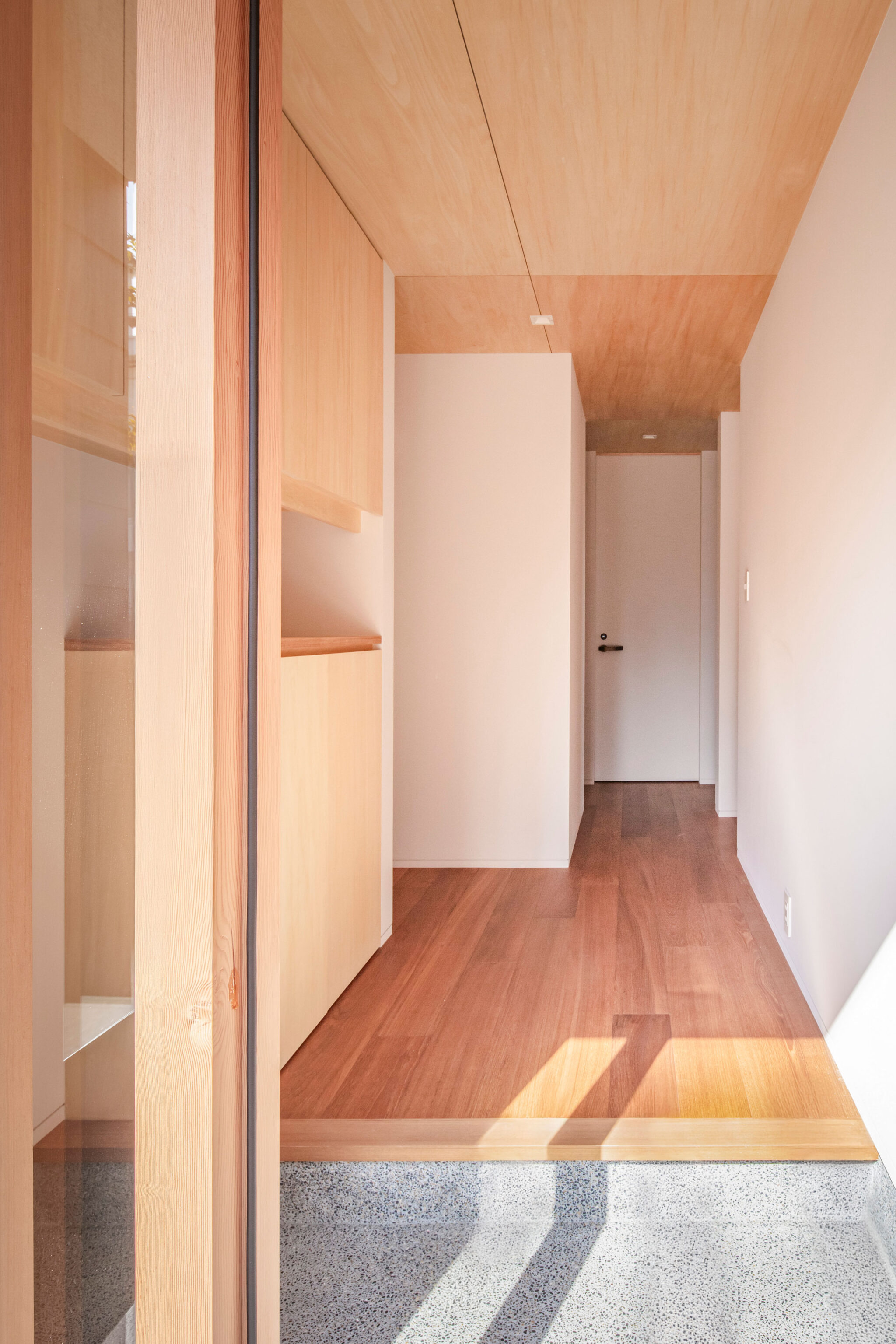 小林敬政による、大阪市の「K邸」。施主家族が40年以上暮らした住まいの建替。既存を建物を超えた“記憶の器”と捉え、刷新ではなく“継承”する設計を志向。旧家屋の間取りを参照して“再構築”した平面構成で“空間体験”を通して記憶を喚起する 1階、ホールから玄関を見る。 photo©多田ユウコ写真事務所
