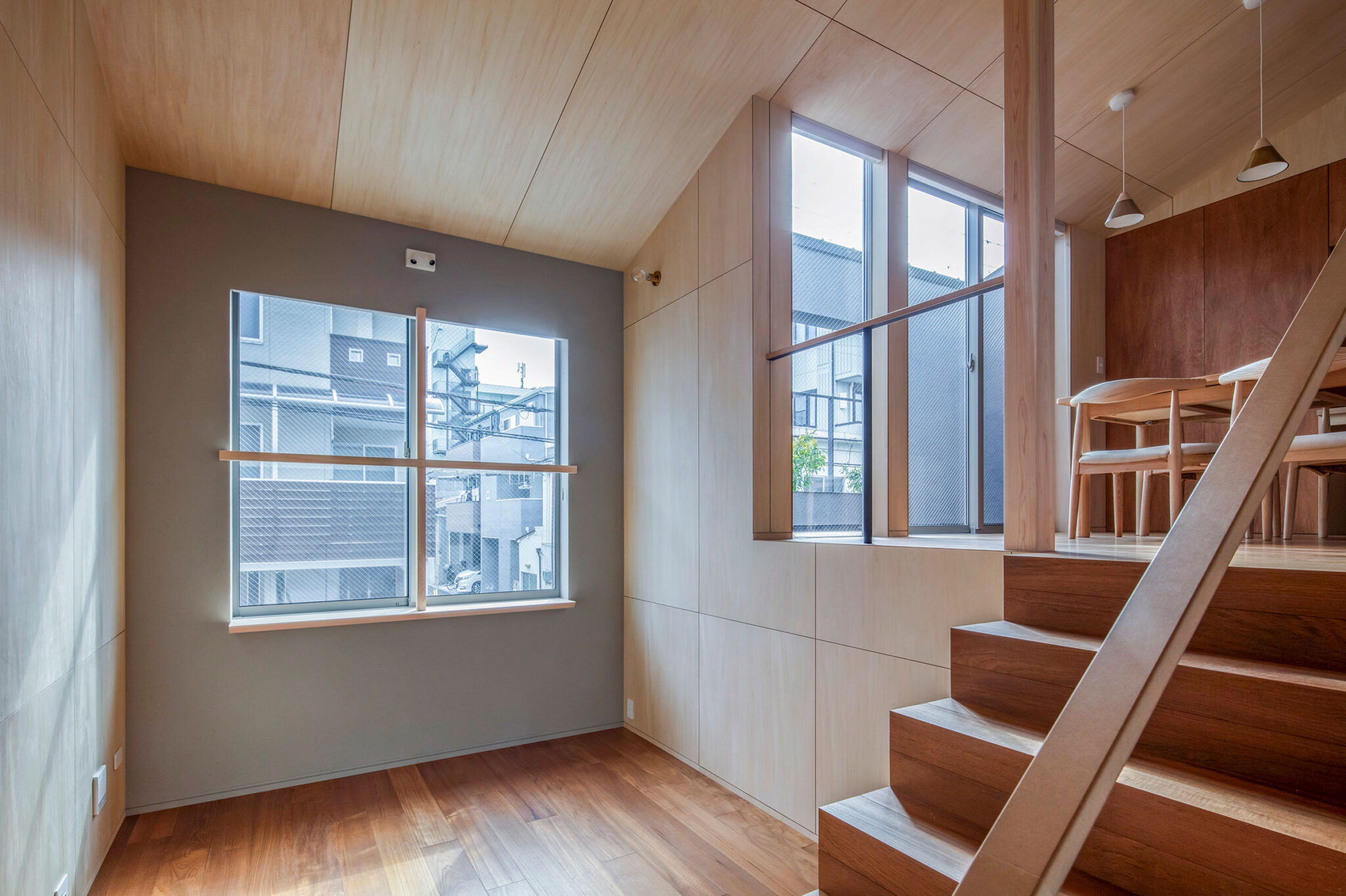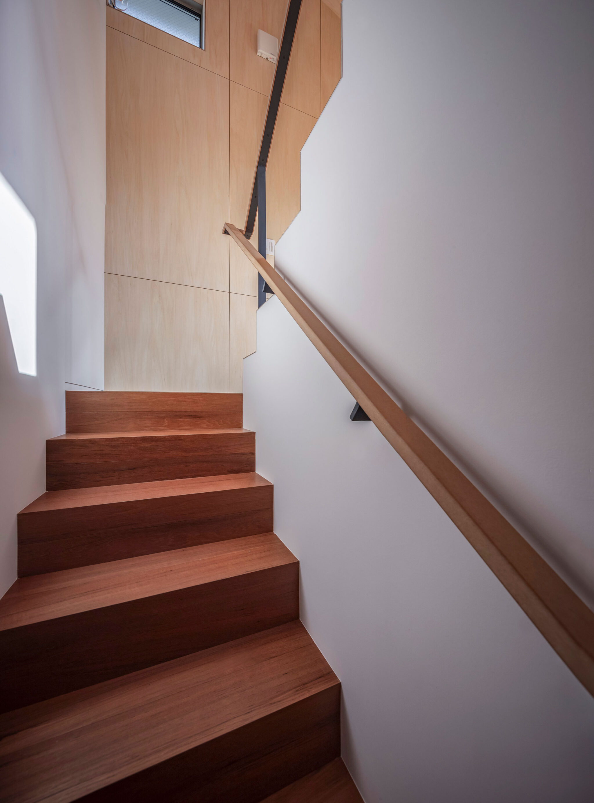 小林敬政による、大阪市の「K邸」。施主家族が40年以上暮らした住まいの建替。既存を建物を超えた“記憶の器”と捉え、刷新ではなく“継承”する設計を志向。旧家屋の間取りを参照して“再構築”した平面構成で“空間体験”を通して記憶を喚起する 1階から2階への階段 photo©多田ユウコ写真事務所