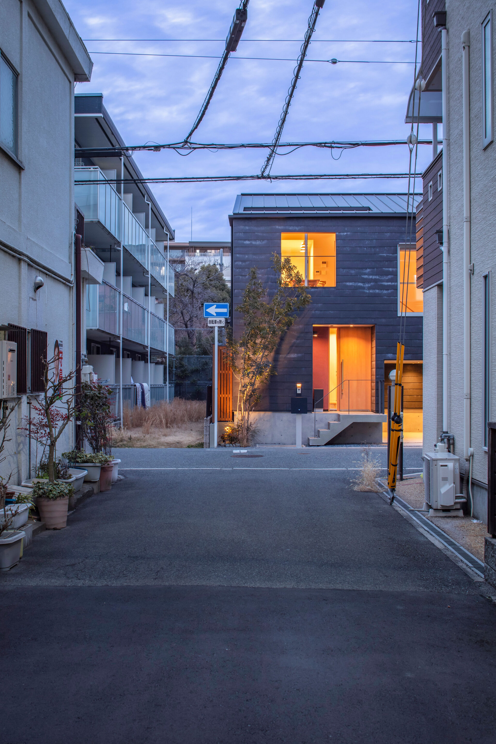 小林敬政による、大阪市の「K邸」。施主家族が40年以上暮らした住まいの建替。既存を建物を超えた“記憶の器”と捉え、刷新ではなく“継承”する設計を志向。旧家屋の間取りを参照して“再構築”した平面構成で“空間体験”を通して記憶を喚起する 外観、南側奥の道路より見る。夕景 photo©多田ユウコ写真事務所