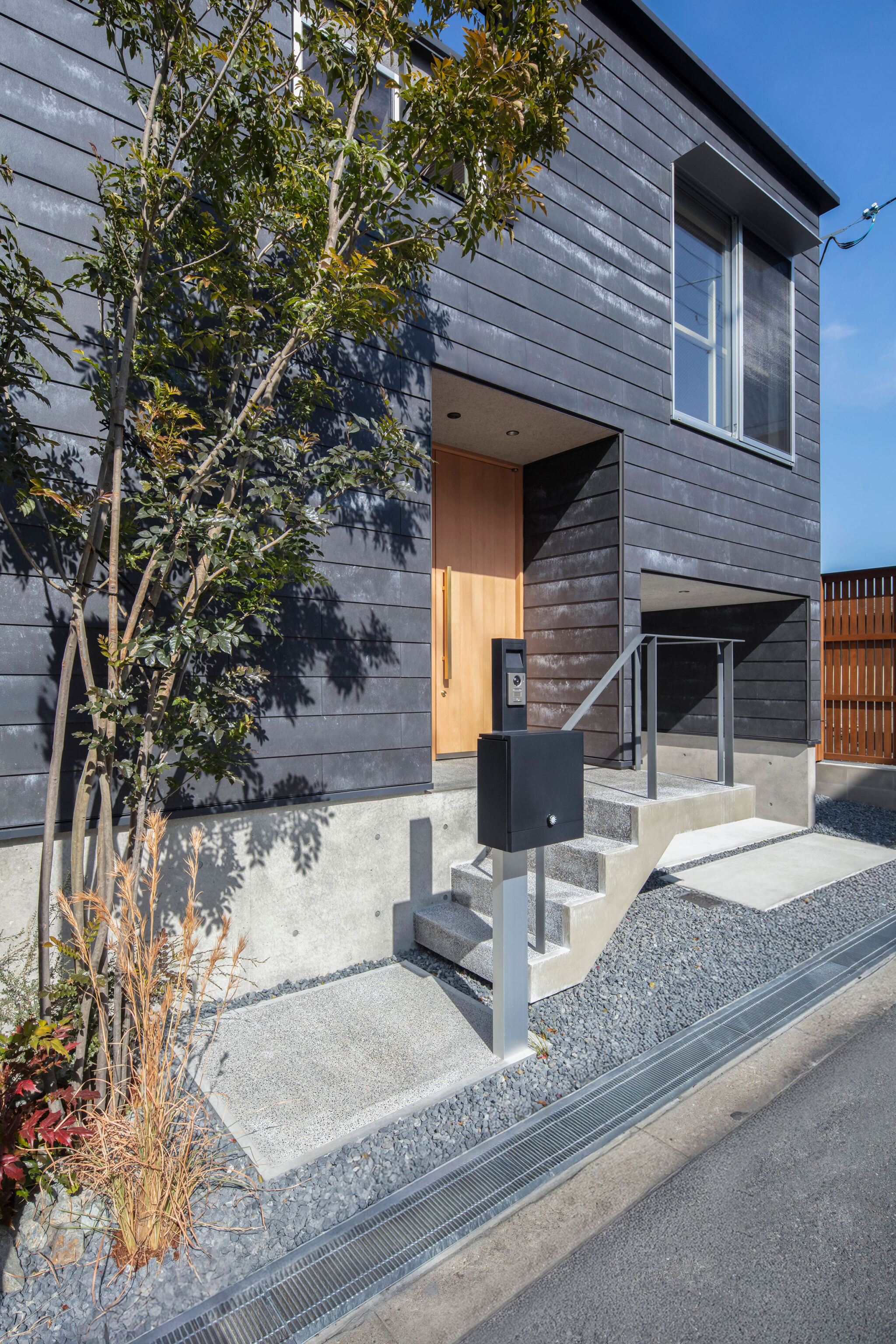 小林敬政による、大阪市の「K邸」。施主家族が40年以上暮らした住まいの建替。既存を建物を超えた“記憶の器”と捉え、刷新ではなく“継承”する設計を志向。旧家屋の間取りを参照して“再構築”した平面構成で“空間体験”を通して記憶を喚起する 外観、南側の道路よりポーチを見る。 photo©多田ユウコ写真事務所
