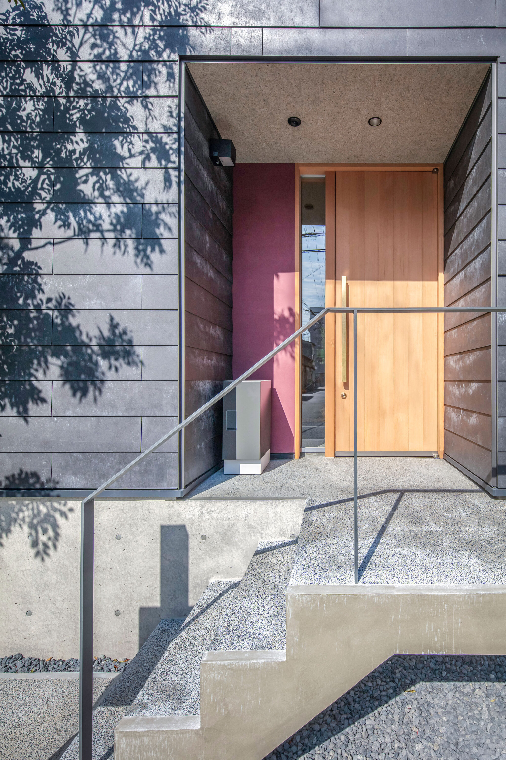 小林敬政による、大阪市の「K邸」。施主家族が40年以上暮らした住まいの建替。既存を建物を超えた“記憶の器”と捉え、刷新ではなく“継承”する設計を志向。旧家屋の間取りを参照して“再構築”した平面構成で“空間体験”を通して記憶を喚起する ポーチと玄関ドア photo©多田ユウコ写真事務所
