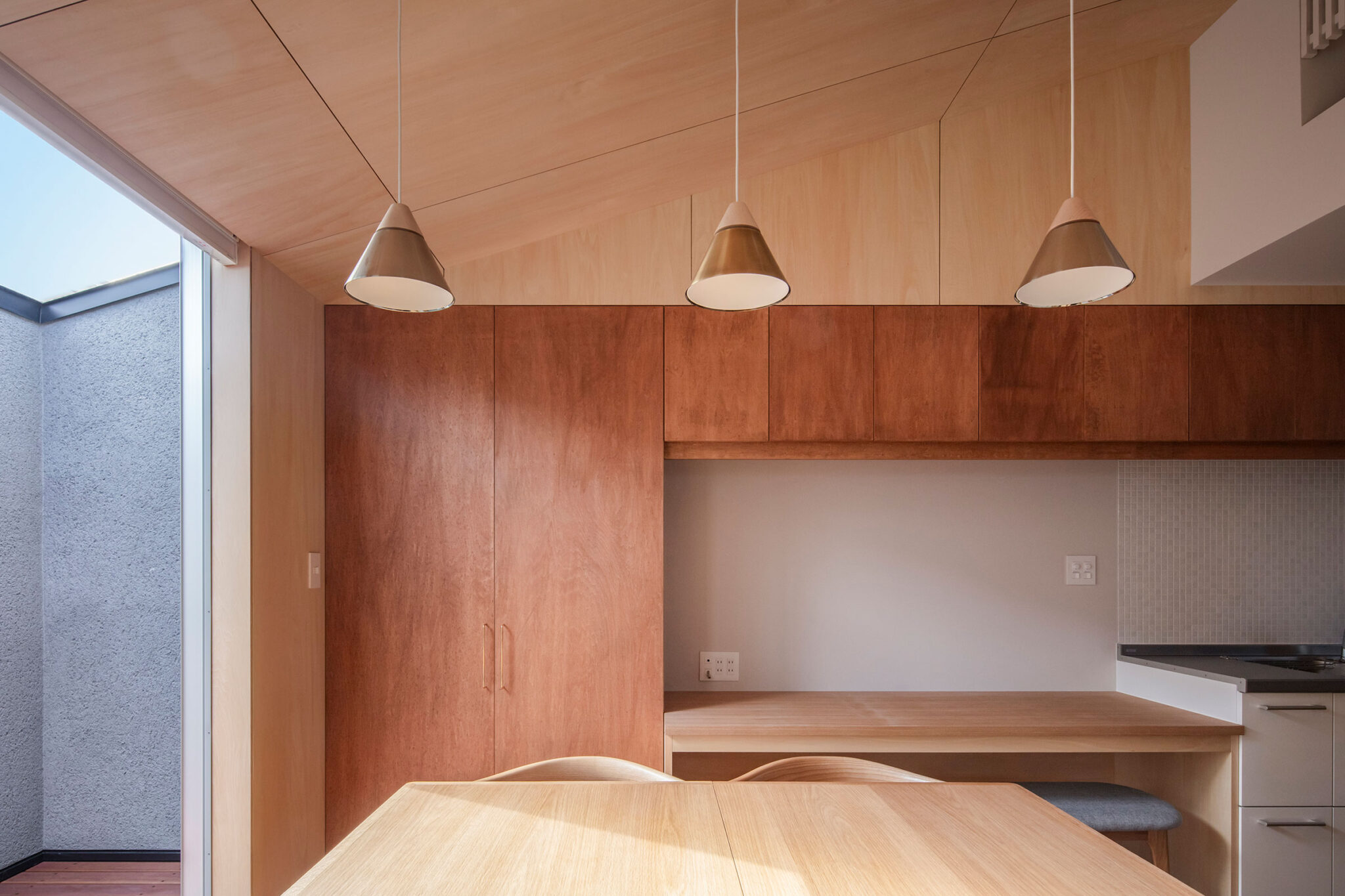 小林敬政による、大阪市の「K邸」。施主家族が40年以上暮らした住まいの建替。既存を建物を超えた“記憶の器”と捉え、刷新ではなく“継承”する設計を志向。旧家屋の間取りを参照して“再構築”した平面構成で“空間体験”を通して記憶を喚起する 2階、ダイニングからカウンターを見る。 photo©多田ユウコ写真事務所