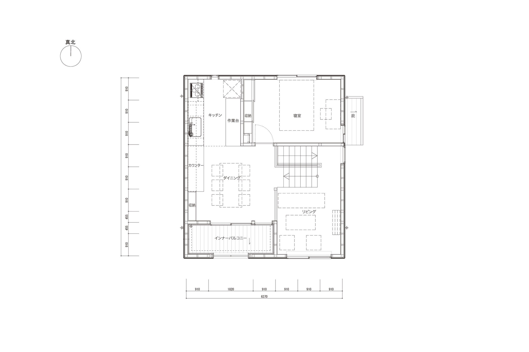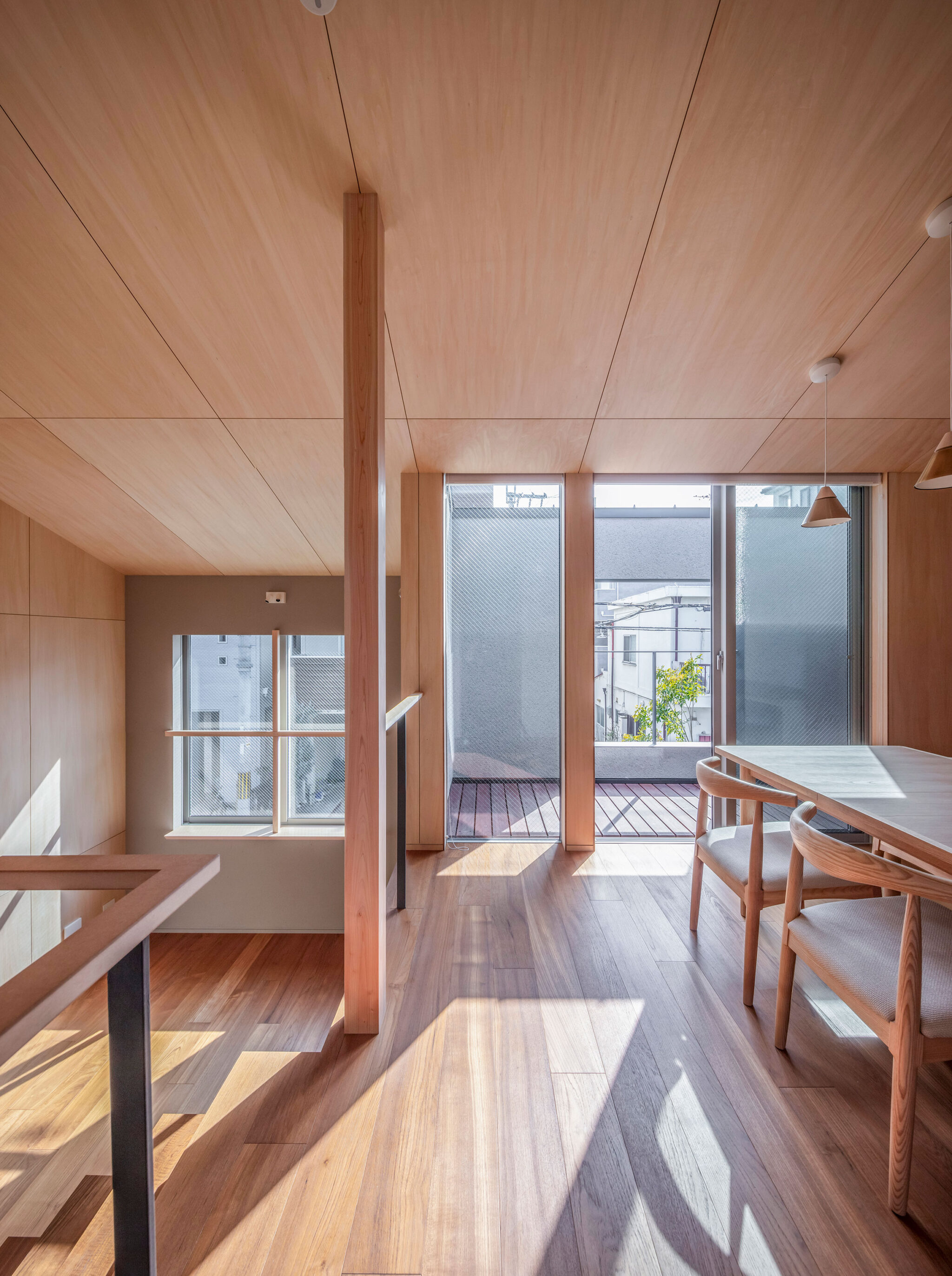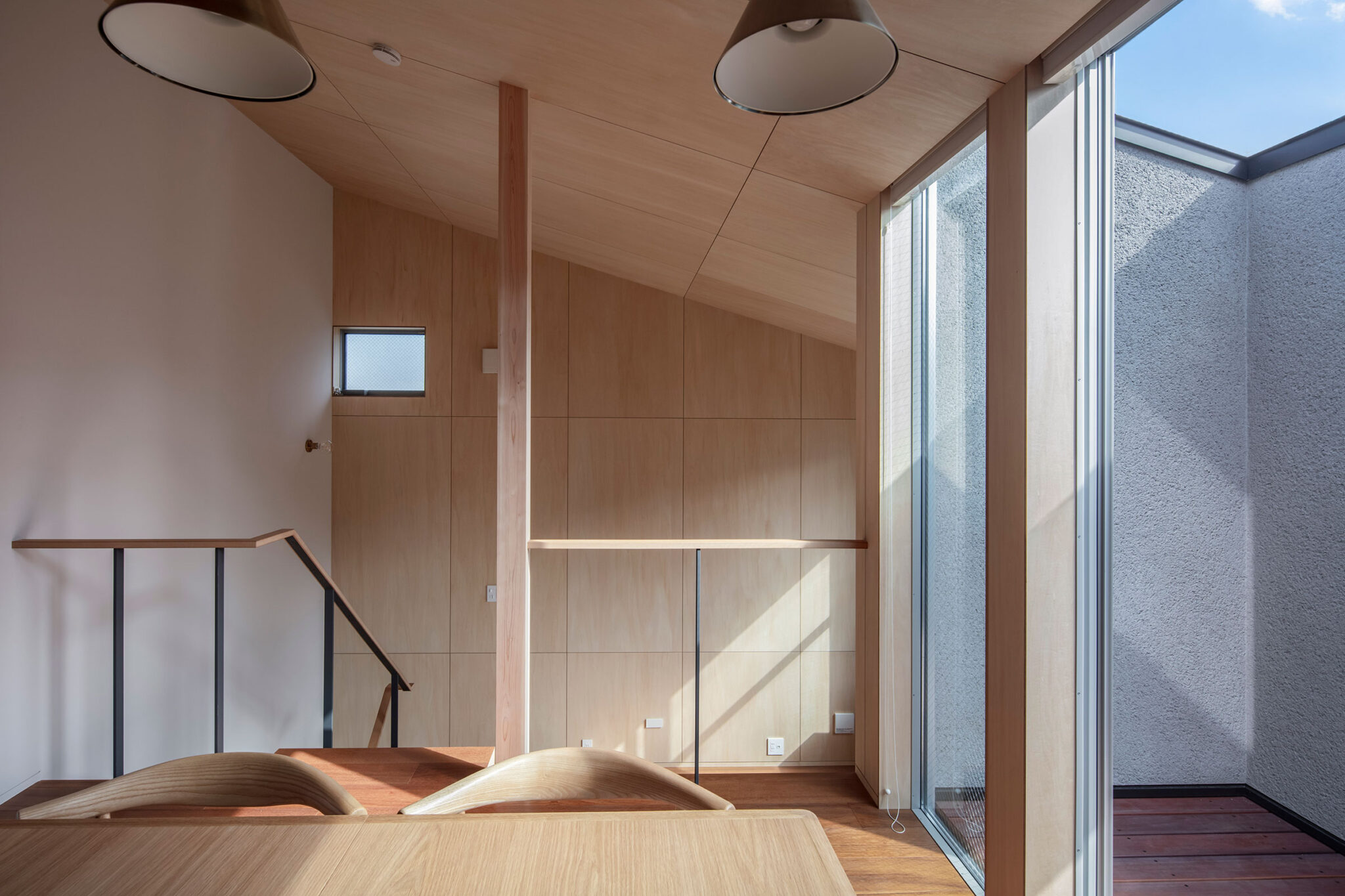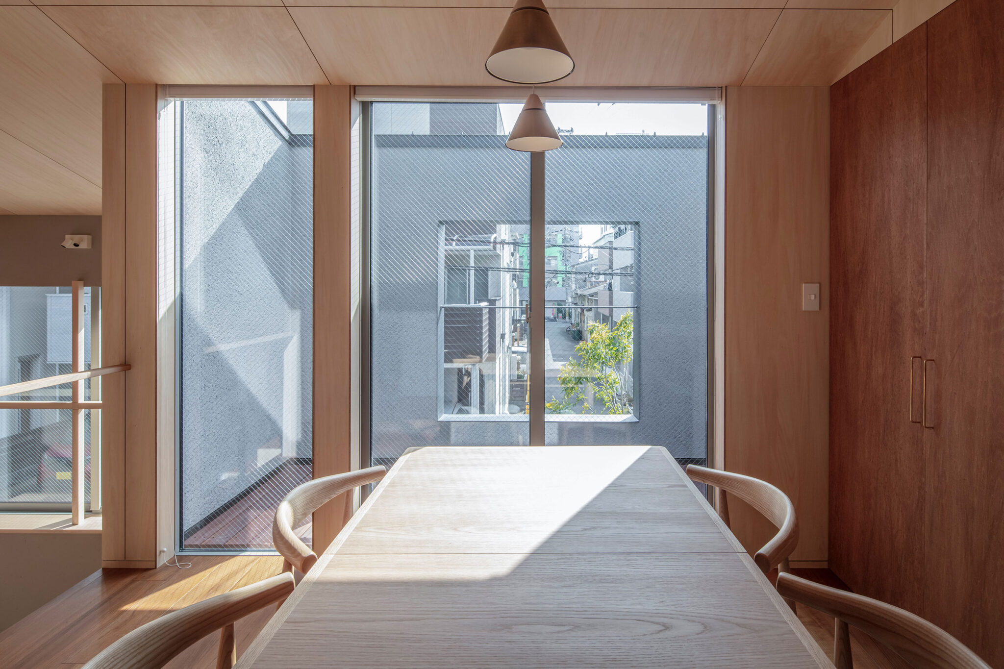 小林敬政による、大阪市の「K邸」。施主家族が40年以上暮らした住まいの建替。既存を建物を超えた“記憶の器”と捉え、刷新ではなく“継承”する設計を志向。旧家屋の間取りを参照して“再構築”した平面構成で“空間体験”を通して記憶を喚起する 2階、ダイニングから開口部越しにインナーバルコニーを見る。 photo©多田ユウコ写真事務所