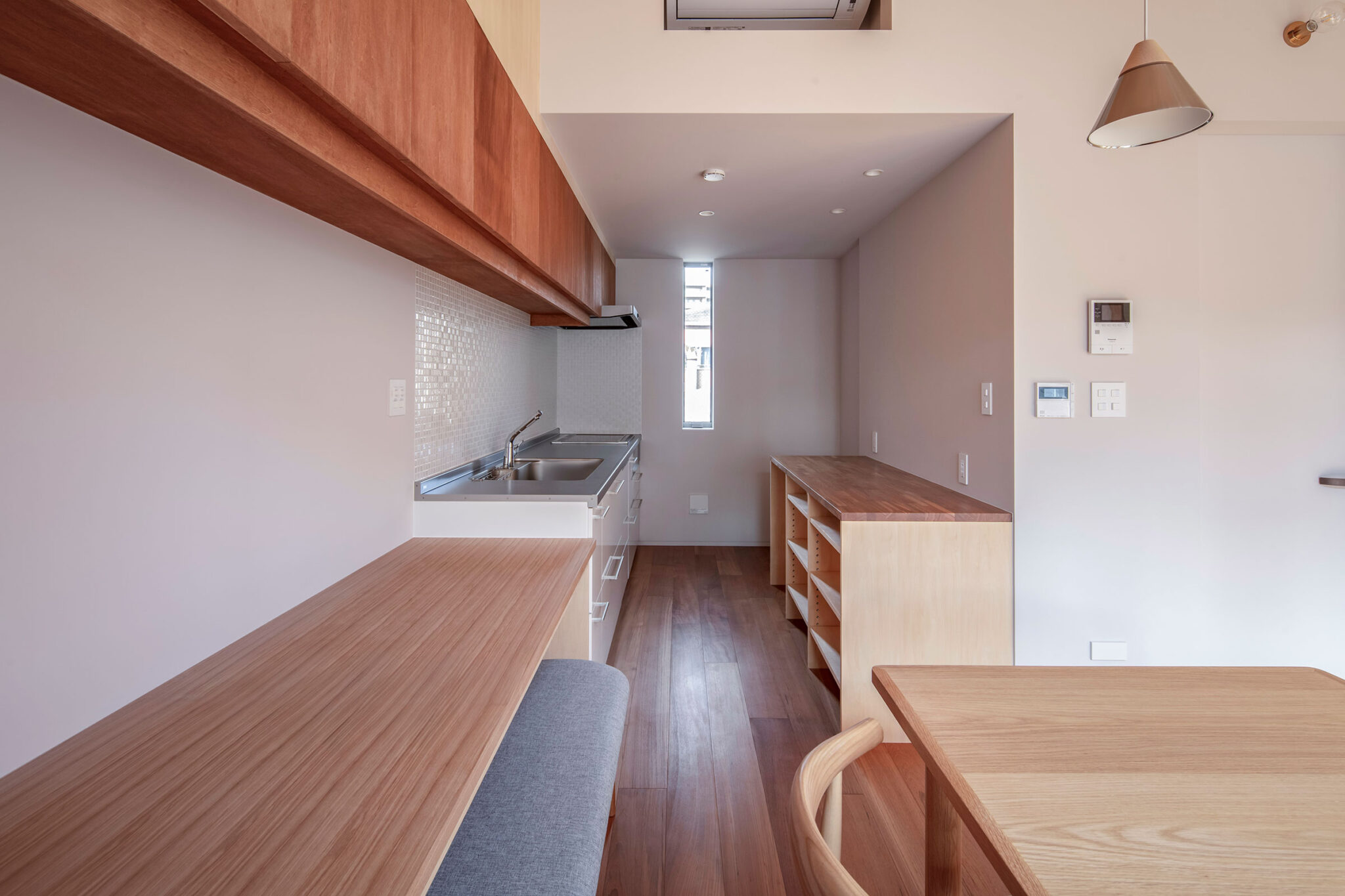 小林敬政による、大阪市の「K邸」。施主家族が40年以上暮らした住まいの建替。既存を建物を超えた“記憶の器”と捉え、刷新ではなく“継承”する設計を志向。旧家屋の間取りを参照して“再構築”した平面構成で“空間体験”を通して記憶を喚起する 2階、ダイニングからキッチンを見る。 photo©多田ユウコ写真事務所