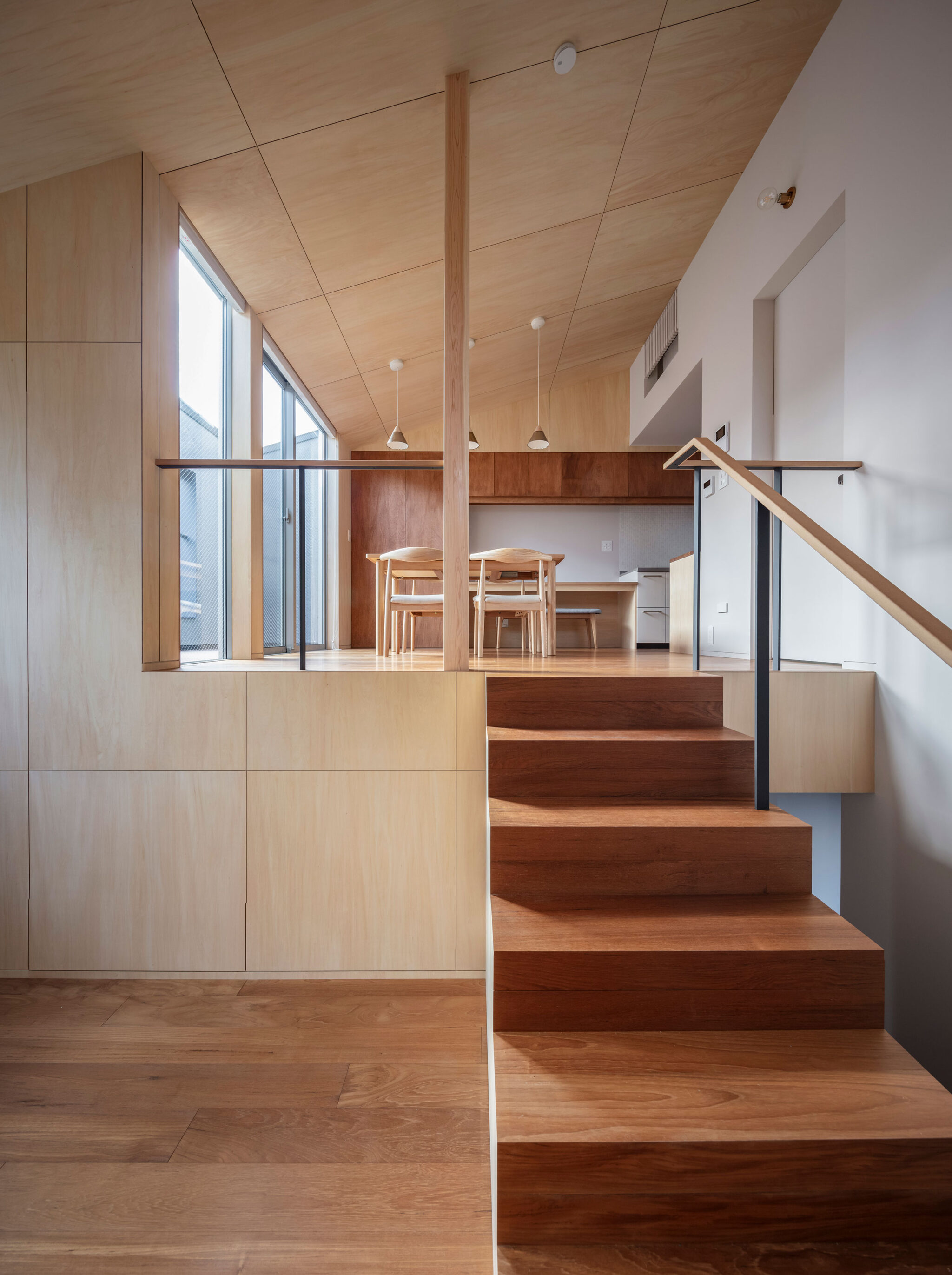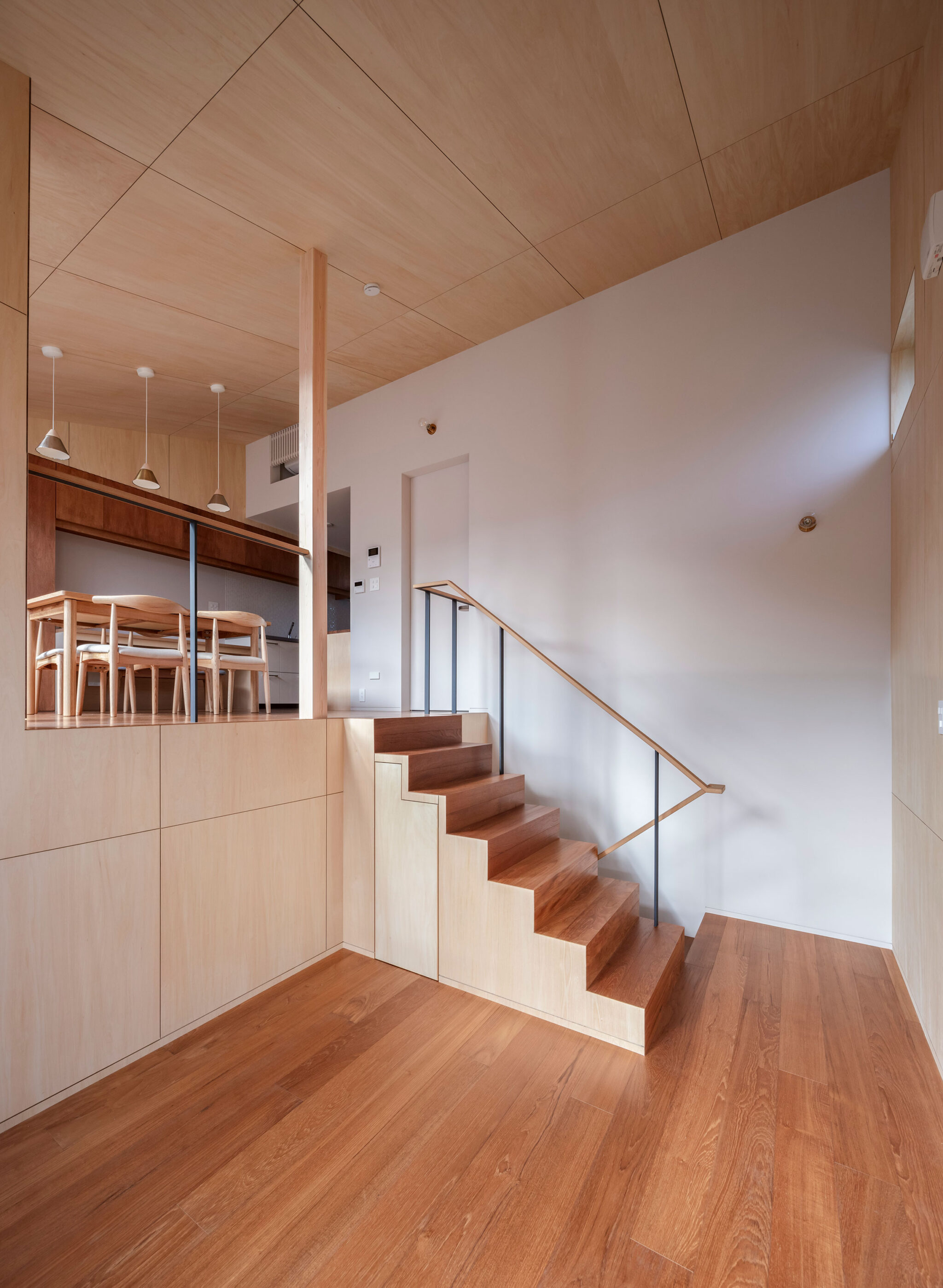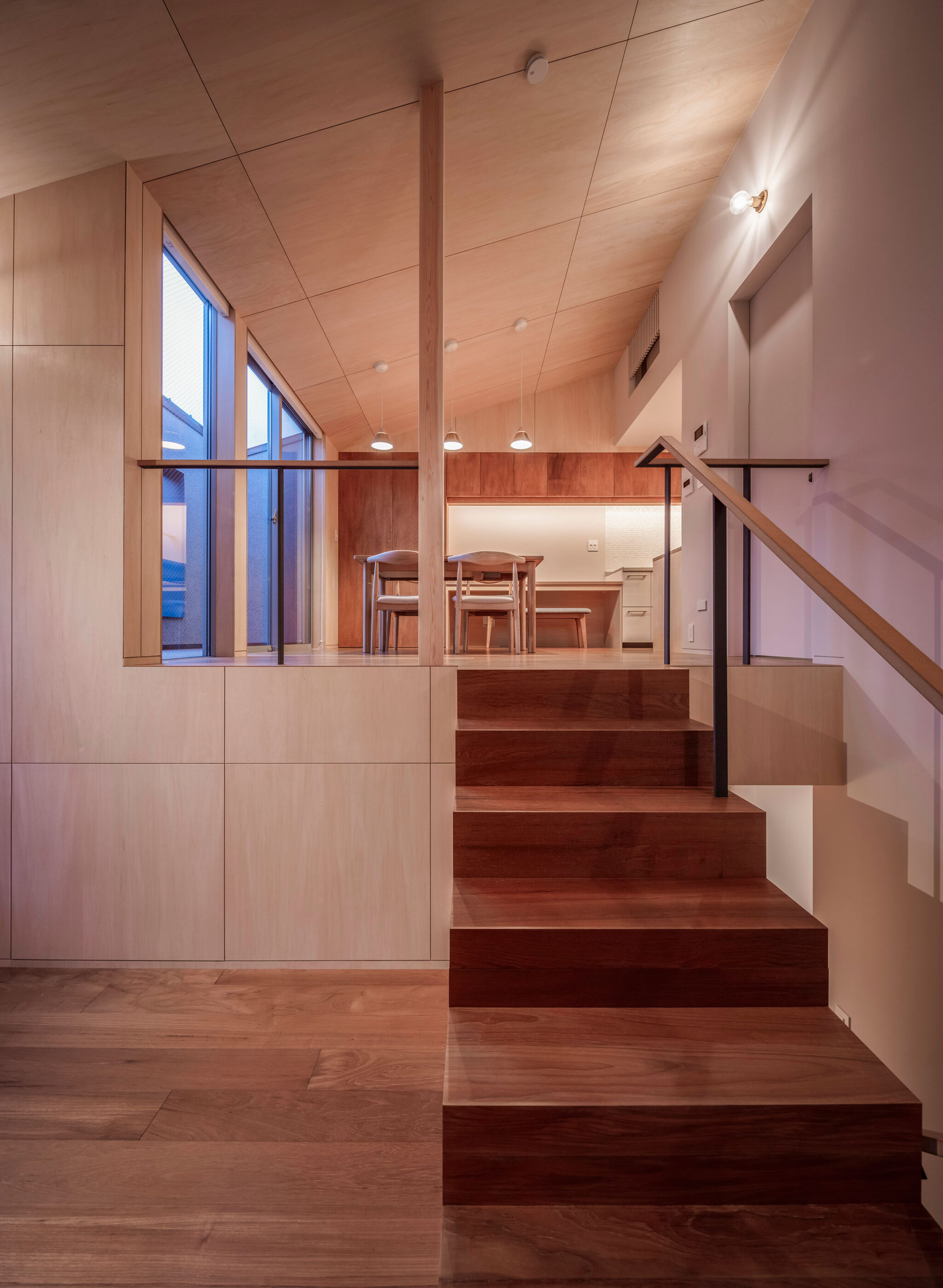 小林敬政による、大阪市の「K邸」。施主家族が40年以上暮らした住まいの建替。既存を建物を超えた“記憶の器”と捉え、刷新ではなく“継承”する設計を志向。旧家屋の間取りを参照して“再構築”した平面構成で“空間体験”を通して記憶を喚起する 2階、リビングからダイニングにつながる階段を見る。 photo©多田ユウコ写真事務所