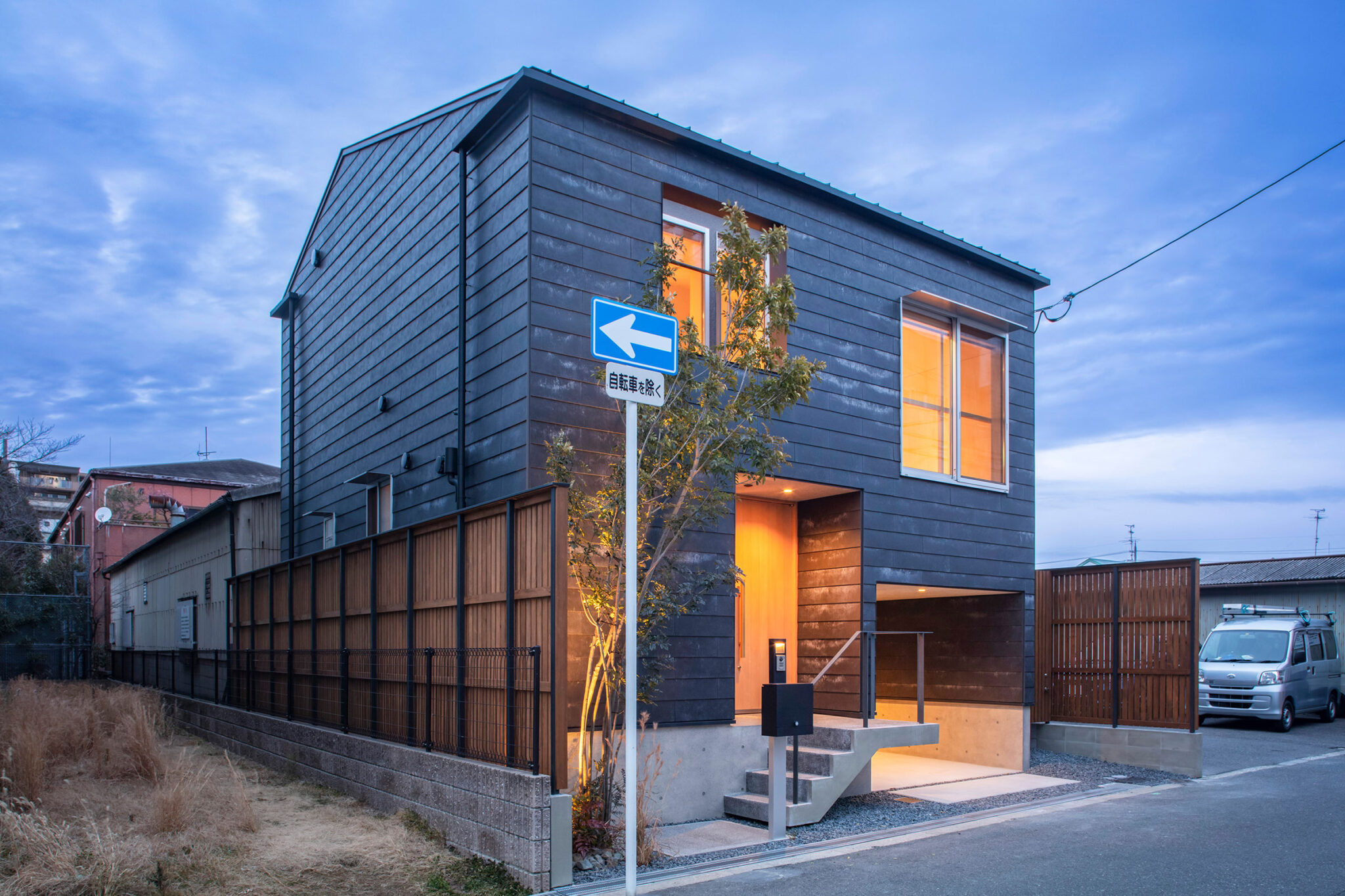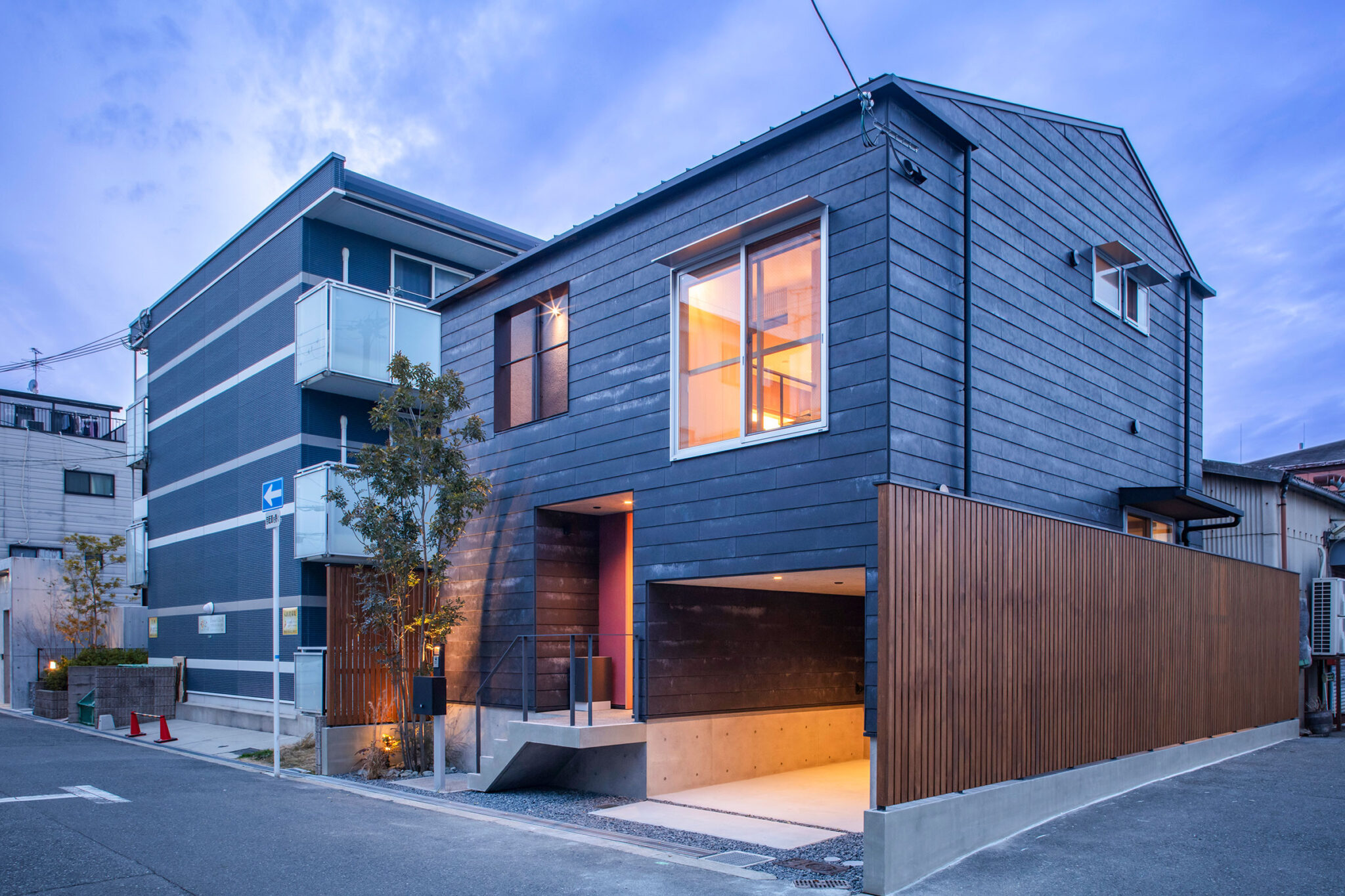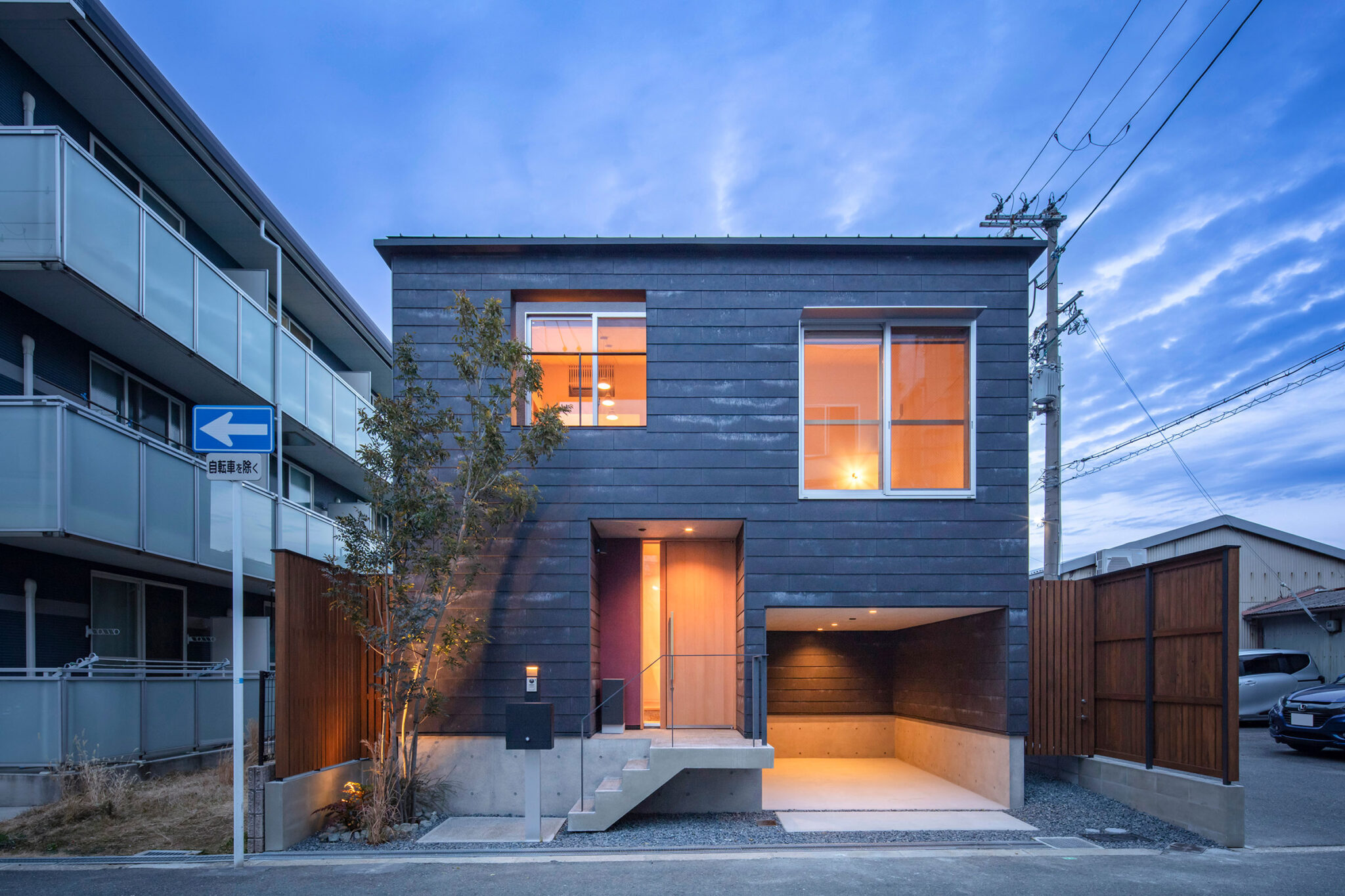 小林敬政による、大阪市の「K邸」。施主家族が40年以上暮らした住まいの建替。既存を建物を超えた“記憶の器”と捉え、刷新ではなく“継承”する設計を志向。旧家屋の間取りを参照して“再構築”した平面構成で“空間体験”を通して記憶を喚起する 外観、南側の道路より見る。夕景 photo©多田ユウコ写真事務所