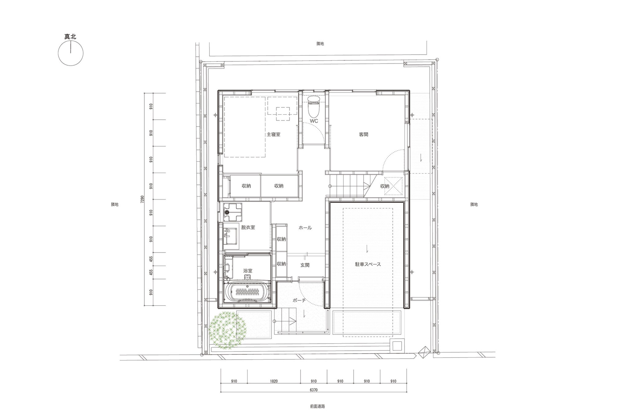 小林敬政による、大阪市の「K邸」。施主家族が40年以上暮らした住まいの建替。既存を建物を超えた“記憶の器”と捉え、刷新ではなく“継承”する設計を志向。旧家屋の間取りを参照して“再構築”した平面構成で“空間体験”を通して記憶を喚起する 1階平面図 image©小林敬政