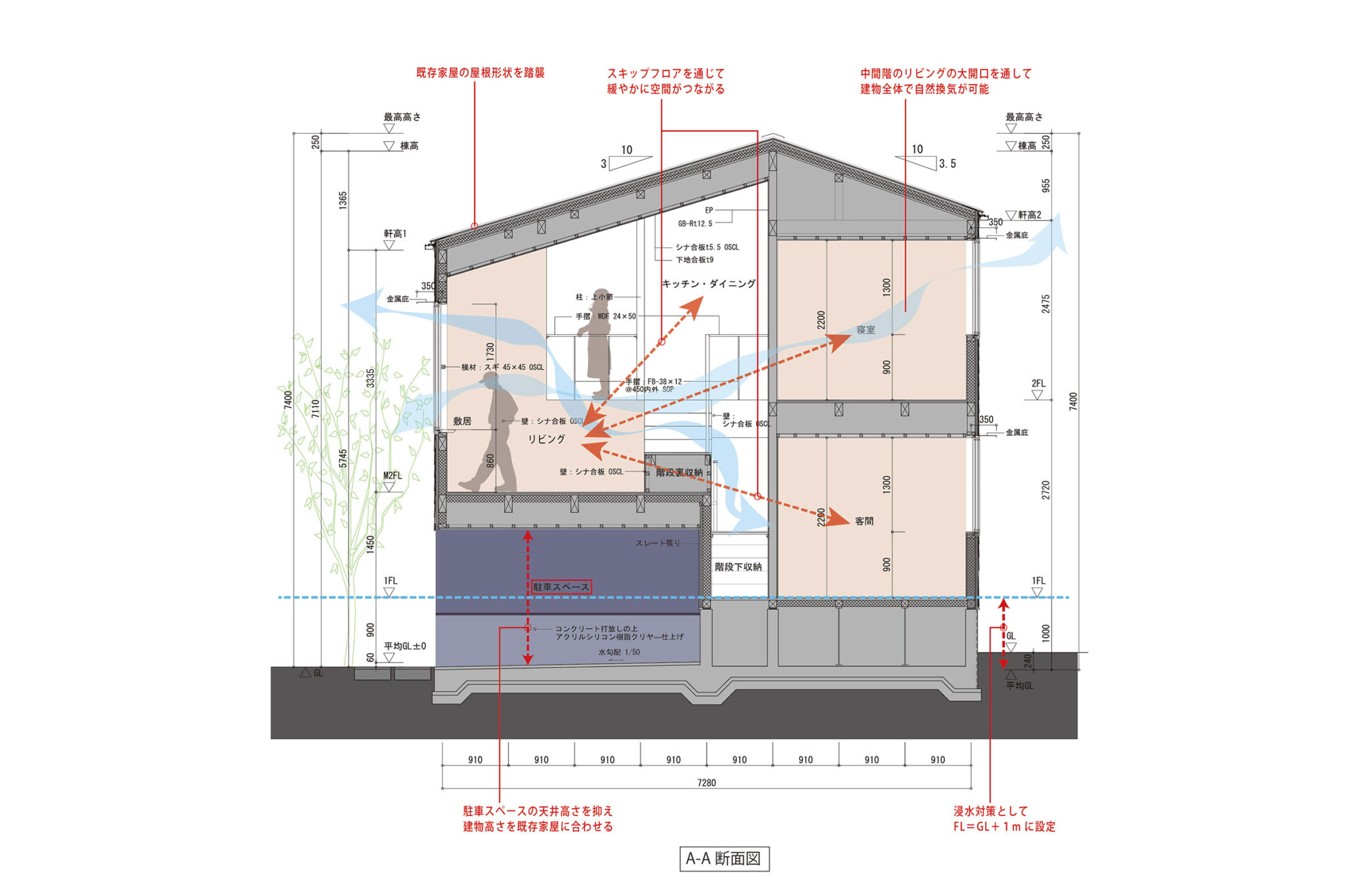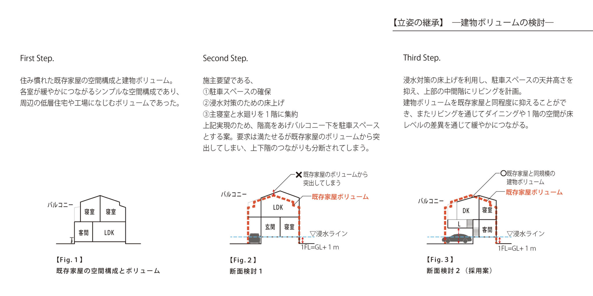 そこでその立姿を継承すべく、施主要望である駐車スペースを計画地内で確保すること、地震による浸水対策としての床上げの2点をヒントに、駐車スペースの天井高さを絞りスキップフロア形式とすることで建物高さを既存家屋と同程度に抑えた。また屋根形状も既存と同じ平入とすることで、住み手だけでなく周辺住民からも見慣れた立姿を継承した。