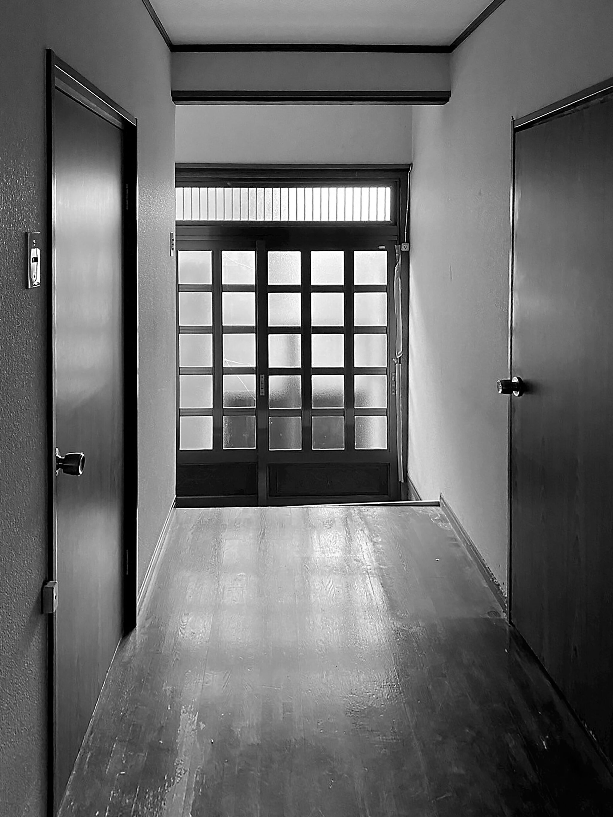 小林敬政による、大阪市の「K邸」。施主家族が40年以上暮らした住まいの建替。既存を建物を超えた“記憶の器”と捉え、刷新ではなく“継承”する設計を志向。旧家屋の間取りを参照して“再構築”した平面構成で“空間体験”を通して記憶を喚起する 既存の1階、ホールから玄関を見る。 photo©小林敬政