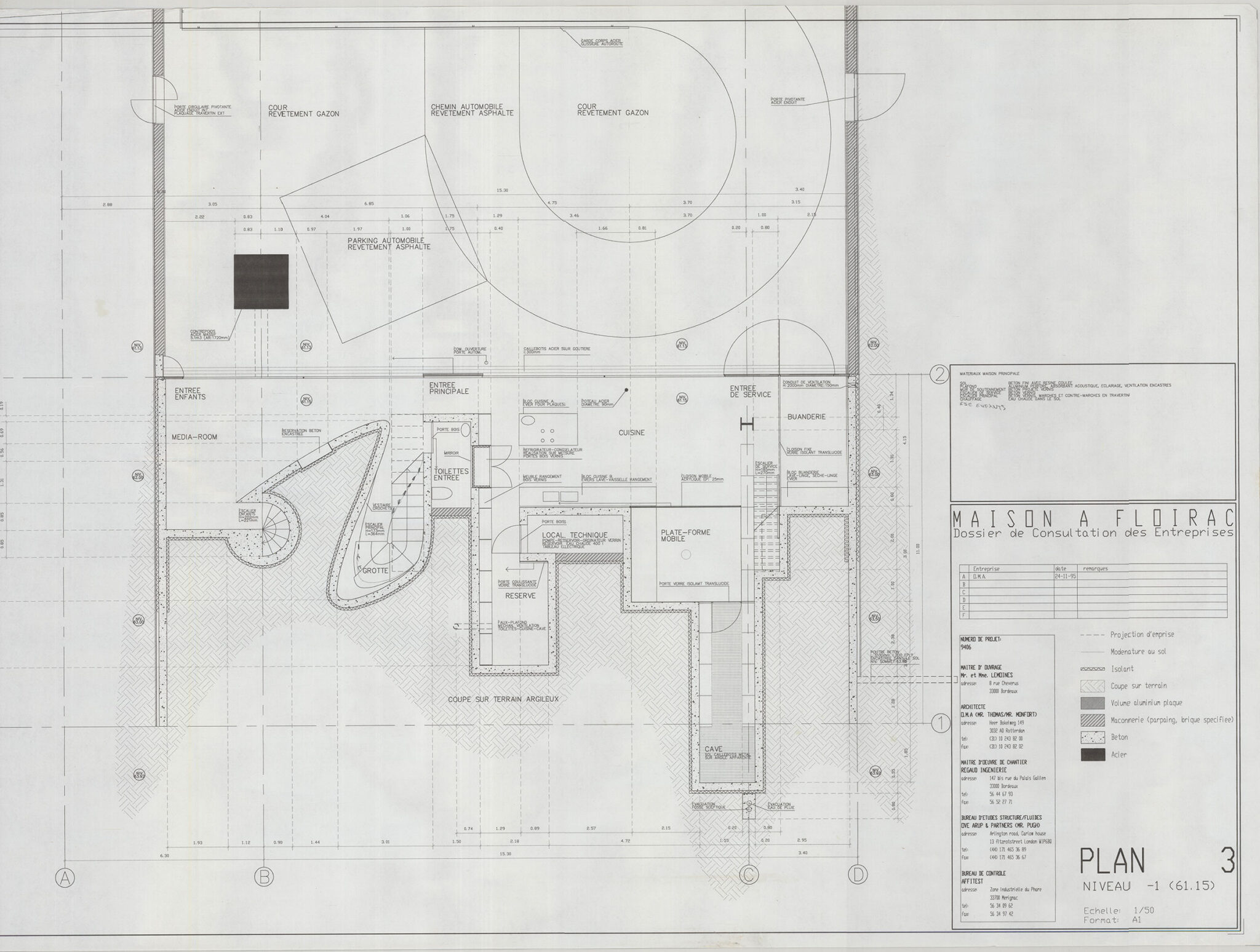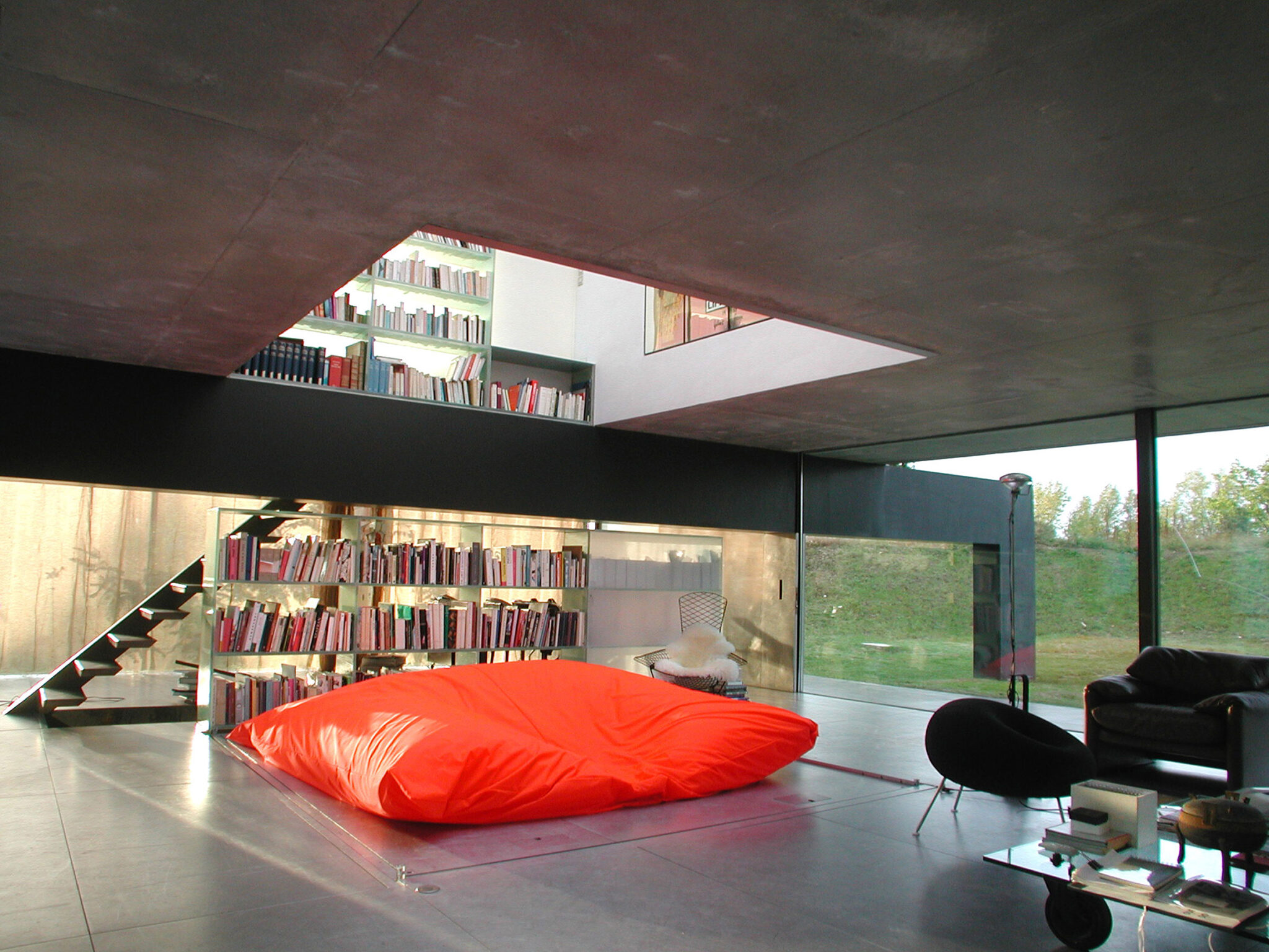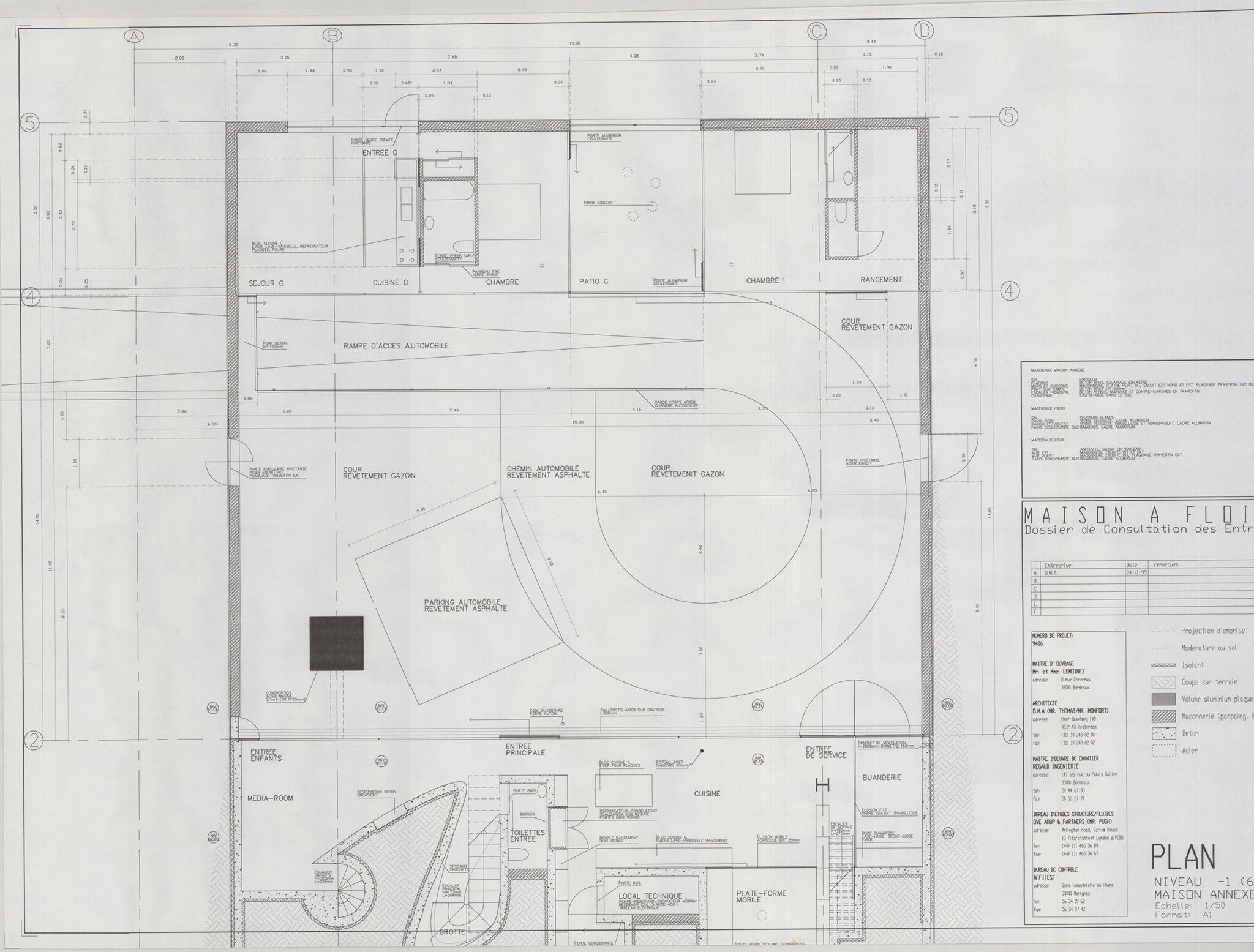 The Maison a Bordeaux is a private residence of three floors on a cape-like hill overlooking Bordeaux. The lower level is a series of caverns carved out from the hill, designed for the most intimate life of the family; the ground floor on garden level is a glass room – half inside, half outside – for living; and the upper floor is divided into a children’s and a parents’ area. The heart of the house is a 3×3.5m elevator platform that moves freely between the three floors, becoming part of the living space or kitchen or transforming itself into an intimate office space, and granting access to books, artwork, and the wine cellar.