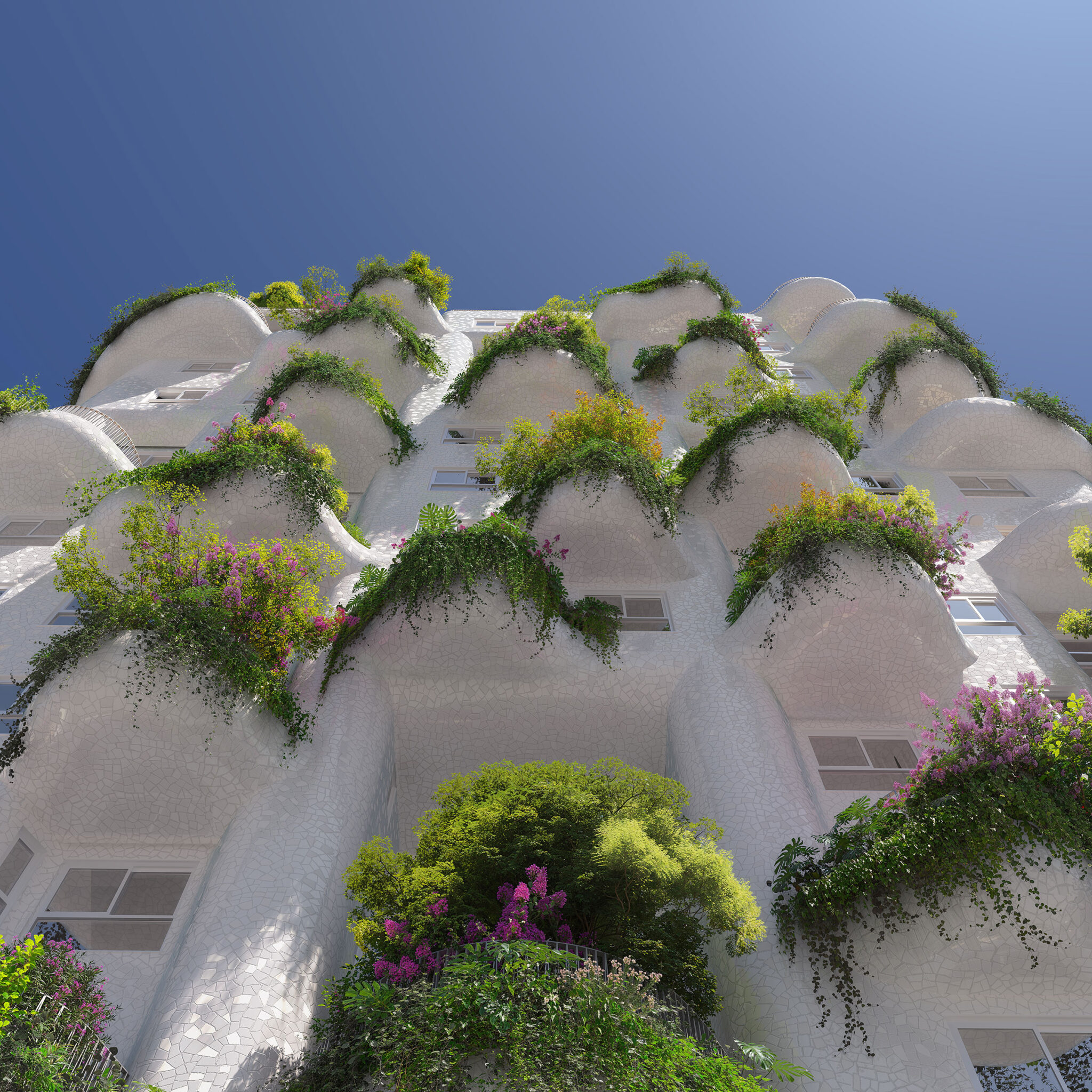 都市に自然を取り戻すという本プロジェクトの取り組みを強調するために、緑化はセラミックのファサードによって実現されたデザイン全体にわたる有機的な曲線によって引き立てられています。小さな不規則な形状のモザイクを用いることで、タイルはあらゆる曲線に対応できるようになっており、この技法はカタルーニャ出身の建築家アントニ・ガウディの作品で広く知られています。さまざまな異なる白の色調を用いて、平らな部分には大きめのタイルが使われ、より細かく粒状のパターンが急な曲線部分には滑らかな仕上がりをもたらしています。この技法は、高品質な仕上がりを実現するだけでなく、維持管理が容易であるという利点も兼ね備えています。