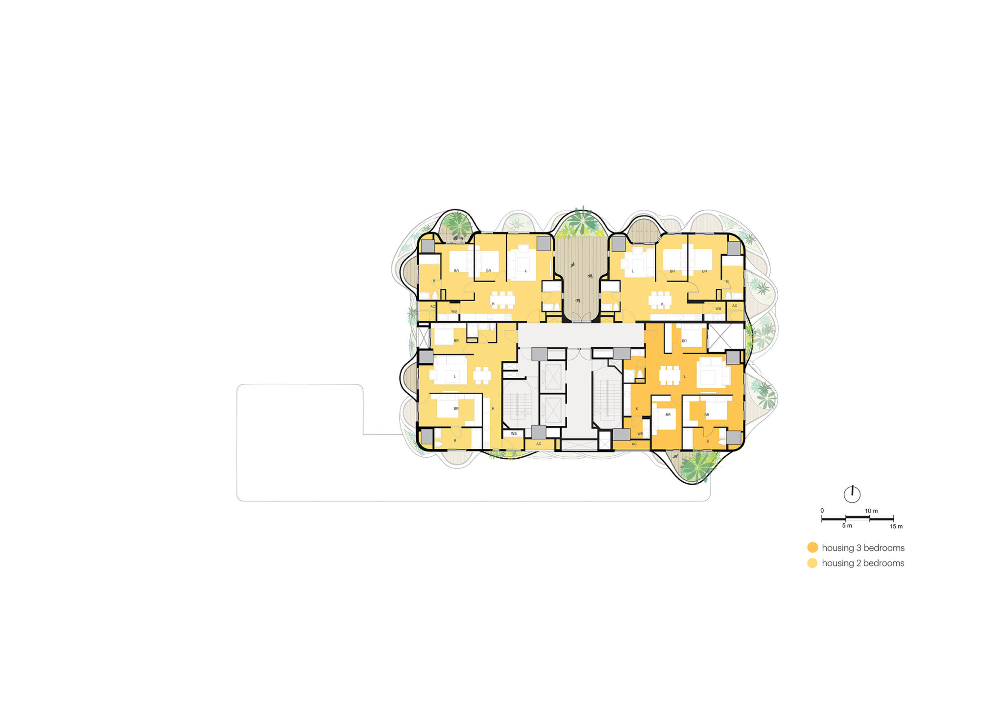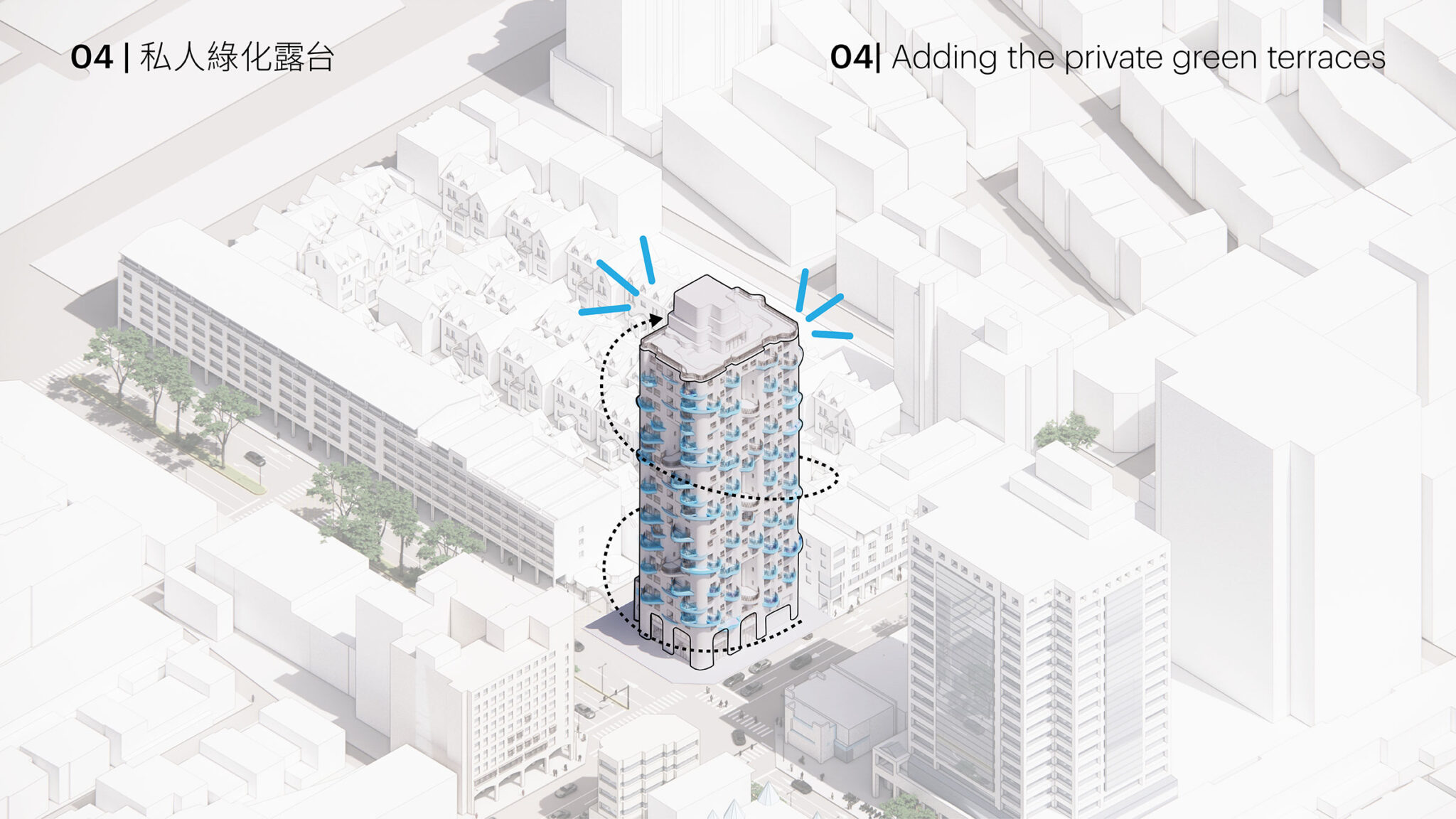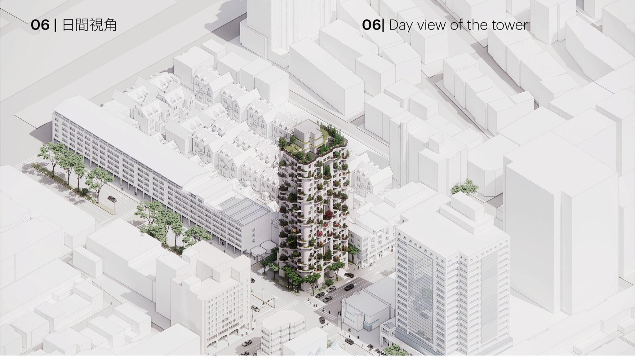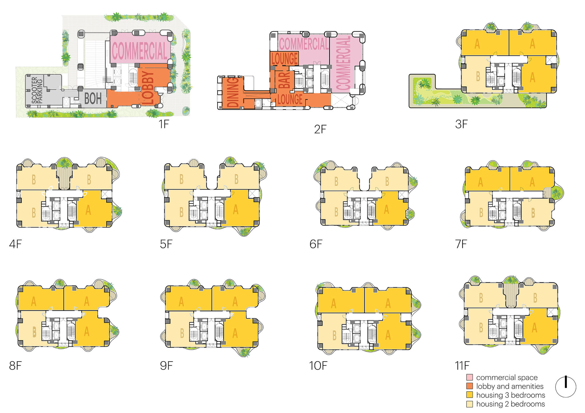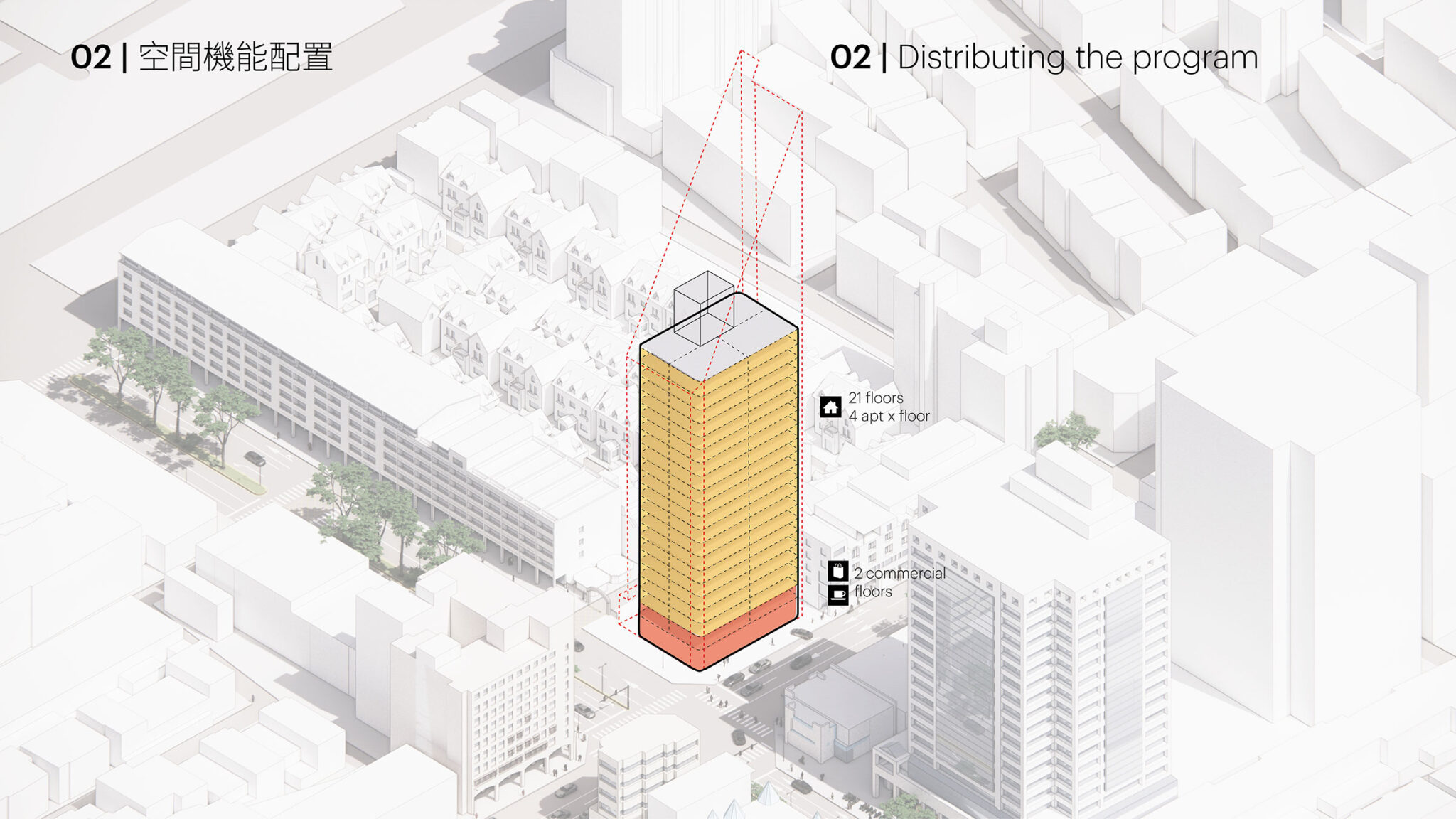 このプロジェクトでは、商業スペースと共用のダイニングルーム、ラウンジ、カラオケスペースを備えた2フロアの上に、販売用の住戸76戸が設けられています。この開発は中間層の住民、特に若いカップルを主な対象としており、共用エリアが設計上の重要な要素となっていて、多様な屋外の共有スペースが設けられています。屋上には共用のガーデンテラスがあり、それは重層的な緑のクラウンを囲むように配置されており、そのクラウンには住民のための多機能な共用スペースが設けられています。5つの共用バルコニーが建物の21フロアに分散して配置されており、それぞれが3層分のくぼみをファサードに刻むことで、開放感を生み出しています。