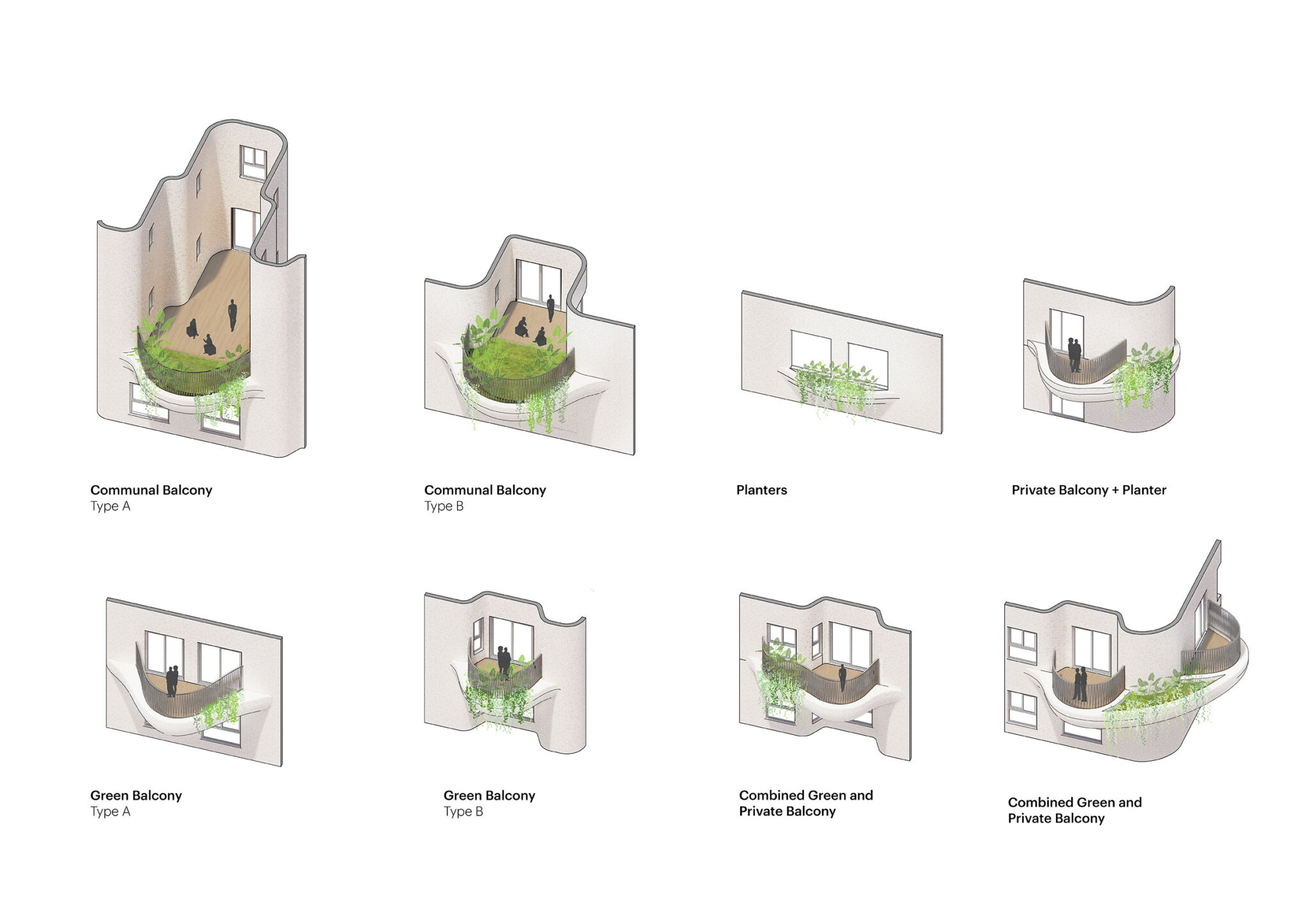 The project features 76 apartments for sale above two floors featuring commercial spaces and a communal dining room, lounge, and karaoke space. With the development aimed at middle-class residents and especially young couples, communal areas are a significant focus of the design, with a large variety of shared outdoor spaces. The roof features a shared garden terrace, surrounding a layered green crown that hosts a multi-functional shared space for residents’ use. Five communal balconies are distributed among the building’s 21 floors, with each one carving a three-storey indent into the building’s façade to create a feeling of spaciousness.