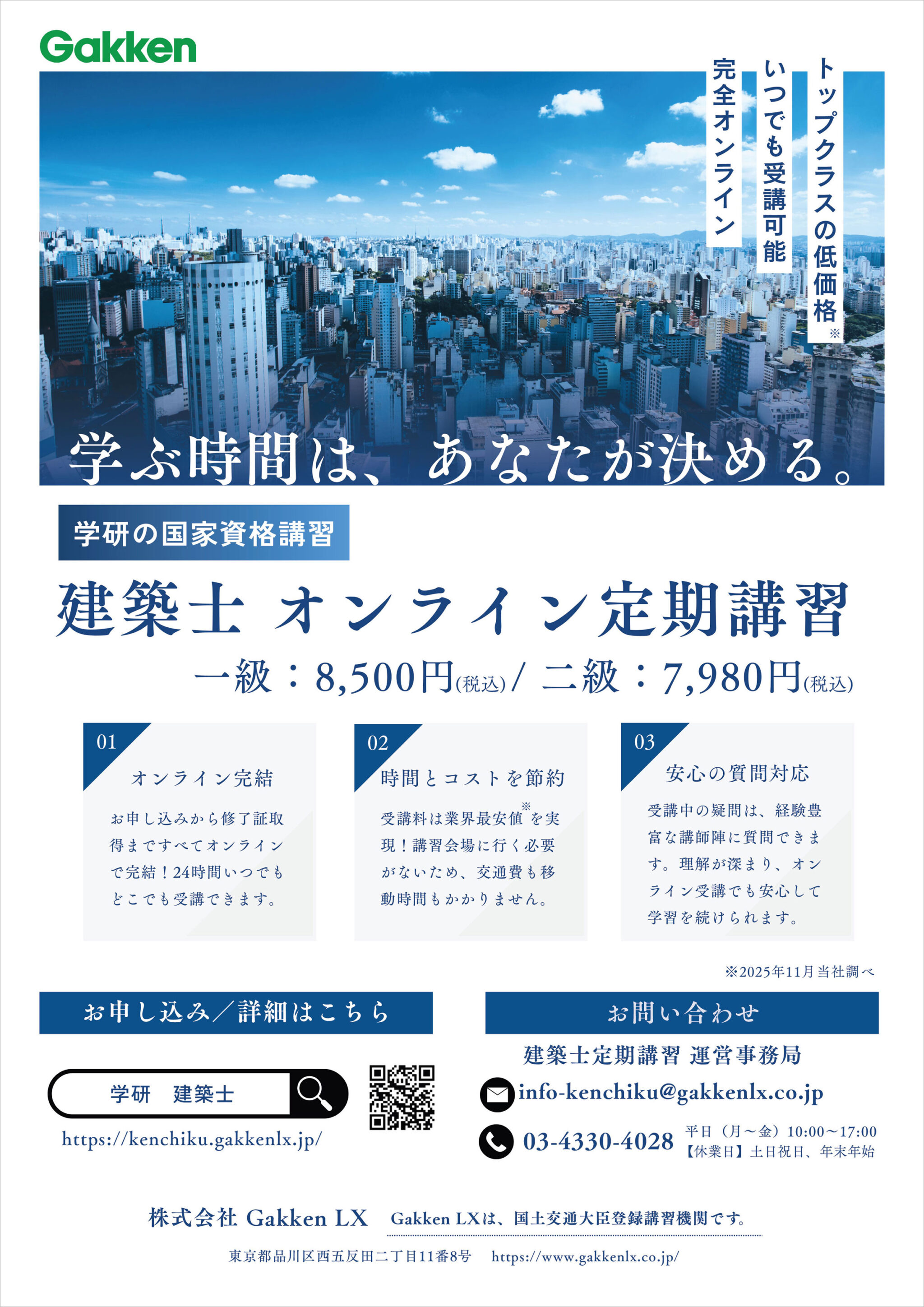 株式会社Gakken LXは、令和7年4月9日に国土交通大臣の登録(登録番号:一級建築士定期講習 第12号、二級建築士定期講習 第11号)を受け、令和7年6月より一級建築士定期講習および二級建築士定期講習(オンライン)を実施しております。尚、Gakken LXでは木造建築士定期講習は実施しておりません。