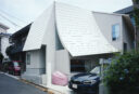 HUNEによる、東京・品川区の住宅「大森の幕屋」。神の住まいでもあったテント式の小屋“幕屋”を参照した計画。其々が趣味を楽しめる住まいを求め、様々な用途のフロアを“離散的”に積層させる構成を考案。全体を“布の様な屋根”で覆って内外の距離も適切に保つ外観、南西側の道路より見る。 photo©高野ユリカ