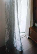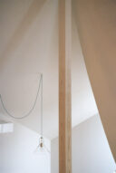 HUNEによる、東京・品川区の住宅「大森の幕屋」。神の住まいでもあったテント式の小屋“幕屋”を参照した計画。其々が趣味を楽しめる住まいを求め、様々な用途のフロアを“離散的”に積層させる構成を考案。全体を“布の様な屋根”で覆って内外の距離も適切に保つ1階、カーテンと差し込む光 photo©高野ユリカ