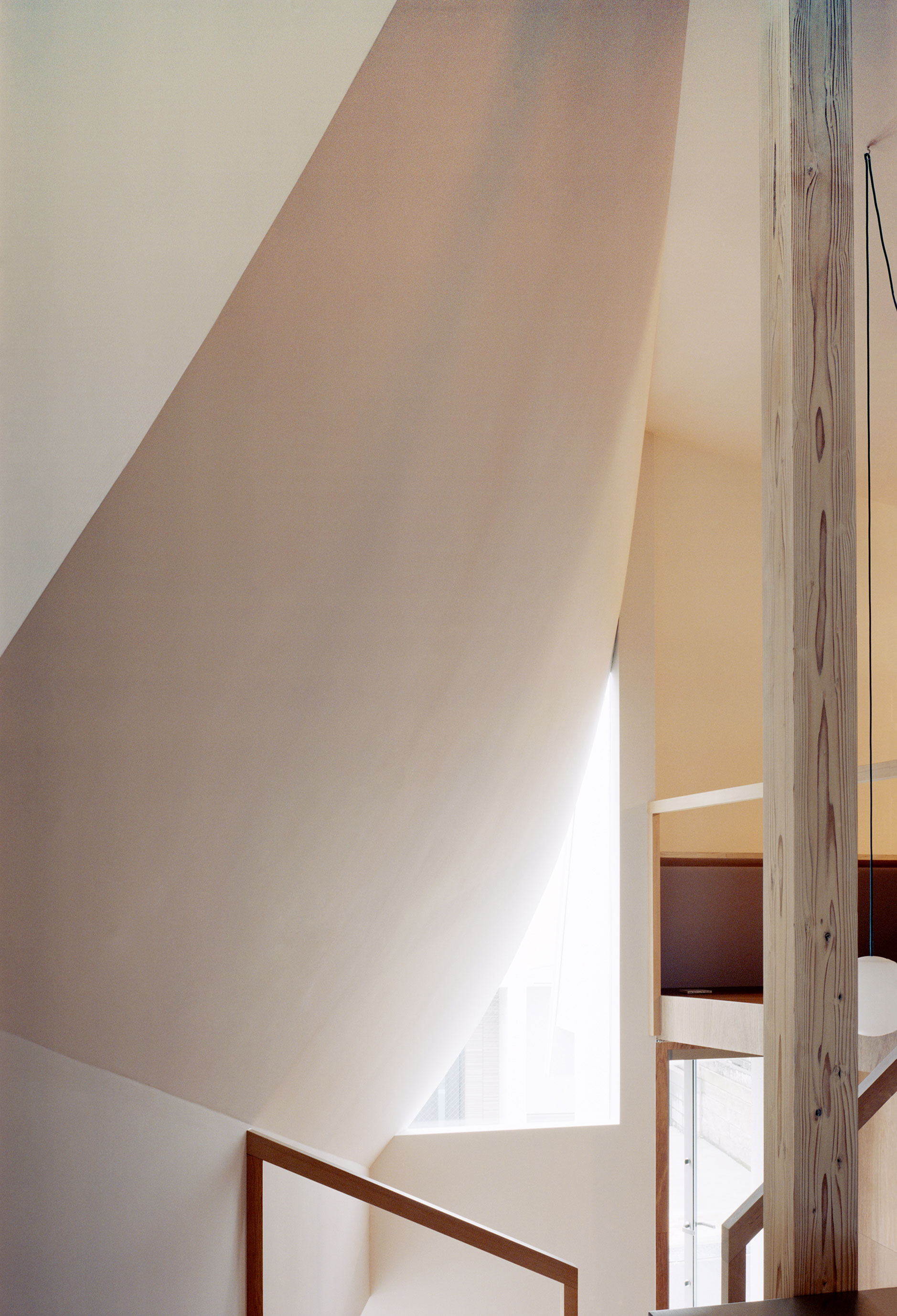 玄関から階段を登っていくと、徐々に空間が目の前に現れ、屋根との距離と人の動きによって外との距離感が変わることが認識される住宅となった。