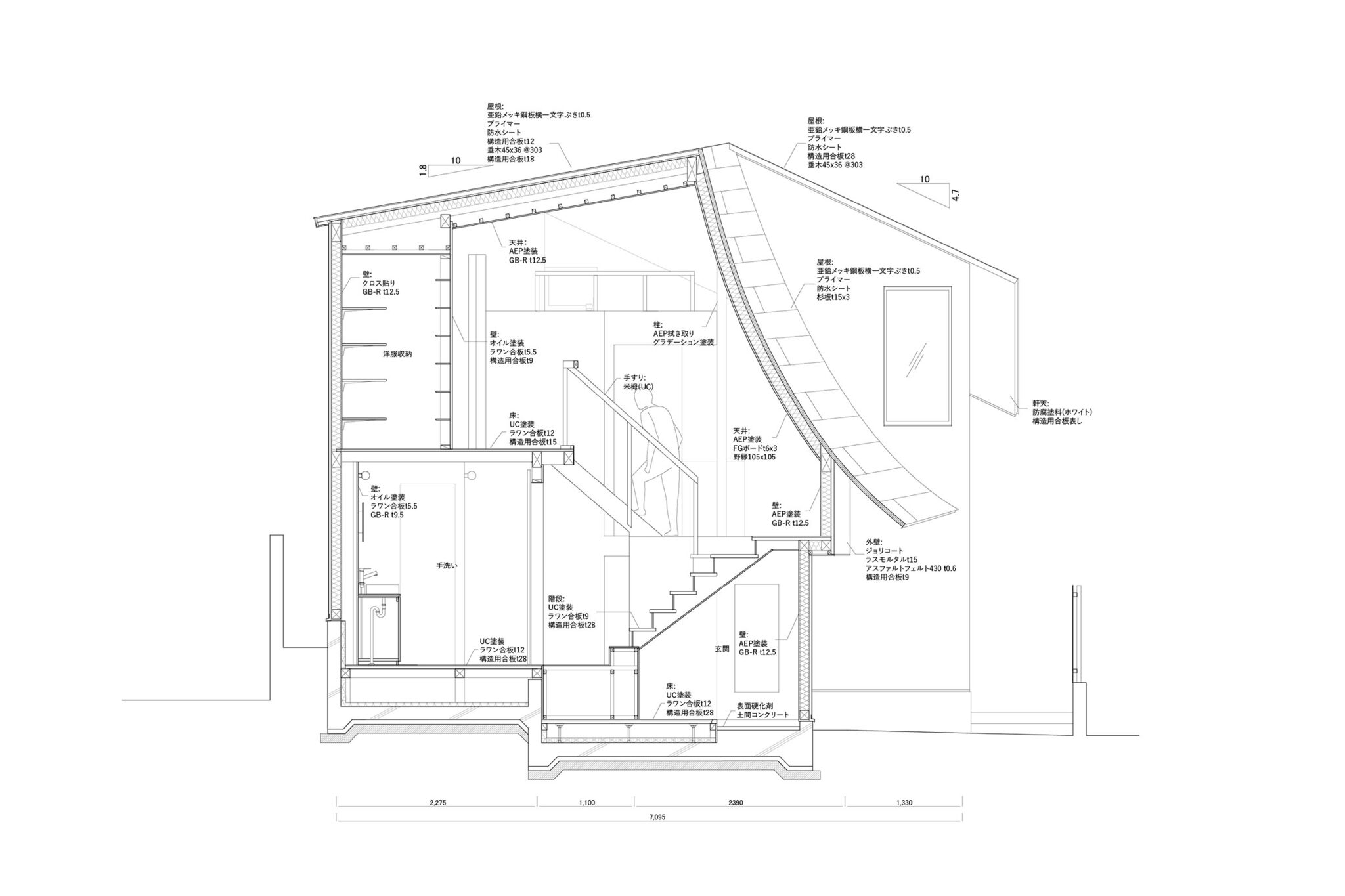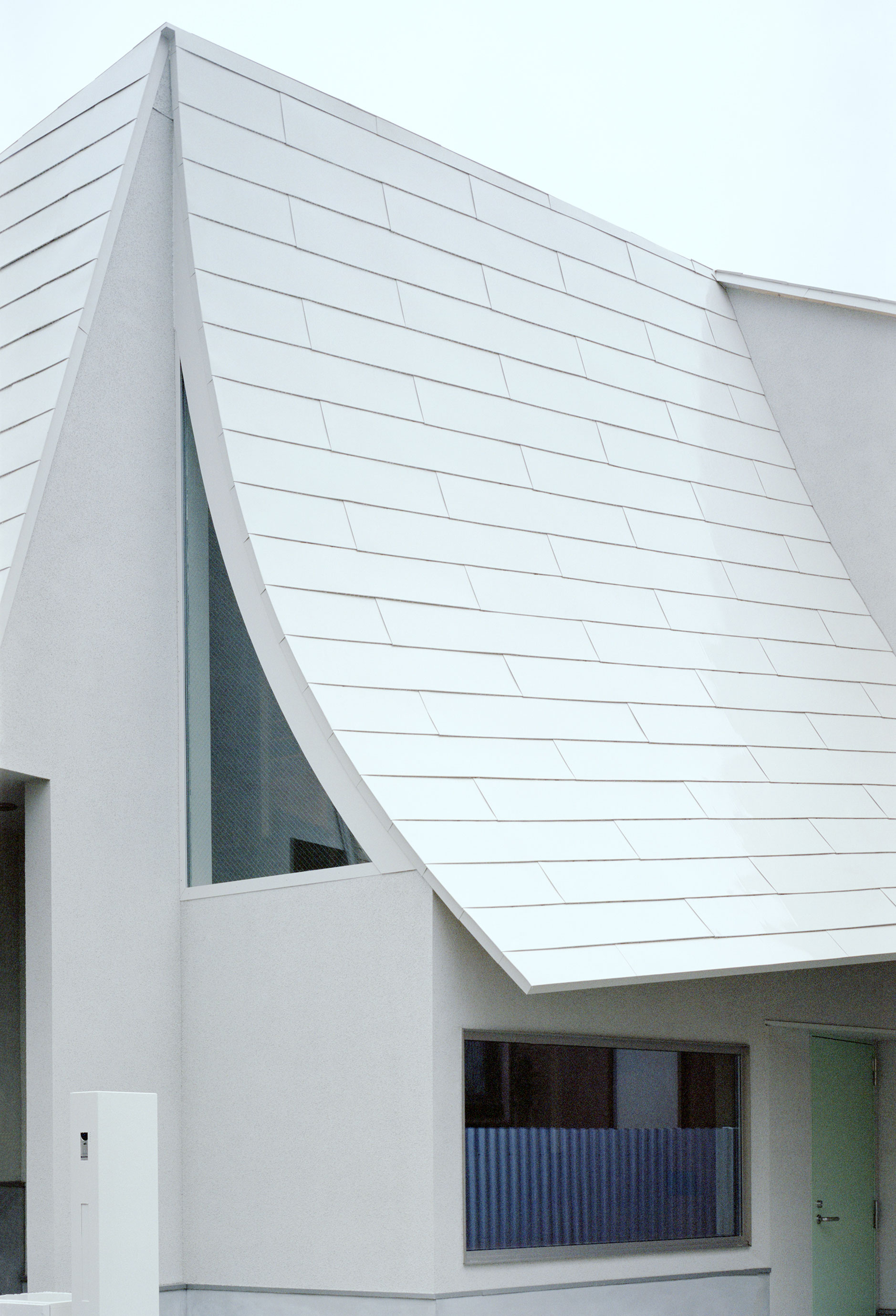 HUNEによる、東京・品川区の住宅「大森の幕屋」。神の住まいでもあったテント式の小屋“幕屋”を参照した計画。其々が趣味を楽しめる住まいを求め、様々な用途のフロアを“離散的”に積層させる構成を考案。全体を“布の様な屋根”で覆って内外の距離も適切に保つ外観、屋根と壁の詳細 photo©高野ユリカ