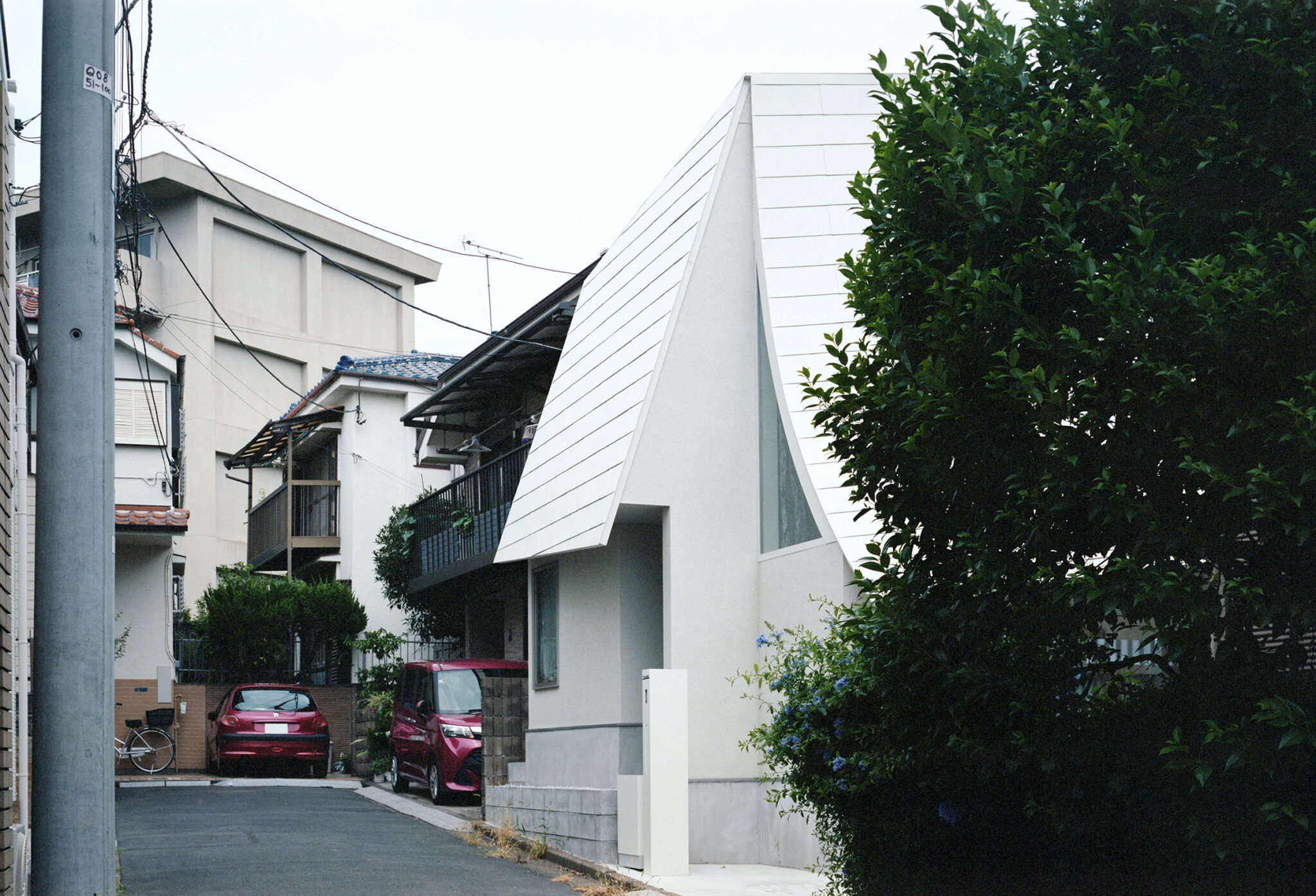 HUNEによる、東京・品川区の住宅「大森の幕屋」。神の住まいでもあったテント式の小屋“幕屋”を参照した計画。其々が趣味を楽しめる住まいを求め、様々な用途のフロアを“離散的”に積層させる構成を考案。全体を“布の様な屋根”で覆って内外の距離も適切に保つ外観、南西側の道路より見る。 photo©高野ユリカ