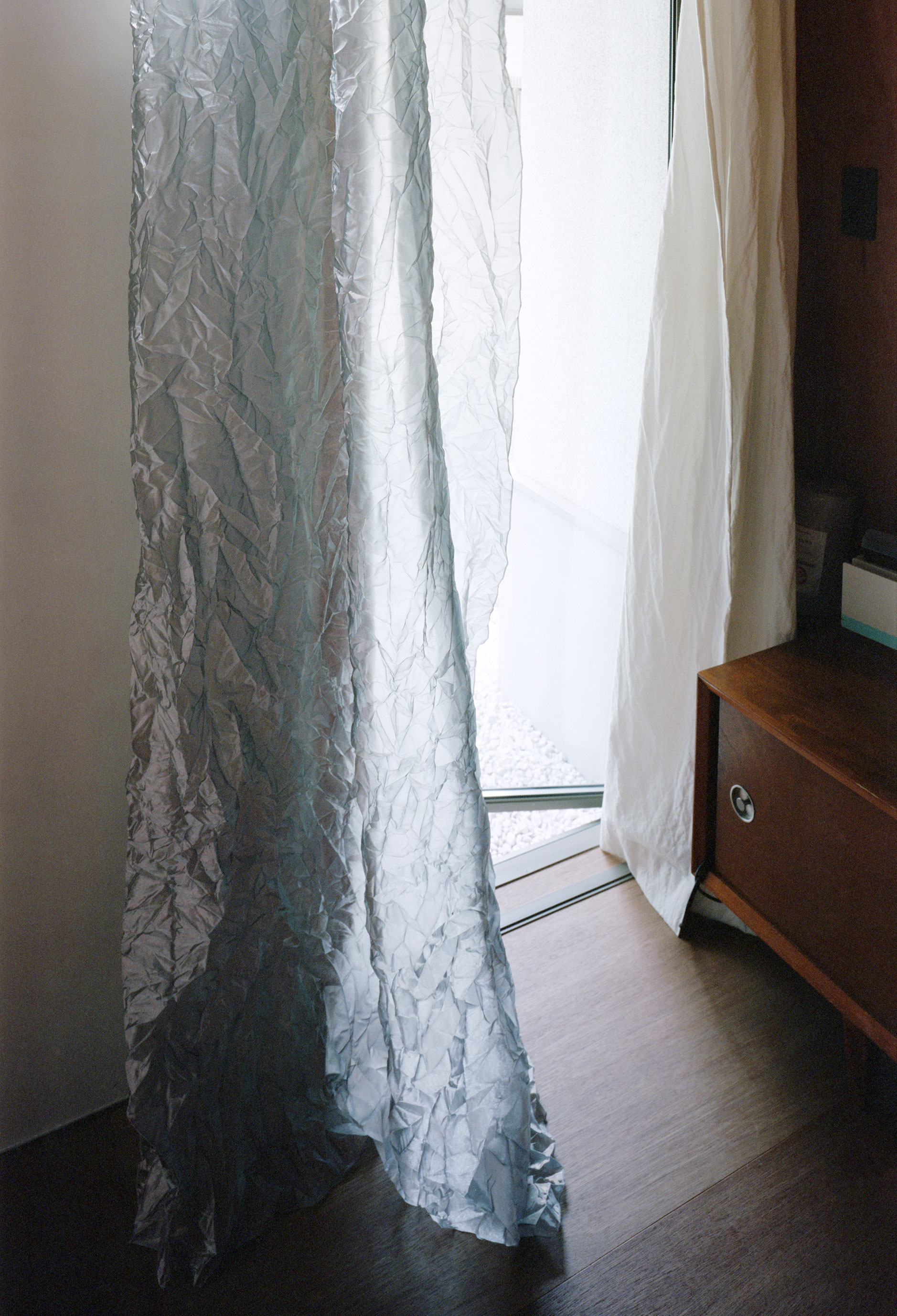 HUNEによる、東京・品川区の住宅「大森の幕屋」。神の住まいでもあったテント式の小屋“幕屋”を参照した計画。其々が趣味を楽しめる住まいを求め、様々な用途のフロアを“離散的”に積層させる構成を考案。全体を“布の様な屋根”で覆って内外の距離も適切に保つ1階、カーテンと差し込む光 photo©高野ユリカ
