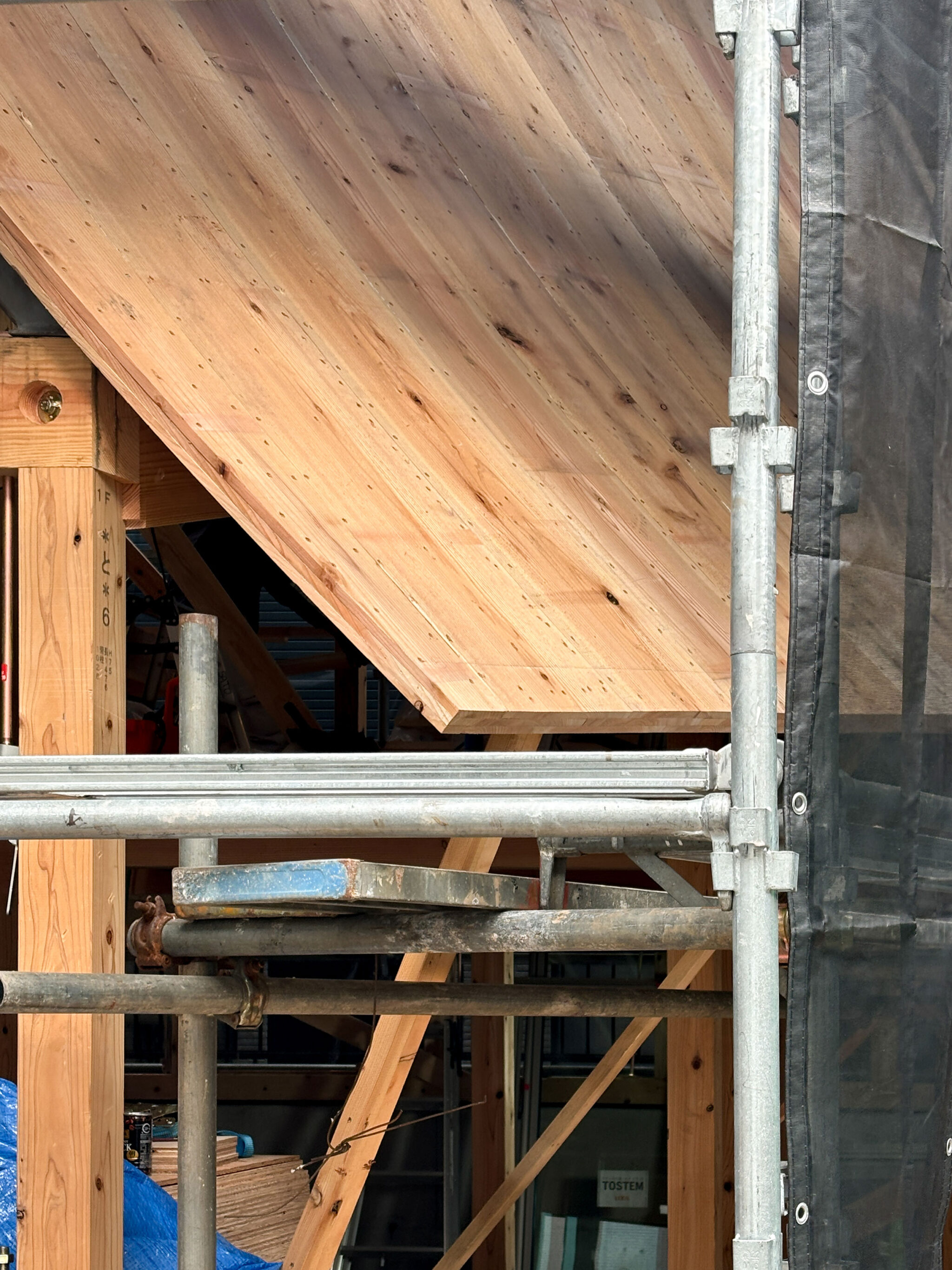 HUNEによる、東京・品川区の住宅「大森の幕屋」。神の住まいでもあったテント式の小屋“幕屋”を参照した計画。其々が趣味を楽しめる住まいを求め、様々な用途のフロアを“離散的”に積層させる構成を考案。全体を“布の様な屋根”で覆って内外の距離も適切に保つ施工中の様子 photo©HUNE