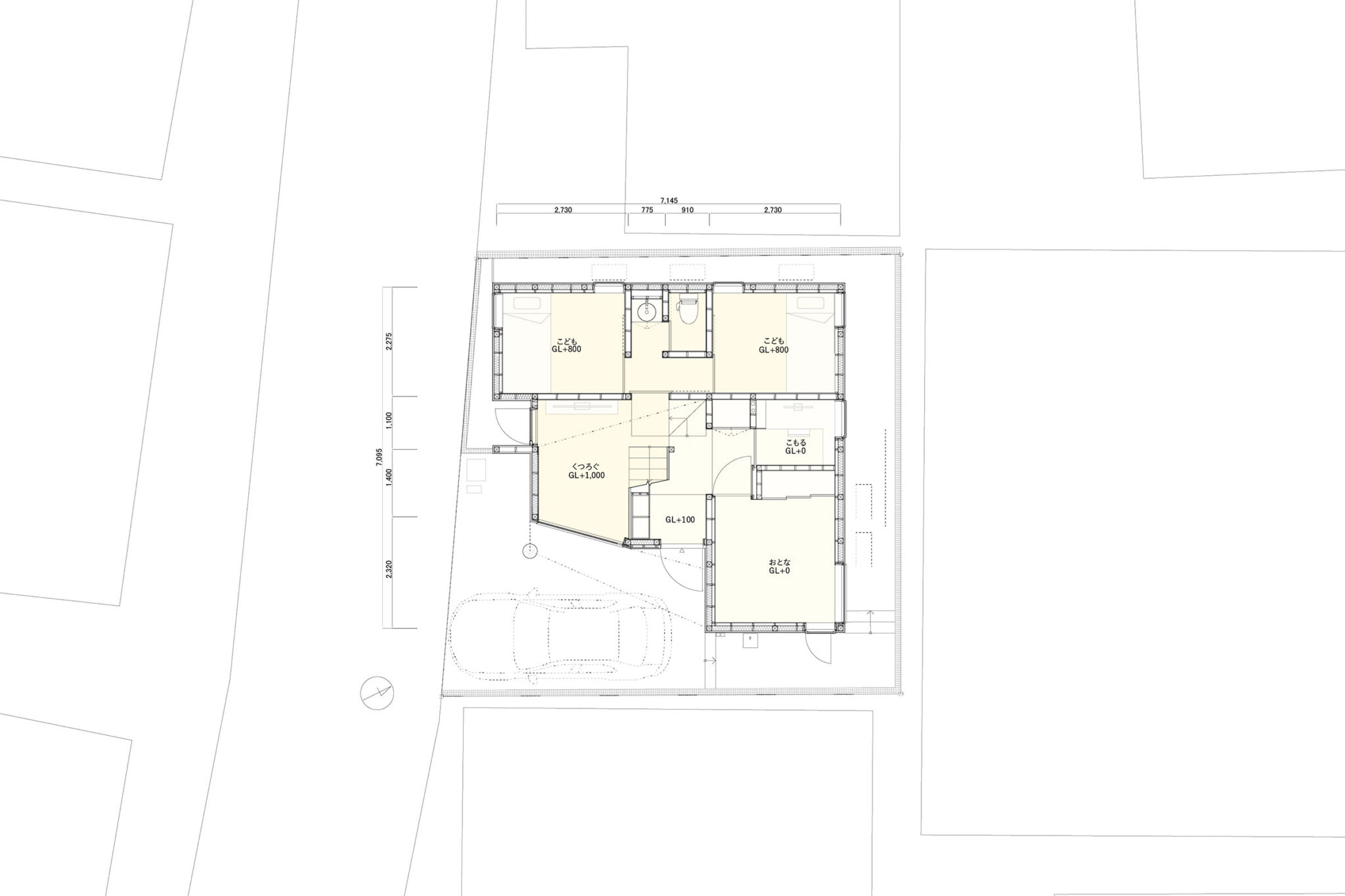 線路側から徐々に上る前面道路の勾配に合わせて、寝室を半層ずらしながらL字に配置した。