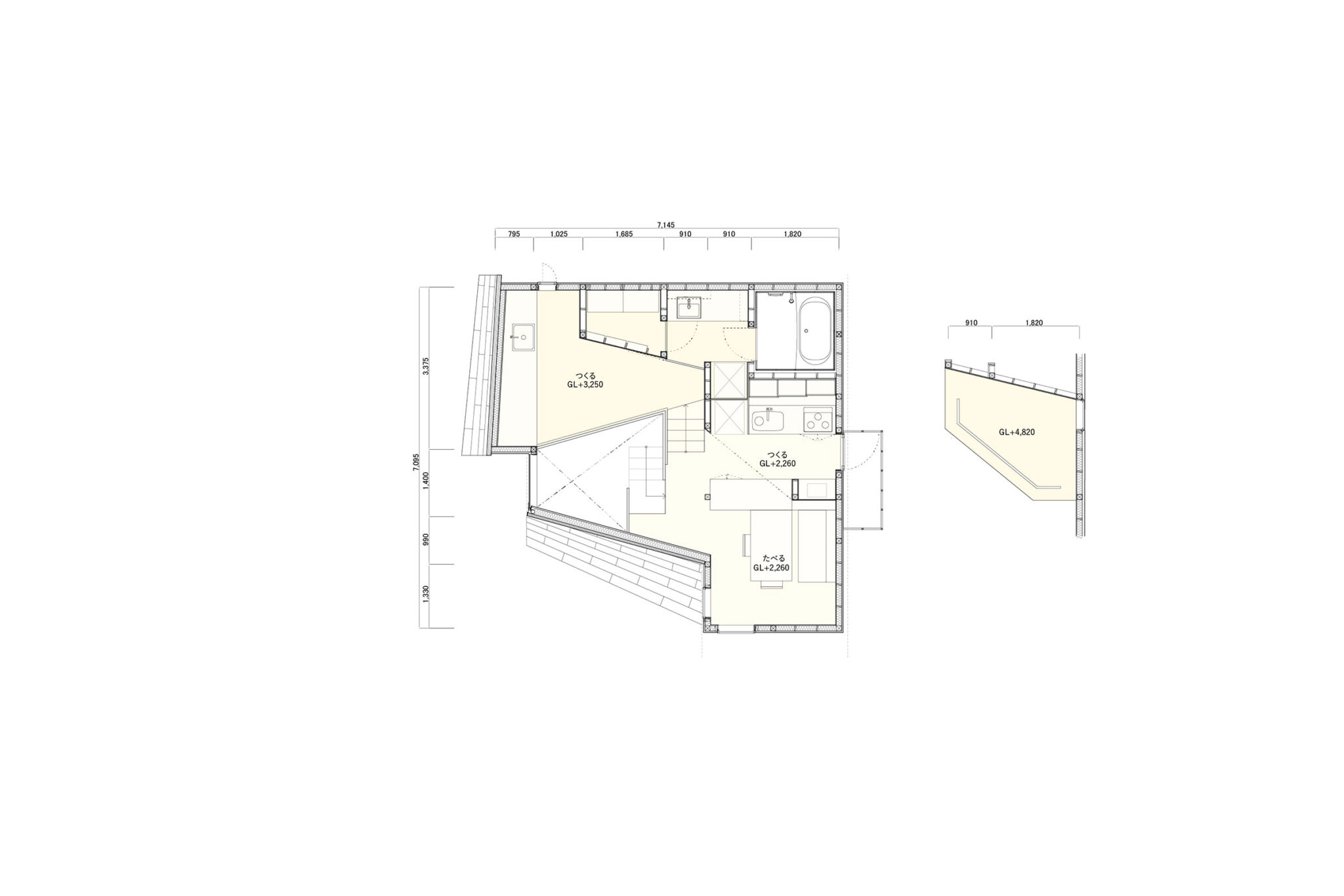 寝室の上に、くつろぐための低い場所、家族が集まって食事をする食堂、趣味のための作業スペースを階段に沿って離散的に積層させ、狭さを感じさせない広がりのある空間構成とした。