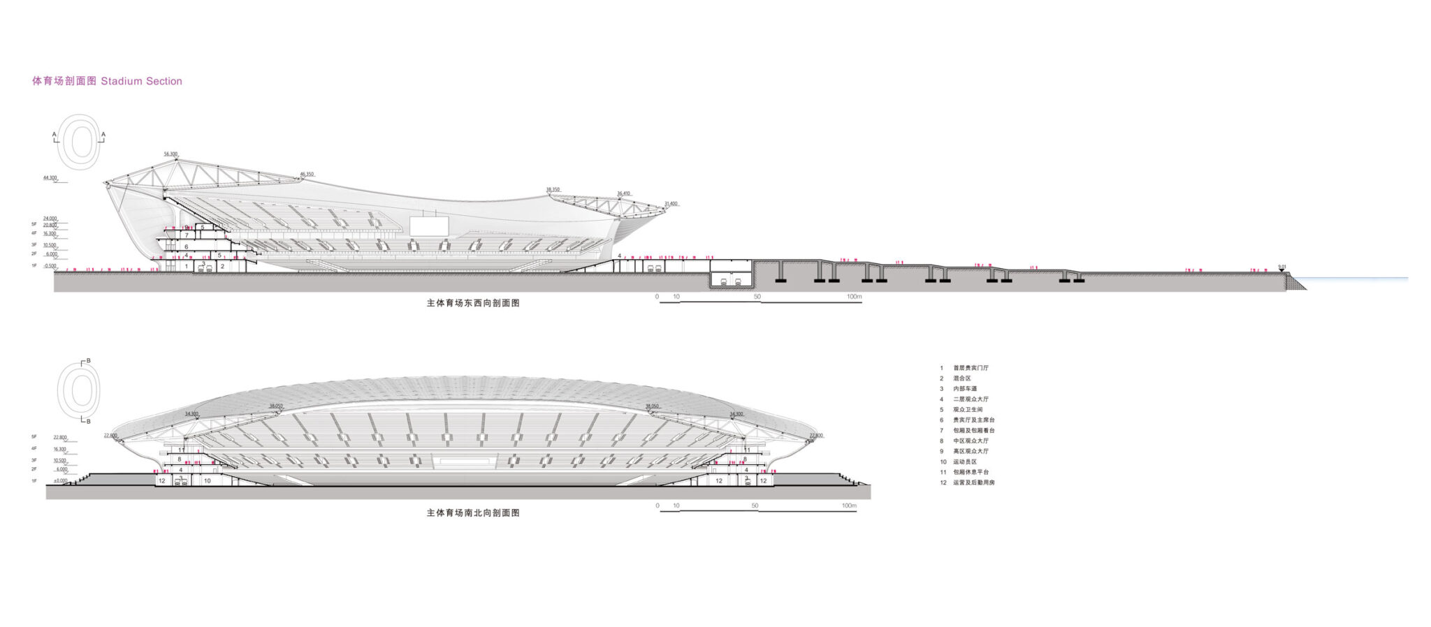 The stadium’s roof has been designed as a system of layers that shelter the 60,000 spectators from rain and direct sunlight while also enabling rising warm air to be naturally vented outside the building envelope. This distinctive layered roof encircles the stadium, emulating the pleated silk structures of traditional Chinese fans.