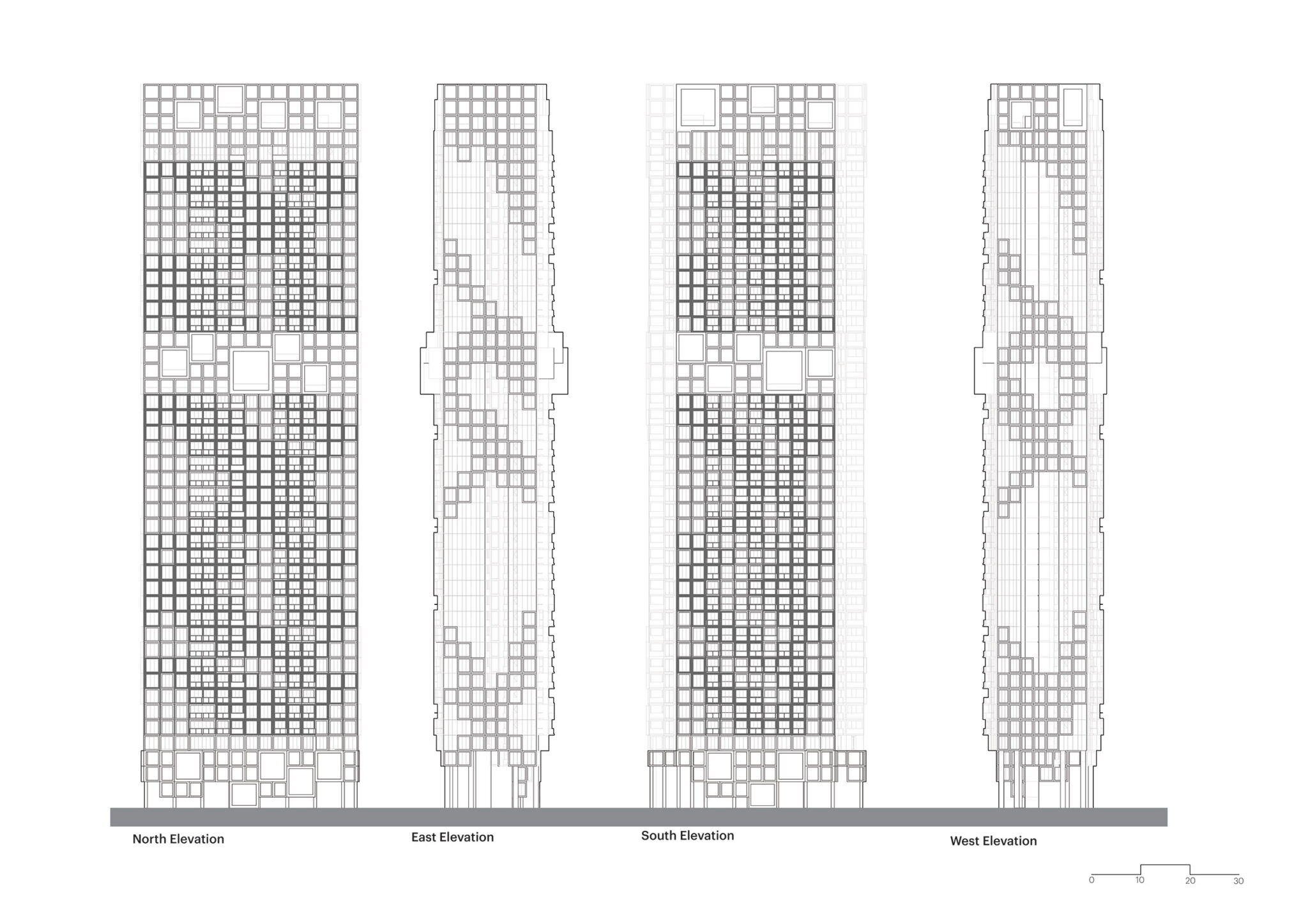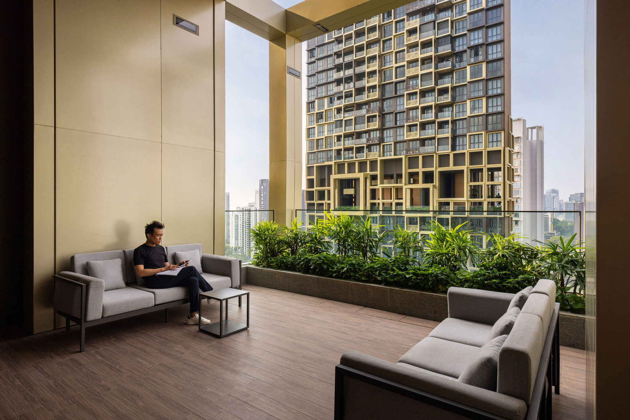 このピクセル状のパターンはまた、シンガポールに特徴的な豊かな緑を備えた建物の共用スペースを強調する機能を果たしています。24番目のフロアには約4層分の高さを持つスカイガーデンがあり、タワーの最上部には、社交の集まりのための親密な空間「アーウェル・スカイ」が設けられています。建物のこれら両方のセクションでは、単一ユニットによるピクセルの硬直したグリッドが緩やかになり、2倍および3倍サイズのフレームによって内部の樹木や植物が際立って見えるようになっています。
