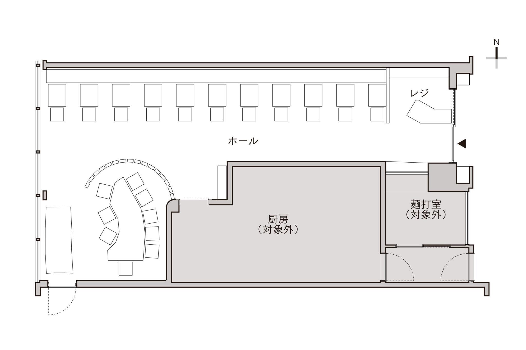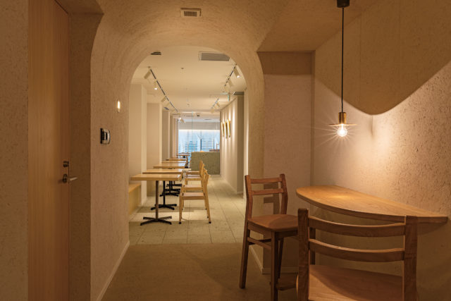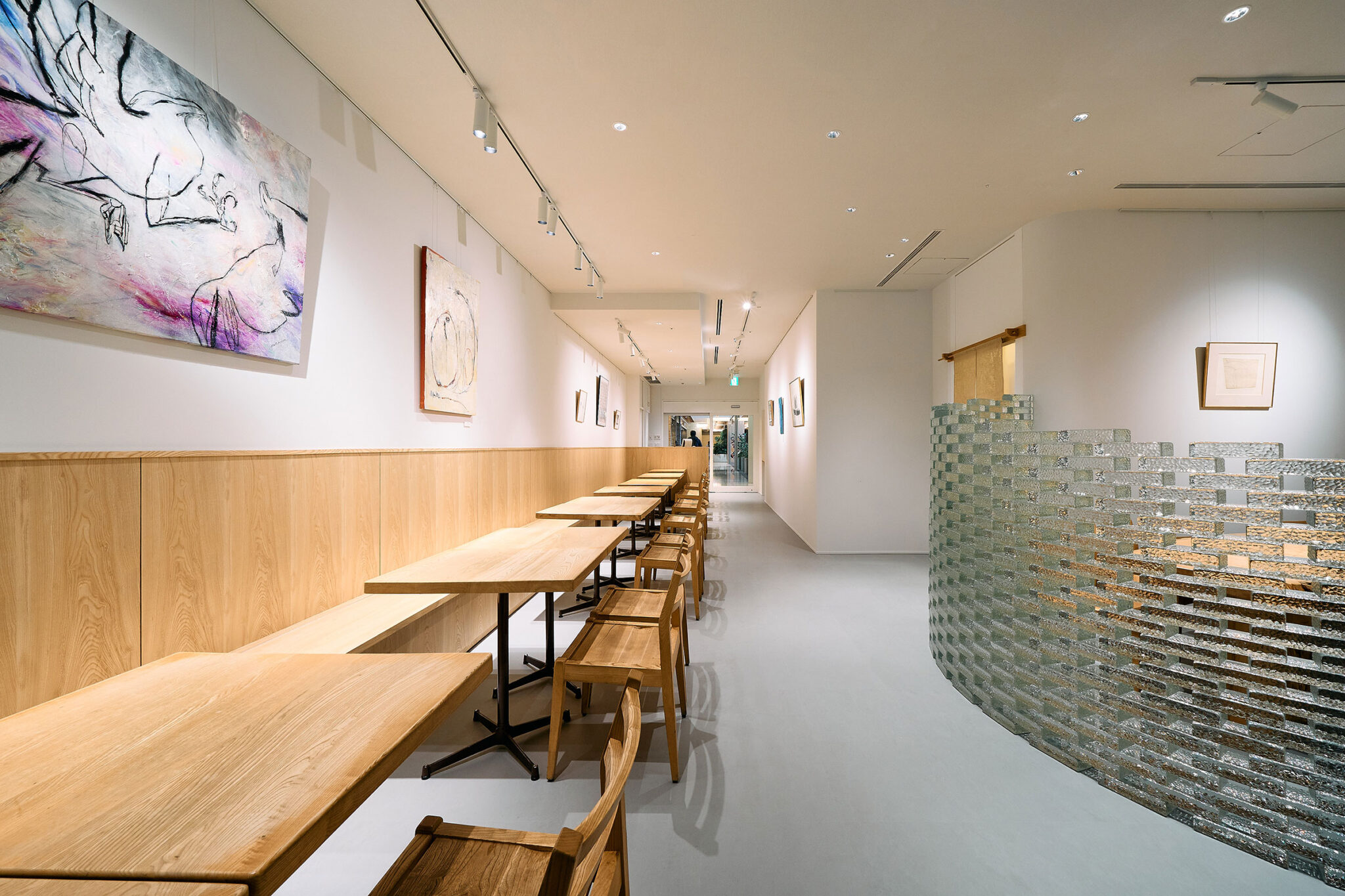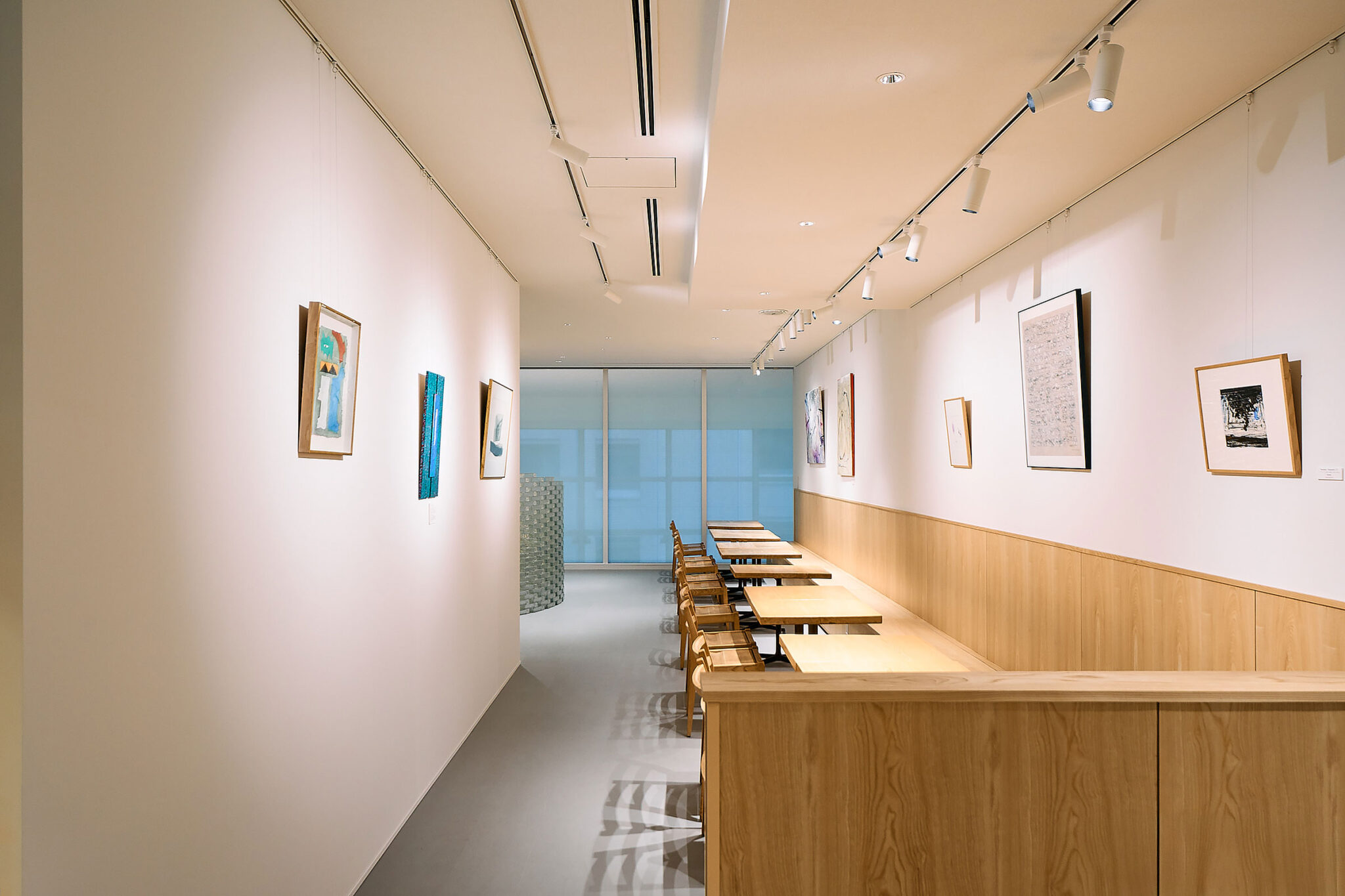 ビル内にギャラリースペースがあることもあり、以前に手掛けた銀座店と同様にギャラリーを兼用することが求められ、外観とホールの改装、客席の改変、半個室の新設を行った。コンパクトでありながらも広がりが感じられ、感性が豊かになるような空間を目指し、芸術鑑賞と飲食を同時に行うための設えのバランスや半個室のための間仕切りの現れ方を模索した。
