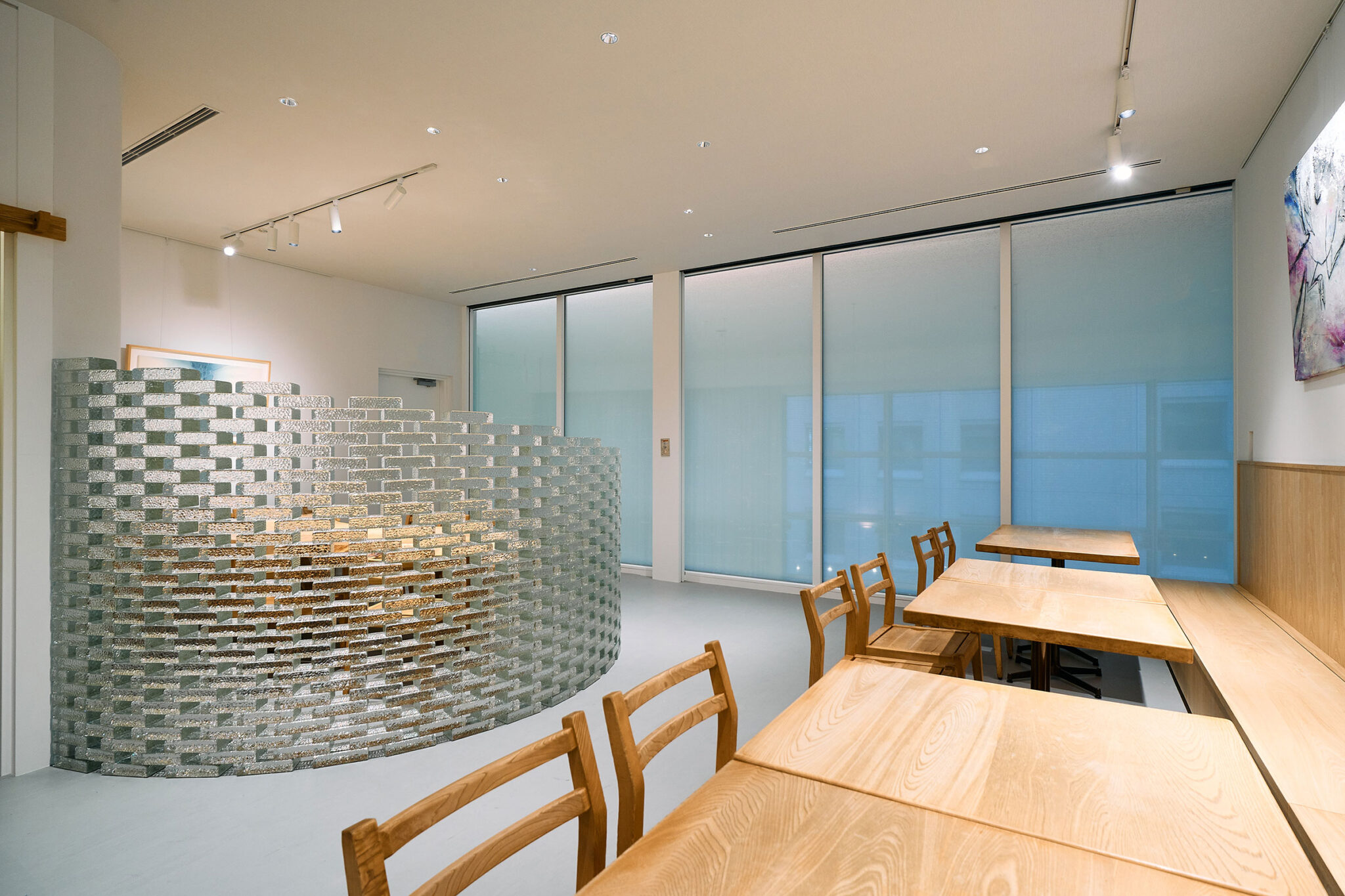 山口貴司による、東京・千代田区の飲食店「Restaurant Gallery K」。ギャラリーの機能も備えた蕎麦店。“感性が豊かになる”様な空間を求め、芸術鑑賞と飲食を同時に行う為の“設えのバランス”を模索。間仕切りのガラスブロック積みは皇居の石垣や東京駅の煉瓦などの“組石”を引用 レジ側から客席を見る。 photo©Tatsuya Arai