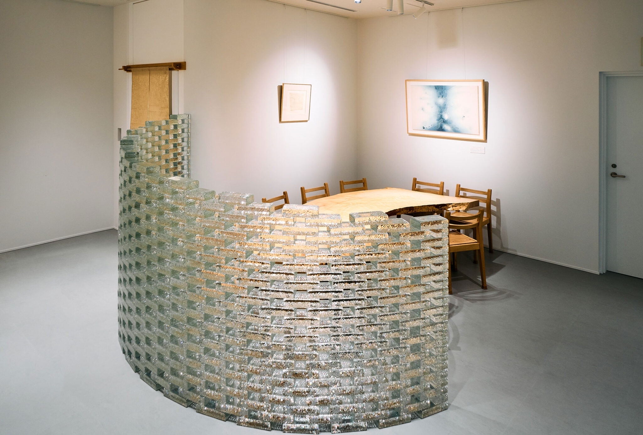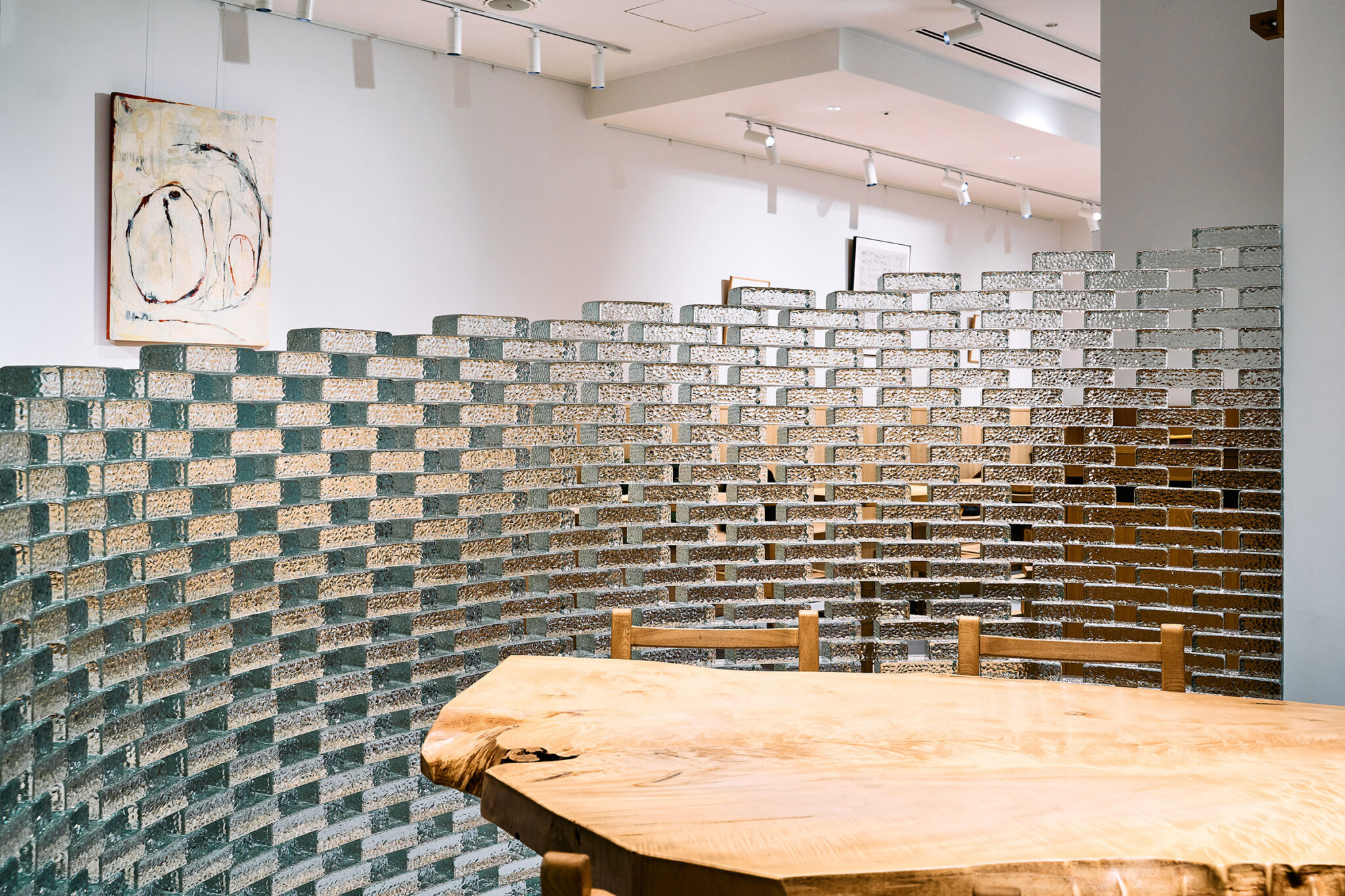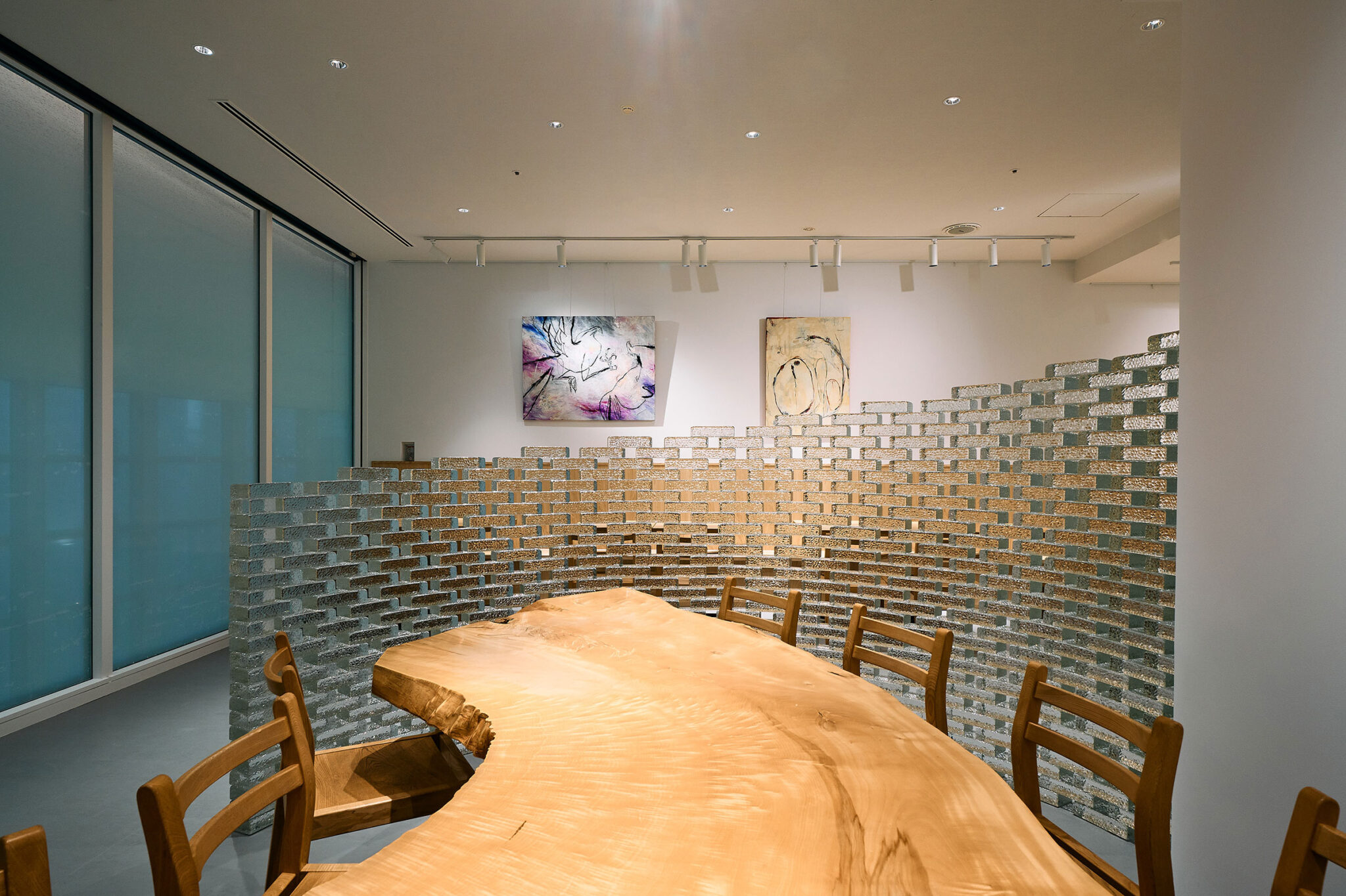 さらにガラスブロックに施された岩肌や水面のような模様が接着部分を見えづらくするとともに、お濠の風景を想起させながら彫刻のように角度によって見え方が変わることで、アートの一部であるかのように空間に溶け込む間仕切りとなった。