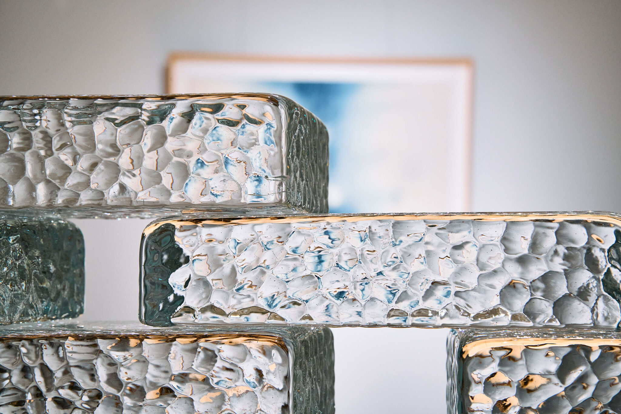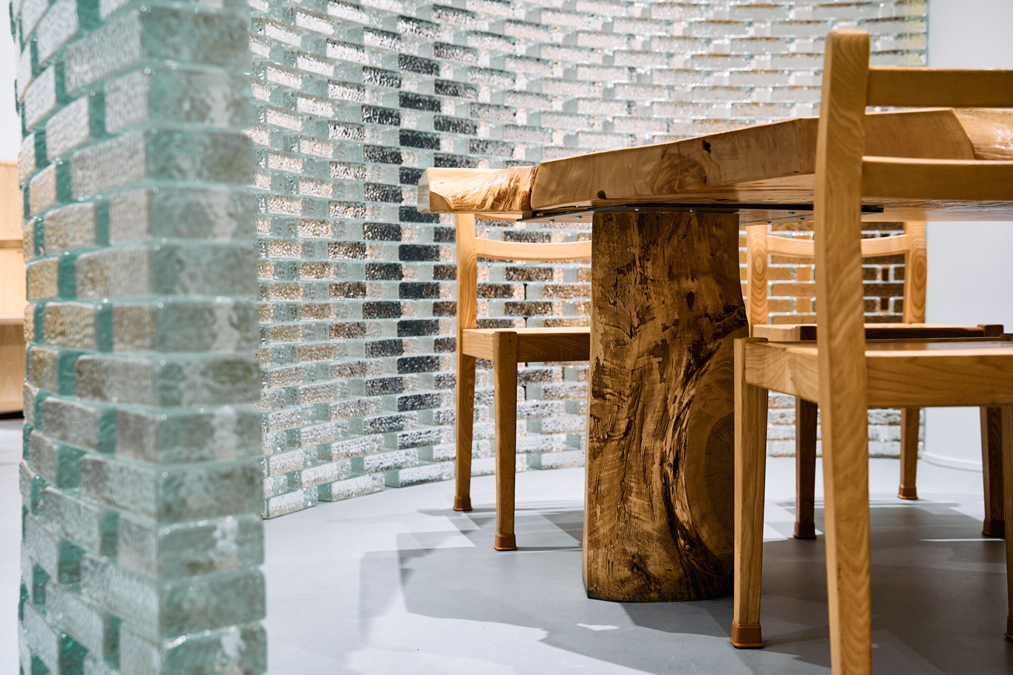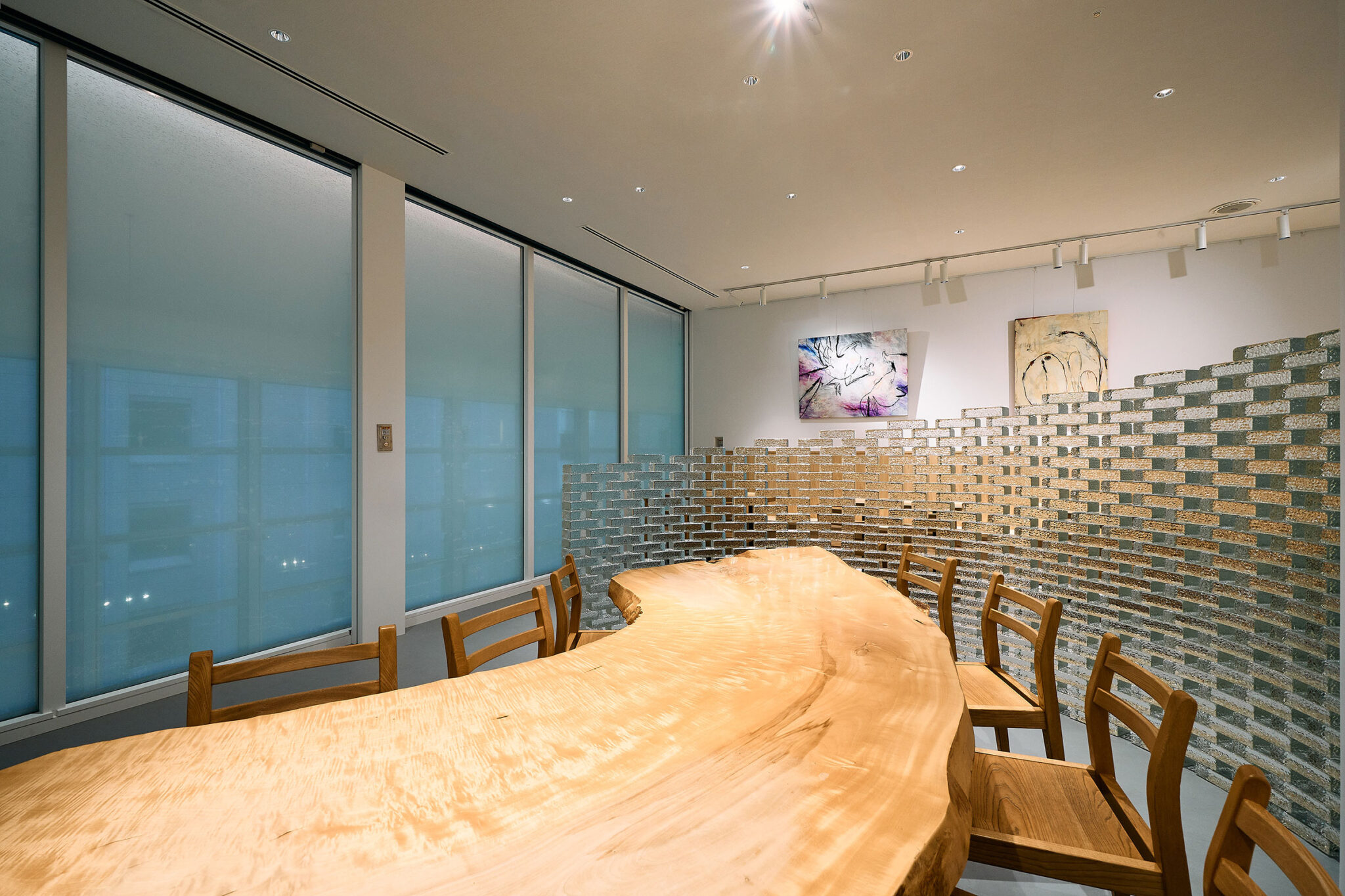 さらにガラスブロックに施された岩肌や水面のような模様が接着部分を見えづらくするとともに、お濠の風景を想起させながら彫刻のように角度によって見え方が変わることで、アートの一部であるかのように空間に溶け込む間仕切りとなった。