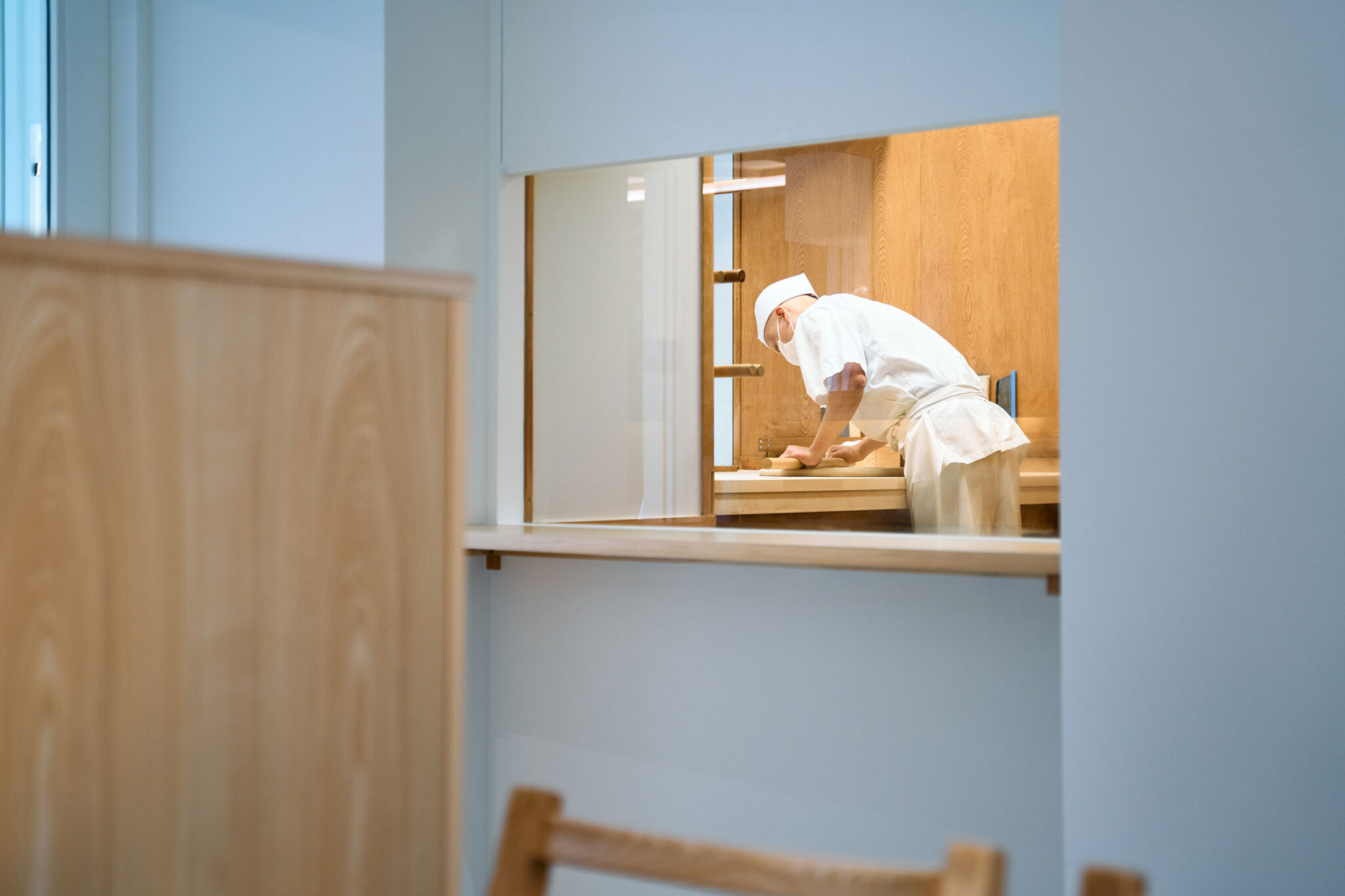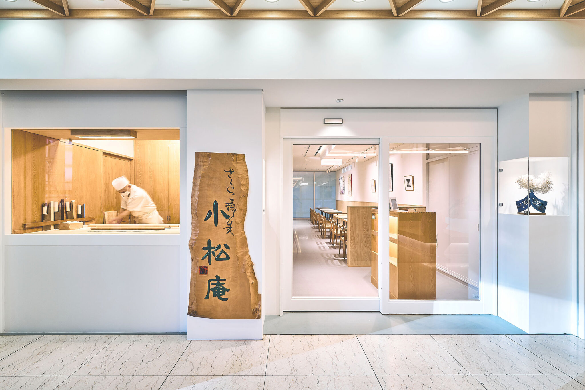 一目で店舗のコンセプトが伝わるよう、職人の蕎麦打ちが見られるショーウィンドウや木の看板と横並びでアートを展示するためのショーケースを新設し、それらが鮮やかに浮かび上がるよう、周囲の造形を整えた上で白く上塗りした。