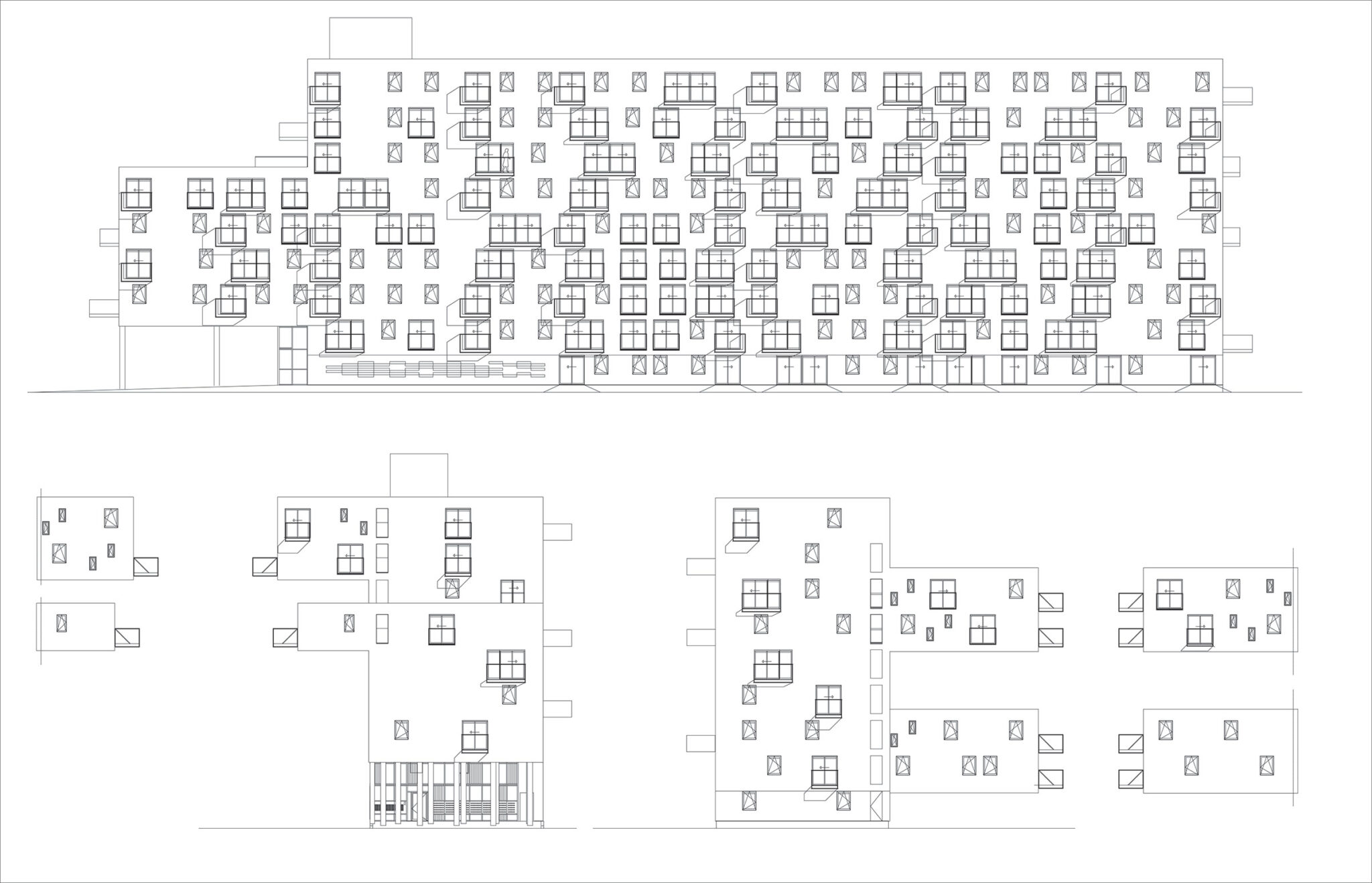 To still provide an adequate degree of sunlight penetrate the rooms, only 87 of the 100 units could be accommodated within the block. Where could the remaining 13 dwellings be positioned? If they were put elsewhere on the site, the open space would have been further reduced. By ‘cantilevering’ the remaining 13 units from the north facade, they are literally suspended in the air. The hanging East-West orientated types complete the North-South dwellings in the block with a view over the adjacent polder. By hanging the extra units on the north facade, the ground plane is kept as open and green as possible. A prototypic increase in density for the garden cities was achieved.