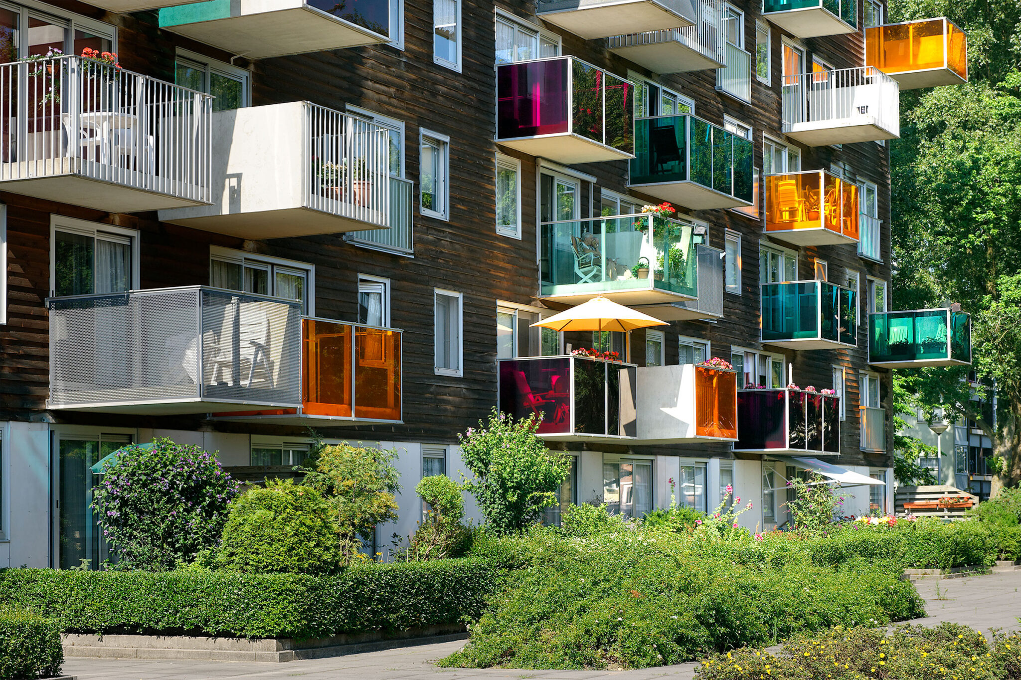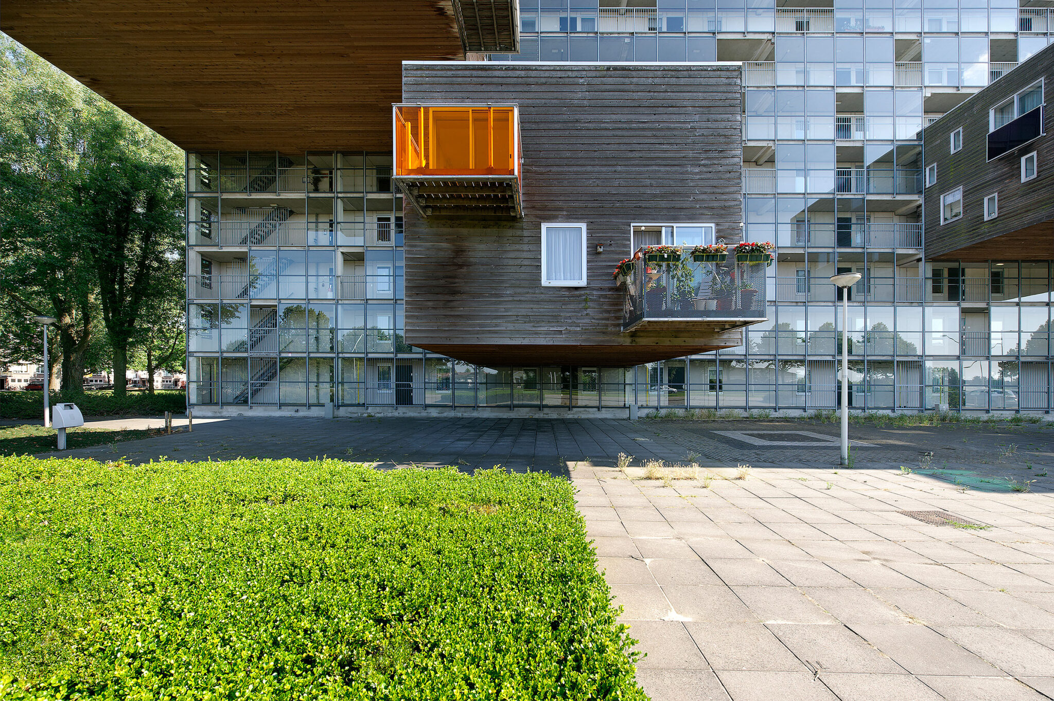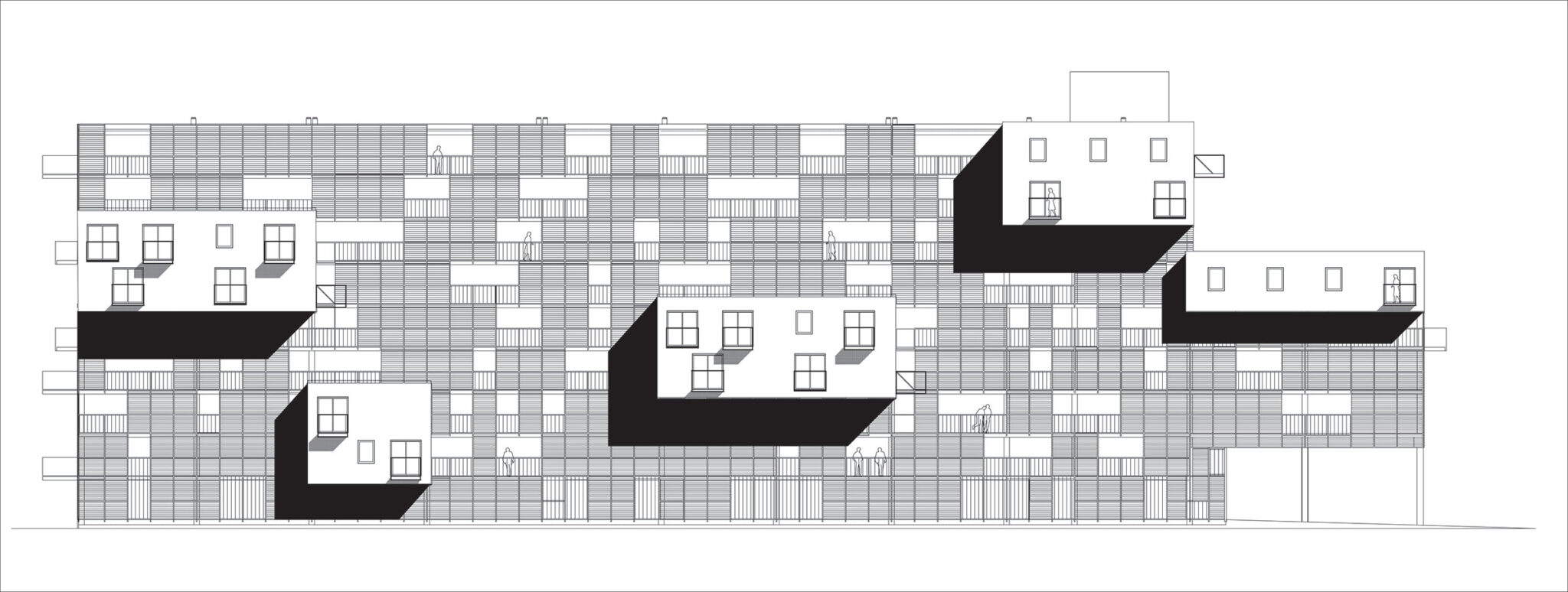部屋に十分な日光が差し込むようにするため、100戸のうち87戸しかそのブロック内に収容することができませんでした。残りの13戸はどこに配置できるのでしょうか? もしそれらが敷地内の別の場所に配置されていたら、オープンスペースはさらに減少していたでしょう。残りの13戸を北側ファサードから「片持ち梁式」に張り出すことで、それらは文字通り空中に浮かぶ形になっています。東西方向の吊り下げ式の住戸群が、隣接するポルダーを見渡す眺望とともに、ブロック内の南北方向の住戸群を補完しています。追加の住戸を北側ファサードに吊り下げることで、地面部分は可能な限り開放的で緑豊かな状態に保たれています。ガーデンシティにおいて、プロトタイプ的な密度の増加が実現されました。