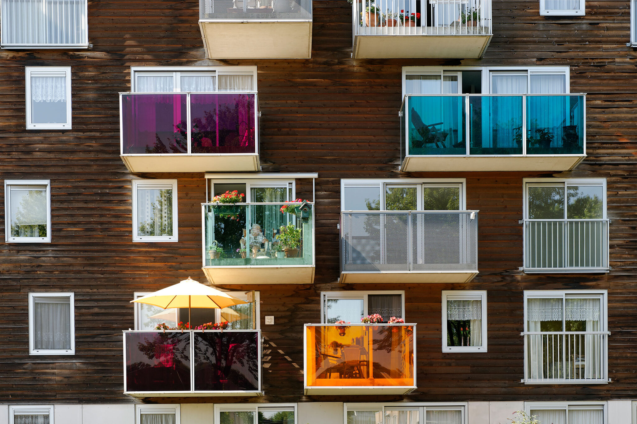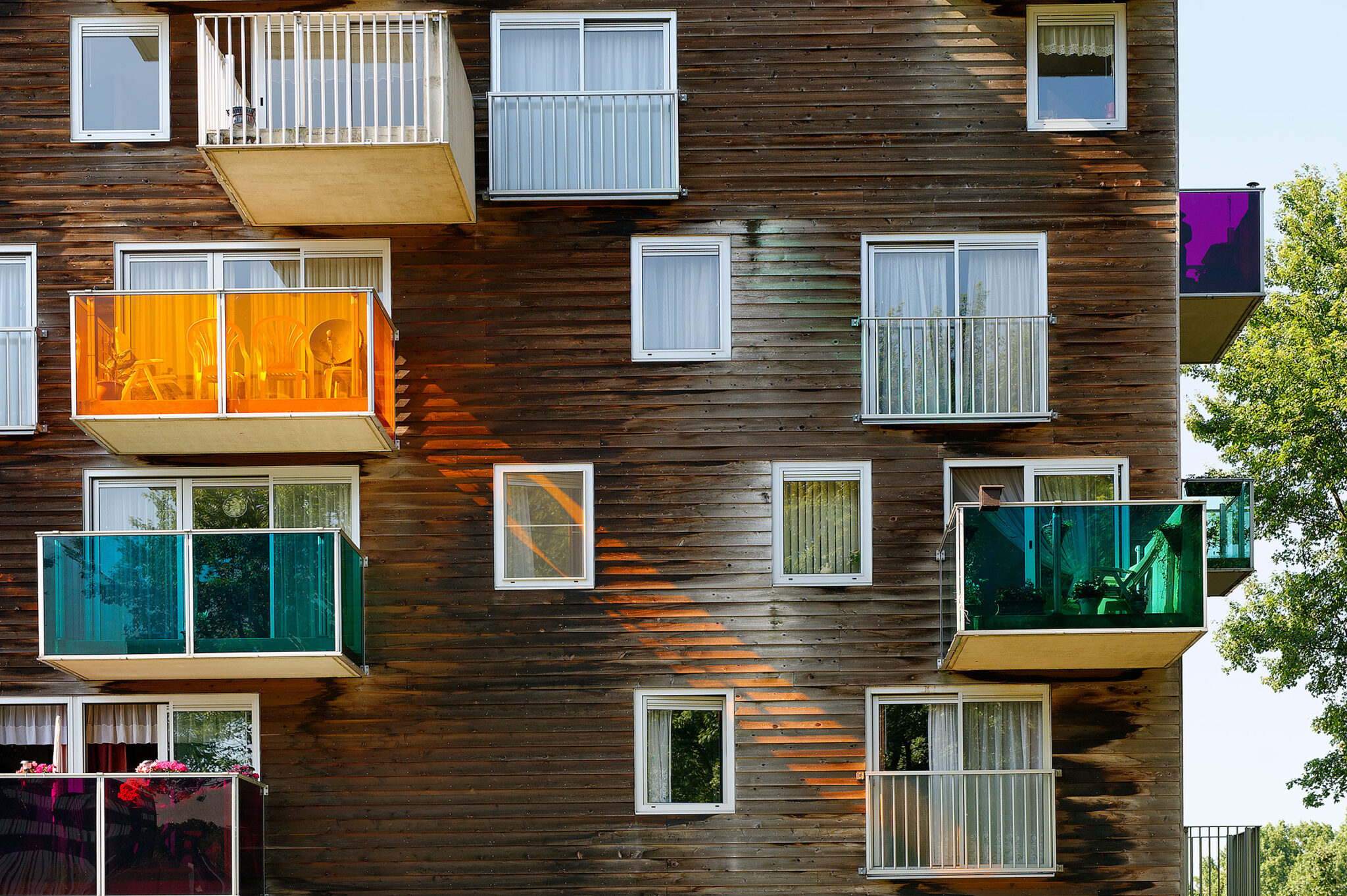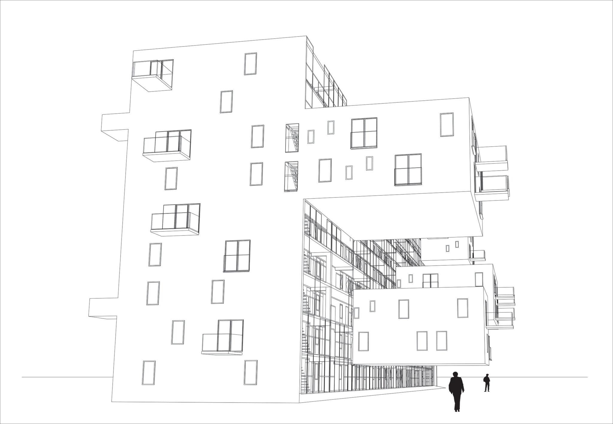 部屋に十分な日光が差し込むようにするため、100戸のうち87戸しかそのブロック内に収容することができませんでした。残りの13戸はどこに配置できるのでしょうか? もしそれらが敷地内の別の場所に配置されていたら、オープンスペースはさらに減少していたでしょう。残りの13戸を北側ファサードから「片持ち梁式」に張り出すことで、それらは文字通り空中に浮かぶ形になっています。東西方向の吊り下げ式の住戸群が、隣接するポルダーを見渡す眺望とともに、ブロック内の南北方向の住戸群を補完しています。追加の住戸を北側ファサードに吊り下げることで、地面部分は可能な限り開放的で緑豊かな状態に保たれています。ガーデンシティにおいて、プロトタイプ的な密度の増加が実現されました。