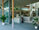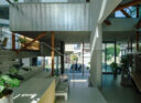 Eureka・早田大高事務所・佐野研究室による、さいたま市の「ブルー・ボックス・オフィス」。北向きで隣地と高低差もある敷地。“明るい空間”を求め、1階を“地域に開かれた空間”として全面開放すると共に2階の高窓からの光を内部で拡散させる建築を考案。極力壁を設けず“一体的な使用”も可能にする1階、ポーチからエントランス越しにキッチンを見る。 photo©Ookura Hideki