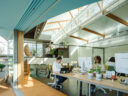Eureka・早田大高事務所・佐野研究室による、さいたま市の「ブルー・ボックス・オフィス」。北向きで隣地と高低差もある敷地。“明るい空間”を求め、1階を“地域に開かれた空間”として全面開放すると共に2階の高窓からの光を内部で拡散させる建築を考案。極力壁を設けず“一体的な使用”も可能にする2階、西側の事務室から北側の事務室を見る。 photo©Ookura Hideki