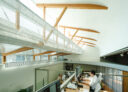 具体的には、屋根頂部の長手方向に鉄骨を木材で補剛したトラス梁を架け、トラス梁の側面から自然光を取り入れています。トラス梁から差し込んだ光をパンチングメタル製のライトシェルフが天井面へ反射し、室内全体に光が拡散されるようにしました。