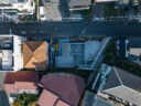 Eureka・早田大高事務所・佐野研究室による、さいたま市の「ブルー・ボックス・オフィス」。北向きで隣地と高低差もある敷地。“明るい空間”を求め、1階を“地域に開かれた空間”として全面開放すると共に2階の高窓からの光を内部で拡散させる建築を考案。極力壁を設けず“一体的な使用”も可能にする施工中の様子、敷地上空から見下ろす。 photo©Ookura Hideki