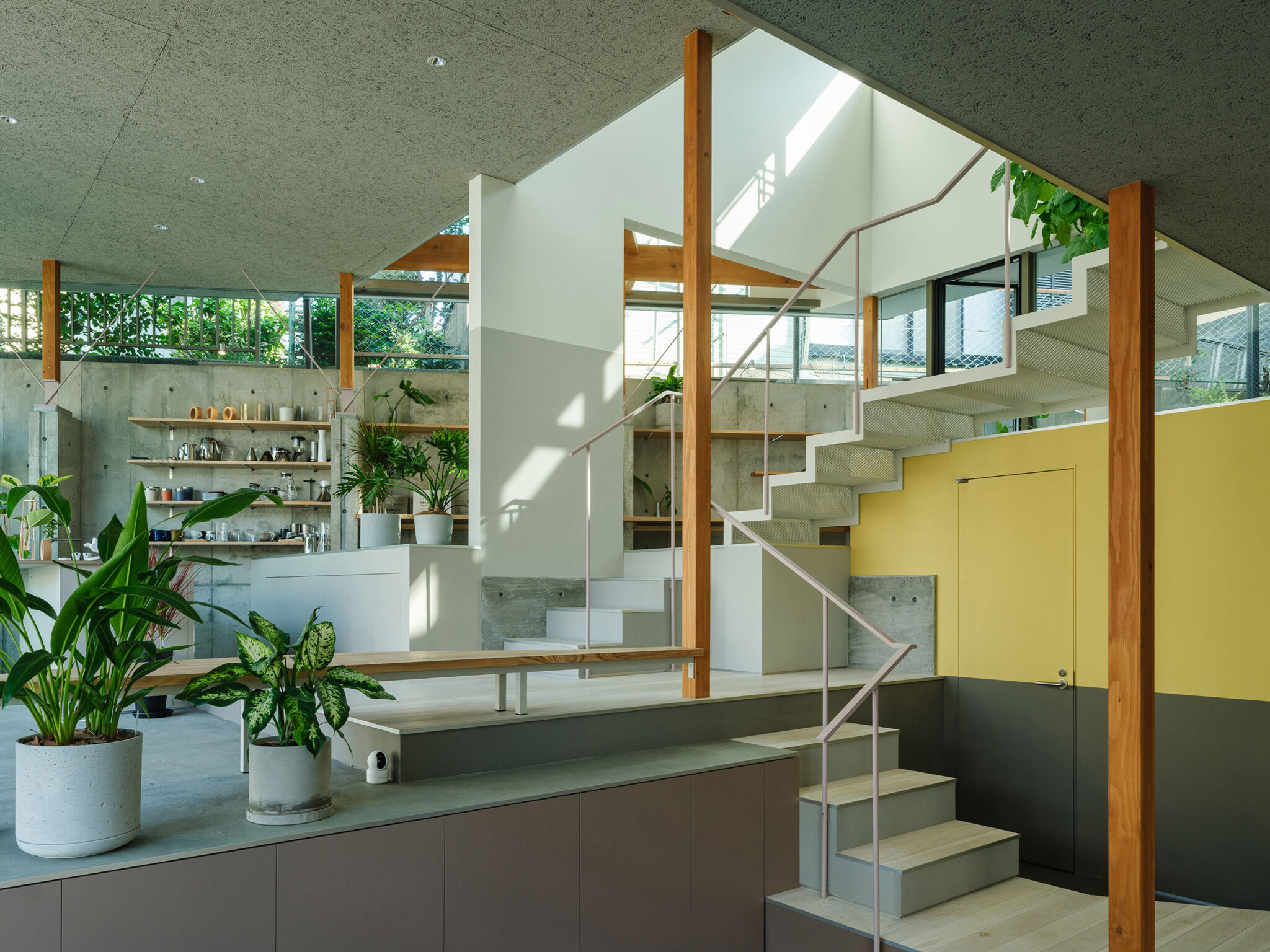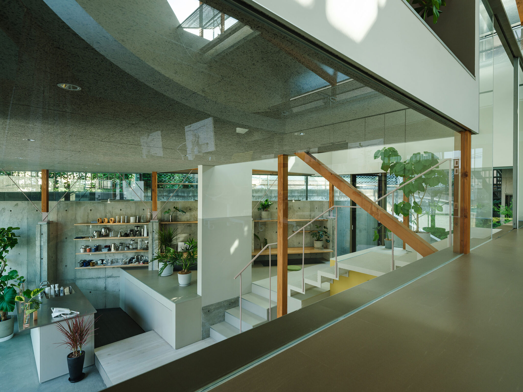 北向きで隣地と高低差もある敷地での計画です。建築家は、“明るい空間”を求め、1階を“地域に開かれた空間”として全面開放すると共に2階の高窓からの光を内部で拡散させる建築を考案しました。また、極力壁を設けず“一体的な使用”も可能にしています。