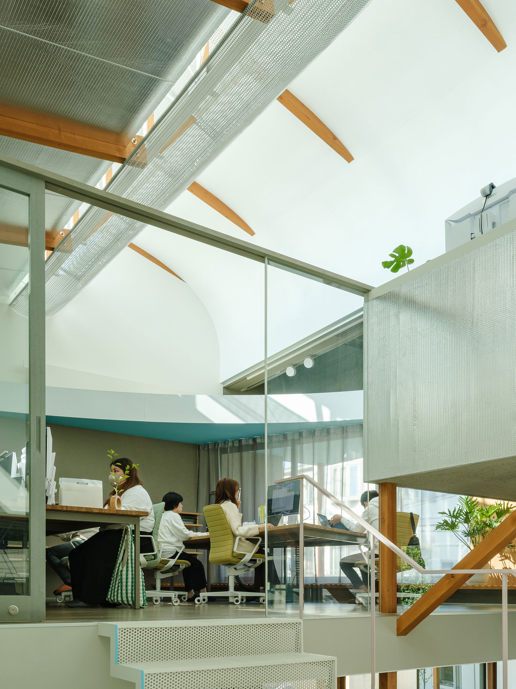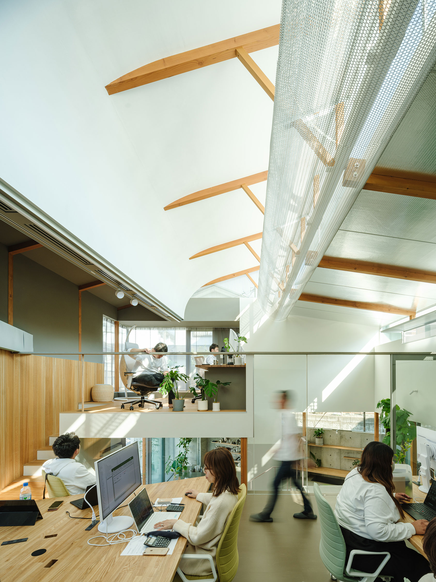 Eureka・早田大高事務所・佐野研究室による、さいたま市の「ブルー・ボックス・オフィス」。北向きで隣地と高低差もある敷地。“明るい空間”を求め、1階を“地域に開かれた空間”として全面開放すると共に2階の高窓からの光を内部で拡散させる建築を考案。極力壁を設けず“一体的な使用”も可能にする2階、西側の事務室から北側の事務室を見る。 photo©Ookura Hideki