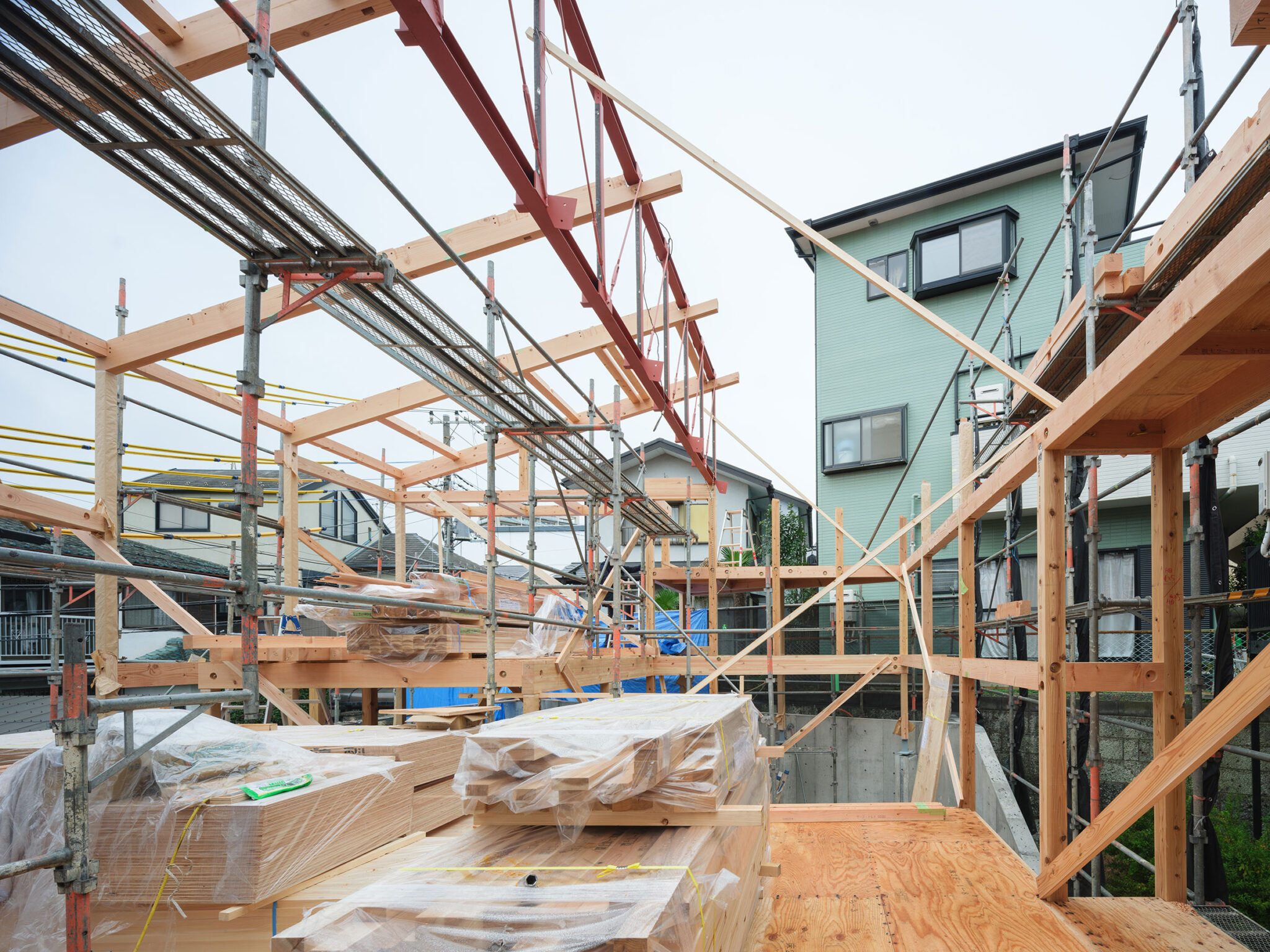 Eureka・早田大高事務所・佐野研究室による、さいたま市の「ブルー・ボックス・オフィス」。北向きで隣地と高低差もある敷地。“明るい空間”を求め、1階を“地域に開かれた空間”として全面開放すると共に2階の高窓からの光を内部で拡散させる建築を考案。極力壁を設けず“一体的な使用”も可能にする施工中の様子、建て方 photo©Ookura Hideki