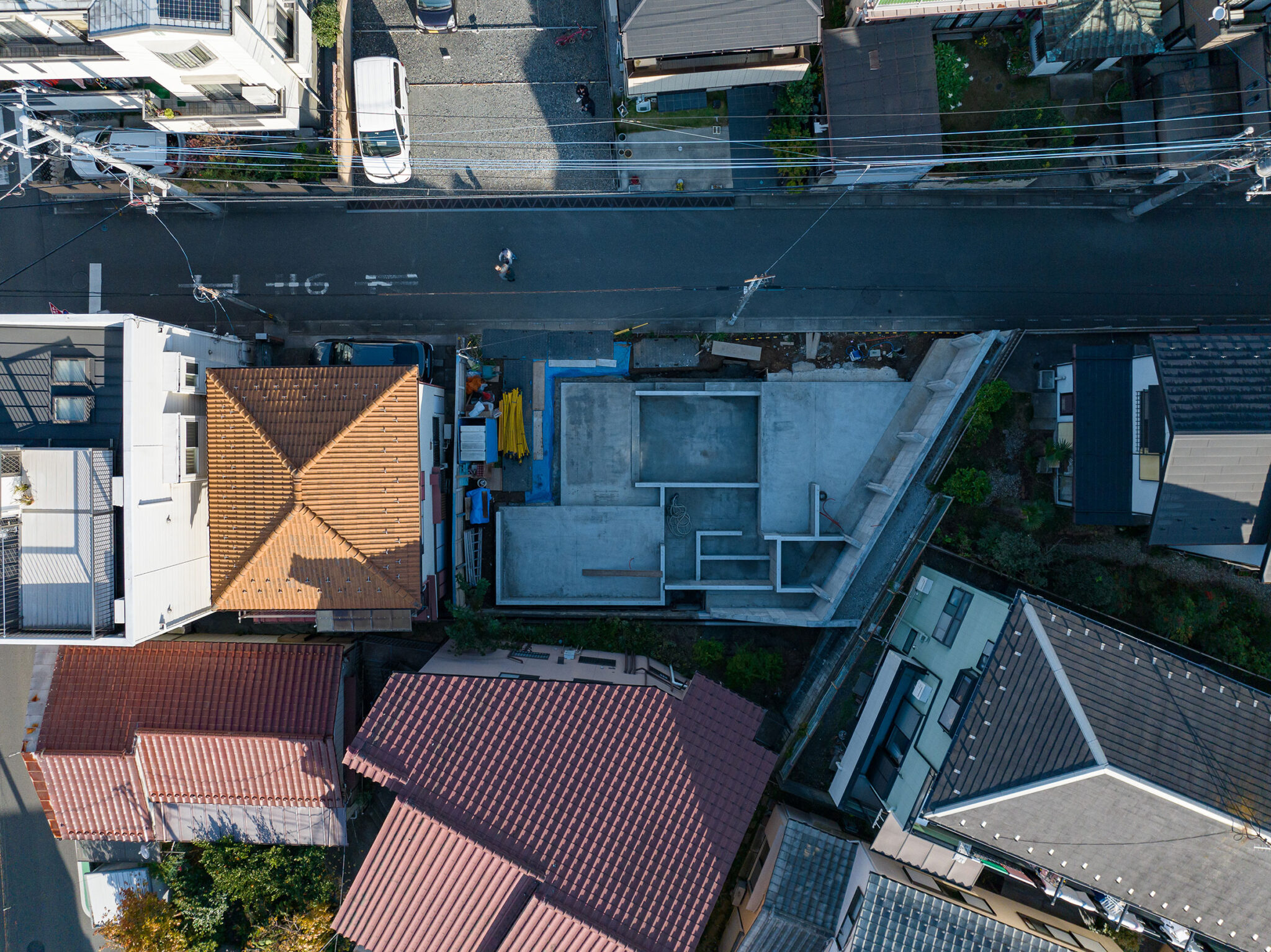 Eureka・早田大高事務所・佐野研究室による、さいたま市の「ブルー・ボックス・オフィス」。北向きで隣地と高低差もある敷地。“明るい空間”を求め、1階を“地域に開かれた空間”として全面開放すると共に2階の高窓からの光を内部で拡散させる建築を考案。極力壁を設けず“一体的な使用”も可能にする施工中の様子、敷地上空から見下ろす。 photo©Ookura Hideki