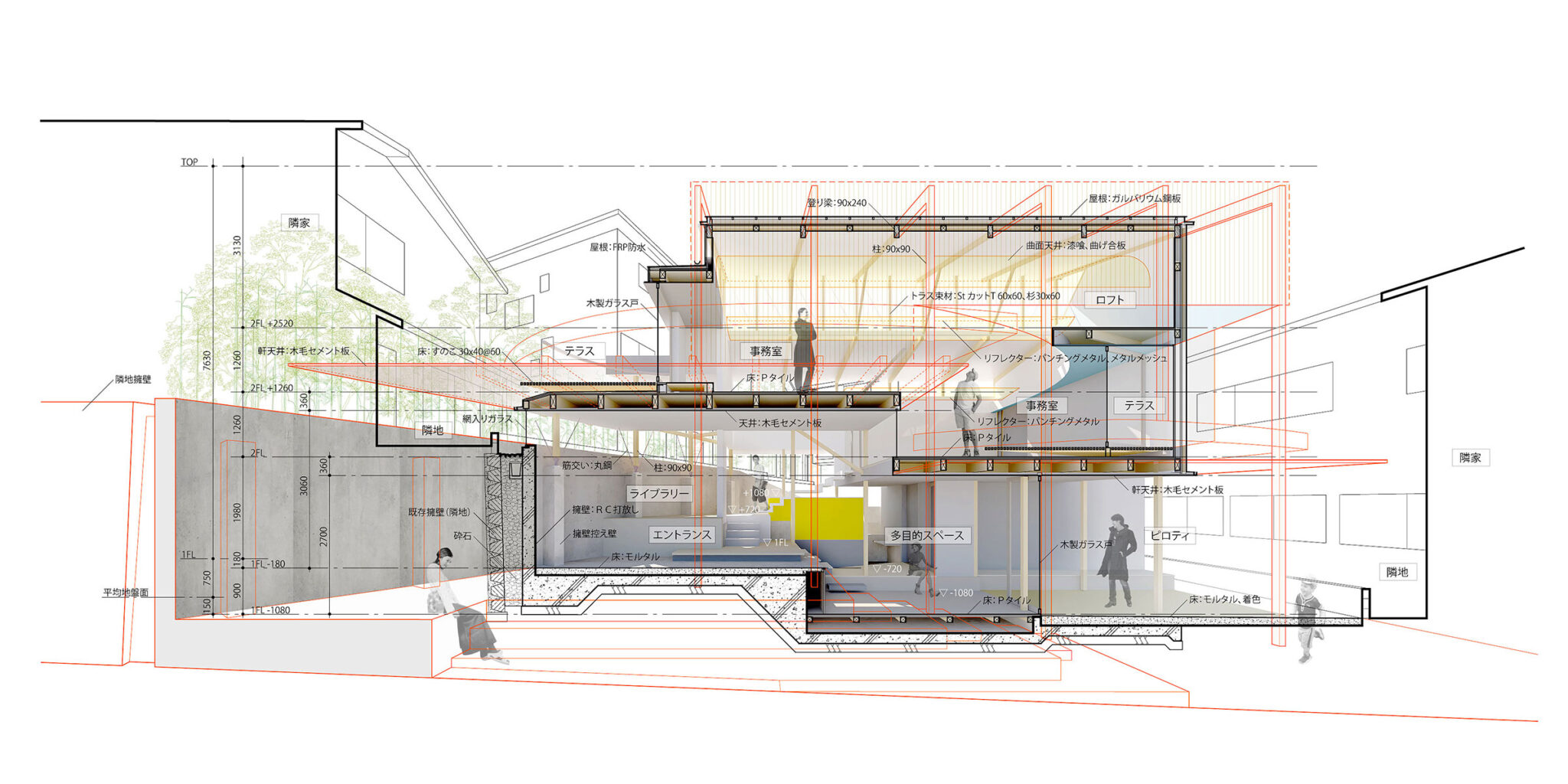 Eureka・早田大高事務所・佐野研究室による、さいたま市の「ブルー・ボックス・オフィス」。北向きで隣地と高低差もある敷地。“明るい空間”を求め、1階を“地域に開かれた空間”として全面開放すると共に2階の高窓からの光を内部で拡散させる建築を考案。極力壁を設けず“一体的な使用”も可能にする断面図 image©Eureka+早田大高設計事務所+慶応大学佐野研究室