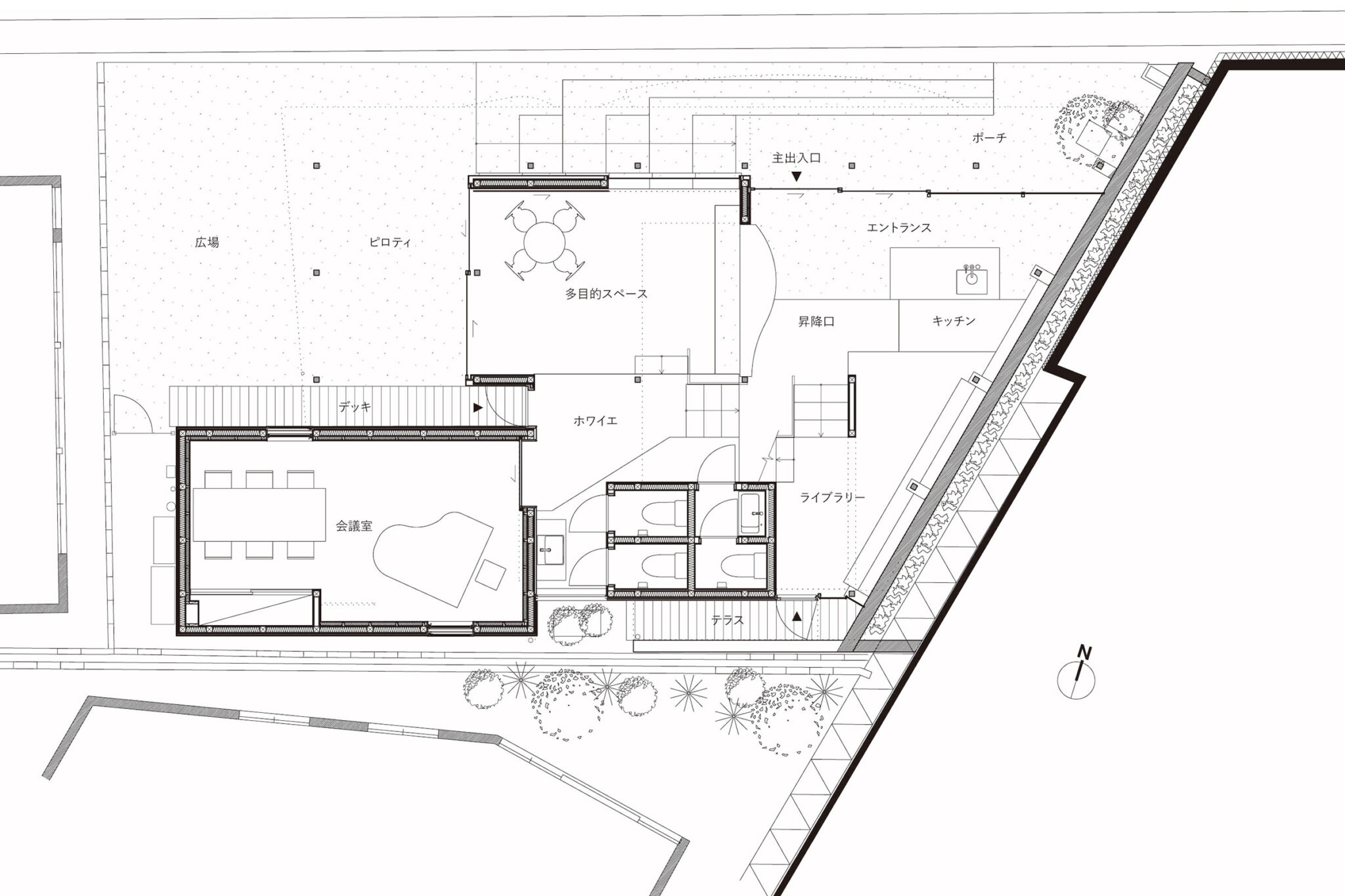 Eureka・早田大高事務所・佐野研究室による、さいたま市の「ブルー・ボックス・オフィス」。北向きで隣地と高低差もある敷地。“明るい空間”を求め、1階を“地域に開かれた空間”として全面開放すると共に2階の高窓からの光を内部で拡散させる建築を考案。極力壁を設けず“一体的な使用”も可能にする1階平面図 image©Eureka+早田大高設計事務所+慶応大学佐野研究室