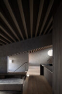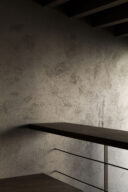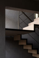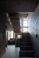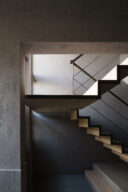 森田悠紀建築設計事務所による、東京の「上目黒の家」。往来のある緑道に面した敷地。内外の“適切な関係”の構築を求め、壁柱を並べて“視線の抜けを確保”しつつ“外からの斜めの視線を遮る”建築を考案。土地の様々な条件に応えた末に“回廊の様な空間”が立上がる1階から2階への階段 photo©西川公朗