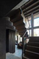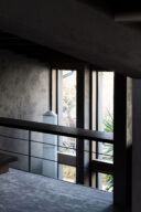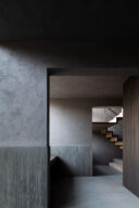 森田悠紀建築設計事務所による、東京の「上目黒の家」。往来のある緑道に面した敷地。内外の“適切な関係”の構築を求め、壁柱を並べて“視線の抜けを確保”しつつ“外からの斜めの視線を遮る”建築を考案。土地の様々な条件に応えた末に“回廊の様な空間”が立上がる1階、書斎から2階への階段を見る。 photo©西川公朗