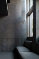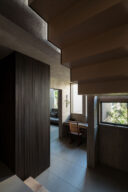 森田悠紀建築設計事務所による、東京の「上目黒の家」。往来のある緑道に面した敷地。内外の“適切な関係”の構築を求め、壁柱を並べて“視線の抜けを確保”しつつ“外からの斜めの視線を遮る”建築を考案。土地の様々な条件に応えた末に“回廊の様な空間”が立上がる1階、書斎 photo©西川公朗